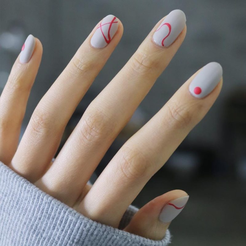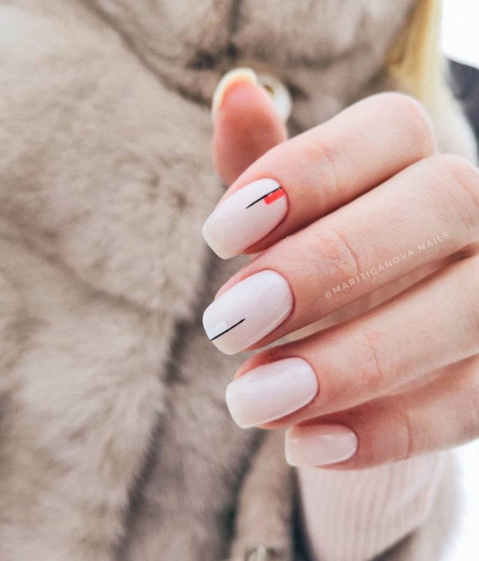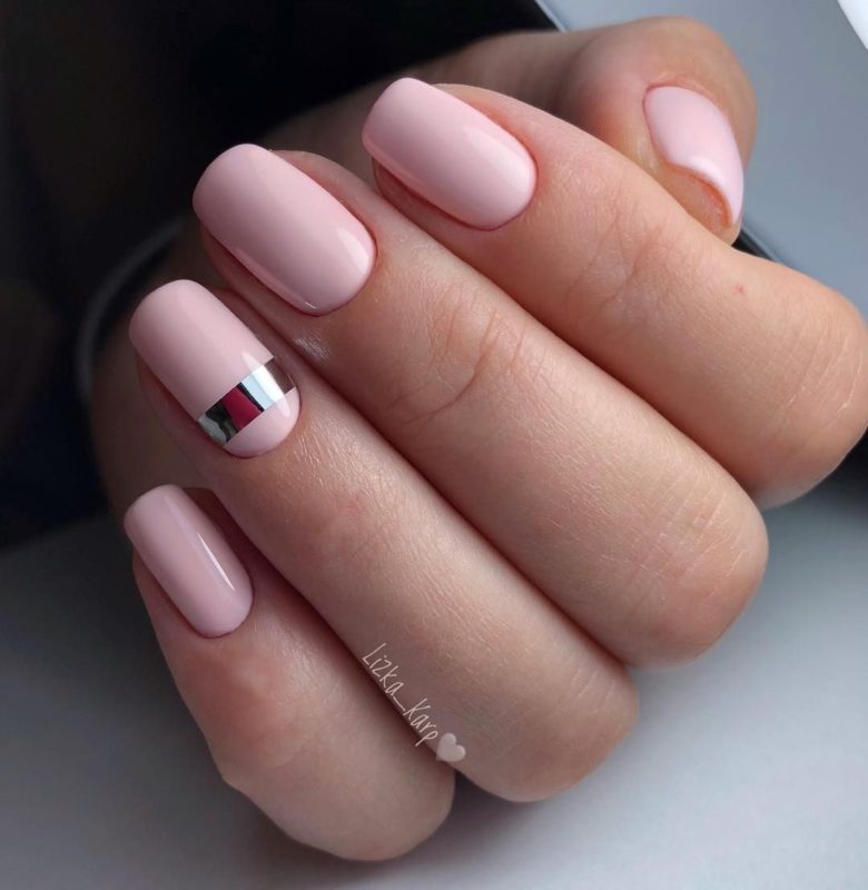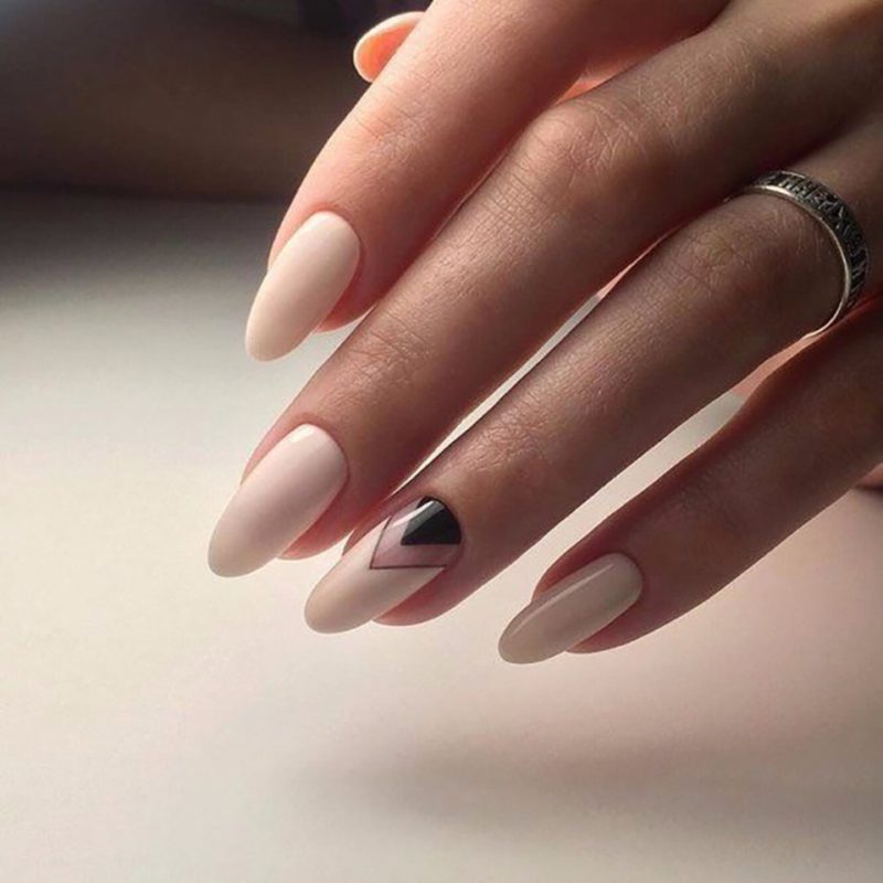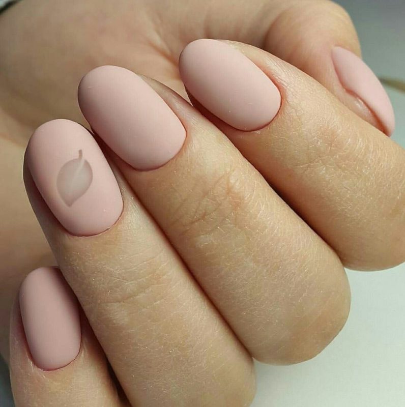 Короткие ноготки в офис — беспроигрышный вариант. Оптимальное решение — однотонный маникюр, например, с матовым покрытием. Если хочется небольшого разнообразия, выделите ноготь геометрией, стразами или негативным пространством.