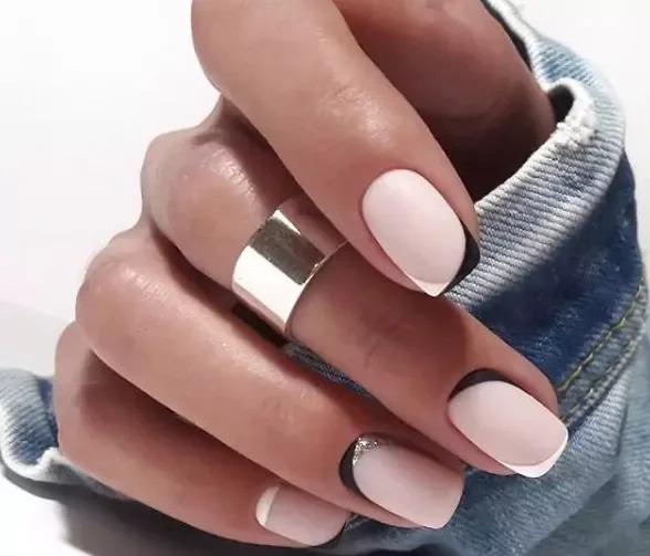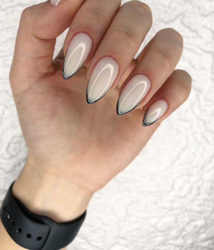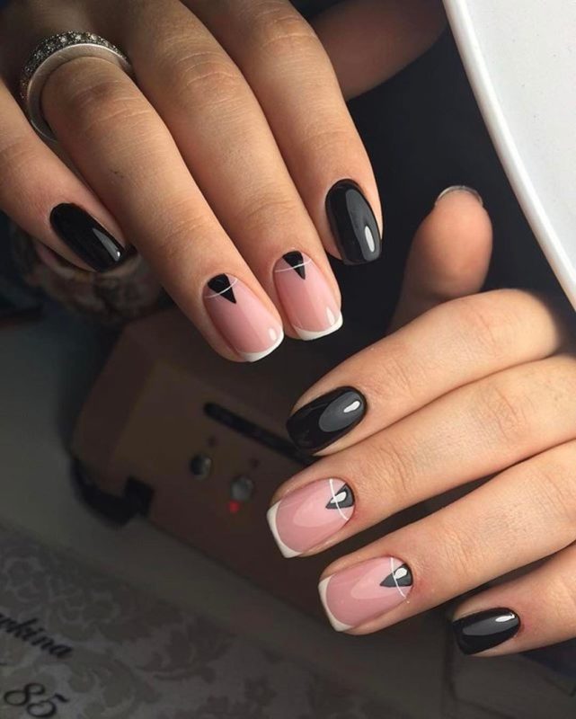 Думаете френч — это скучный и устаревший декор? Вы не правы. Современный френч может быть очень разнообразным. Даже для офиса. Просто замените привычную прозрачную базу на серую и он заиграет новыми красками. Френч может быть и черным. Причем вы можете сделать черную матовую основу, а улыбку сделать так же черную, но уже глянцевую.