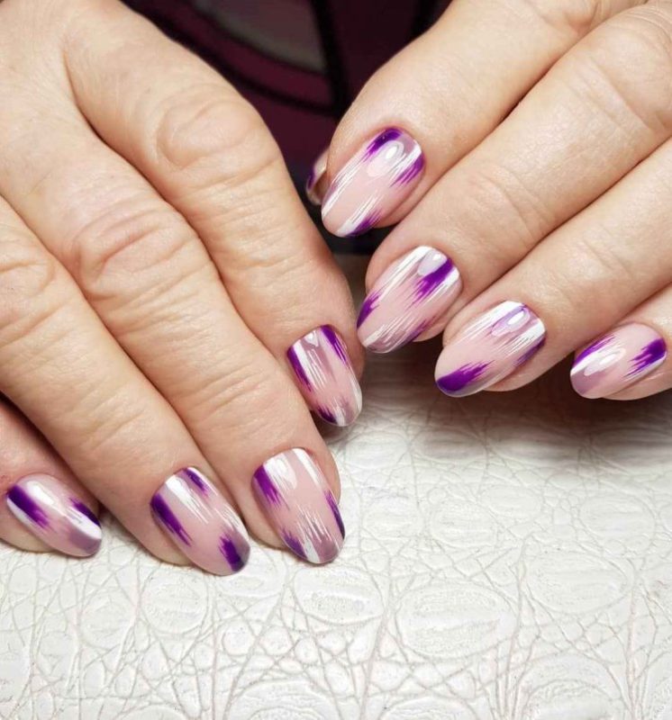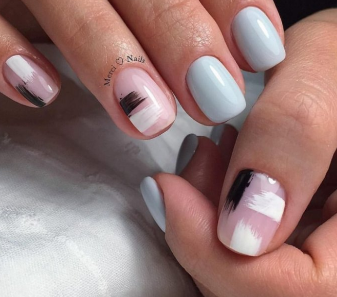 Мазки кистью в маникюре для офиса — отличная возможность использовать сразу несколько цветов. Обычно они наносятся на прозрачную основу, но могут быть нарисованы и на цветной. Главное — тщательно подобрать оттенки лака. Маникюр для офиса не должен получиться кричащим и вульгарным. Иногда достаточно всего одного мазка на ногте, чтобы получился стильный элегантный маникюр в офис.