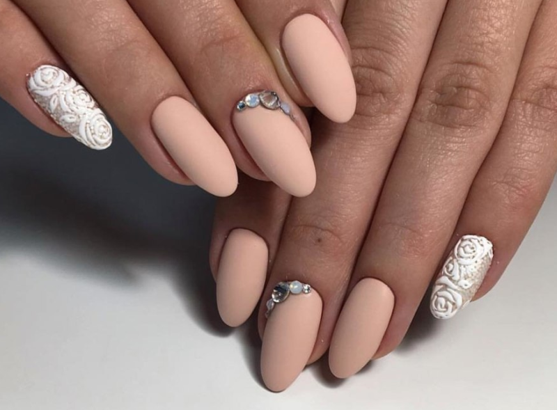 Классическое нюдовое покрытие многим покажется скучным. для офиса вы можете разбавить его просто оформив один ноготь контрастным ярким лаком или втиркой. На ногтях можно нарисовать рисунок или выложить узор стразами.