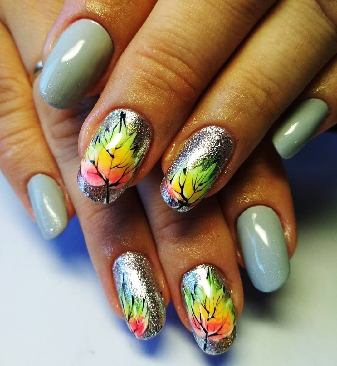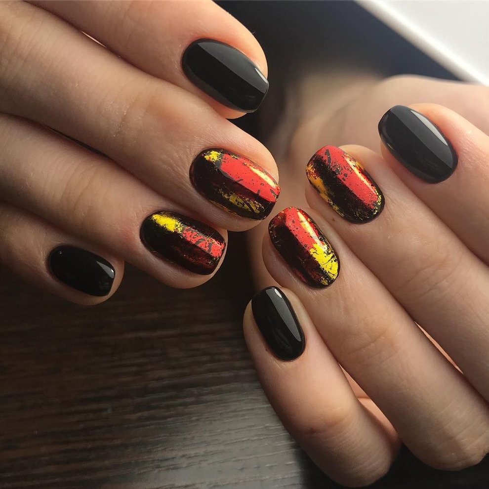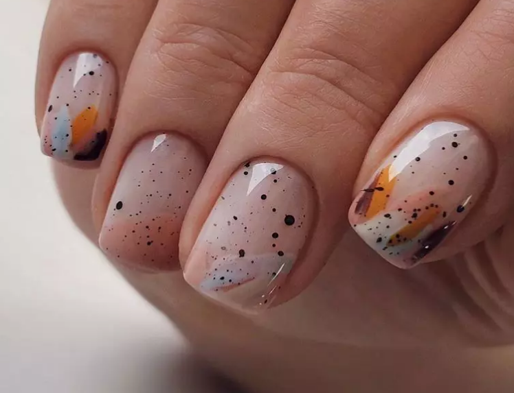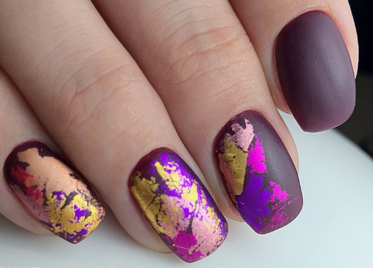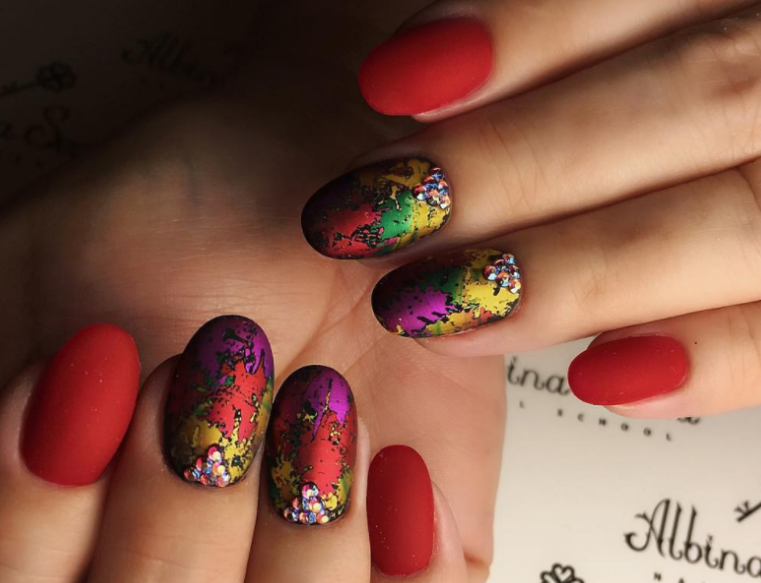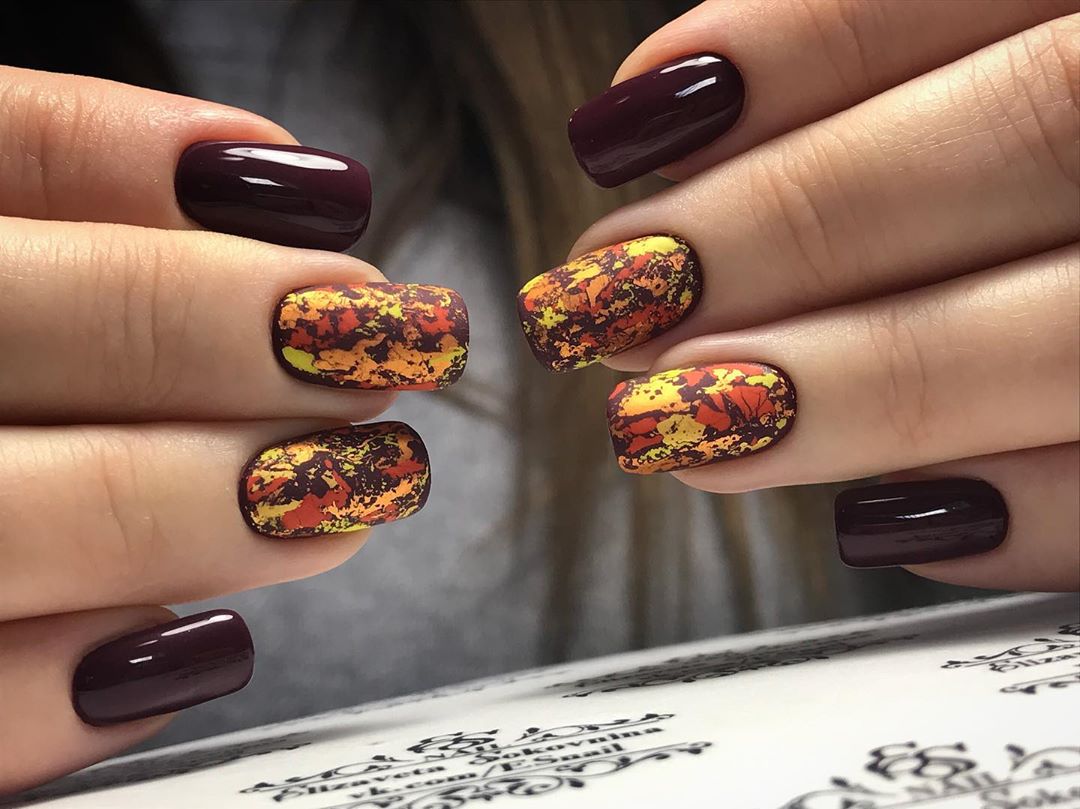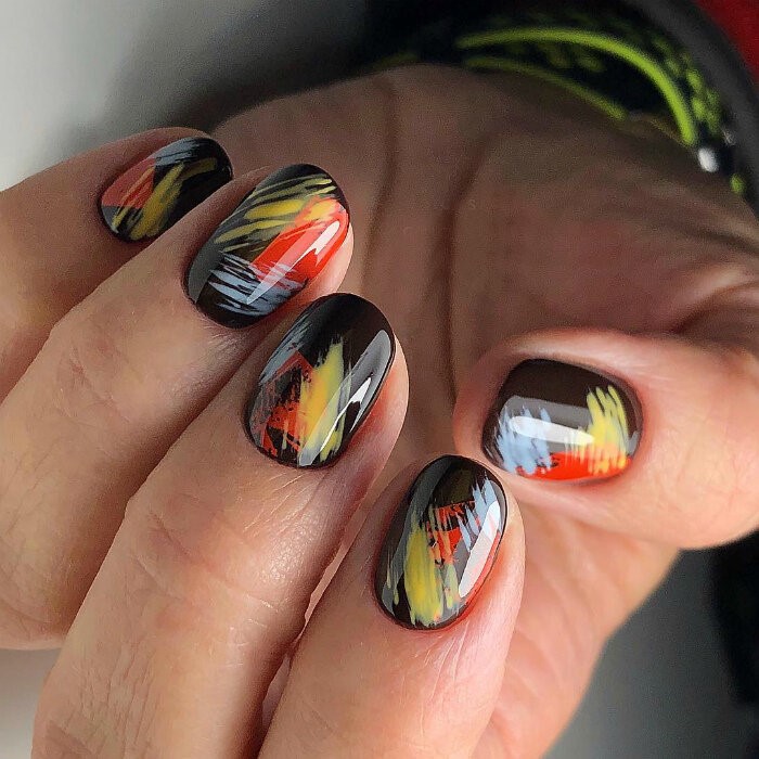 Если посмотреть осенью вокруг себя, можно увидеть удивительное буйство красок. Почему бы не повторить его в маникюре? Выбирайте базовый набор лаков и наносите их в произвольном порядке. Мазки краски можно заменить брызгами. Вам не нужно соблюдать четких правил — творите на свой вкус или доверьтесь мастеру. Таким образом можно оформить все ноготки или всего один или два на руке.