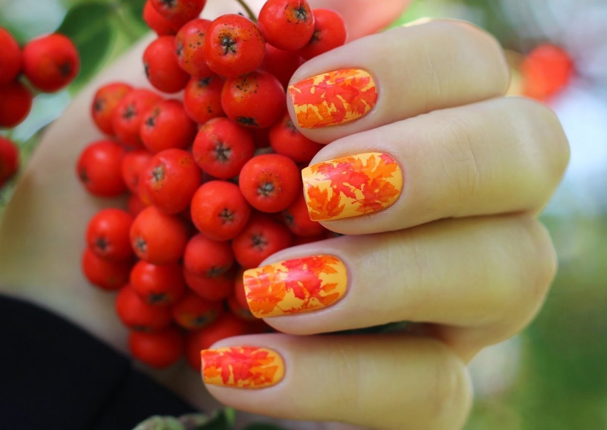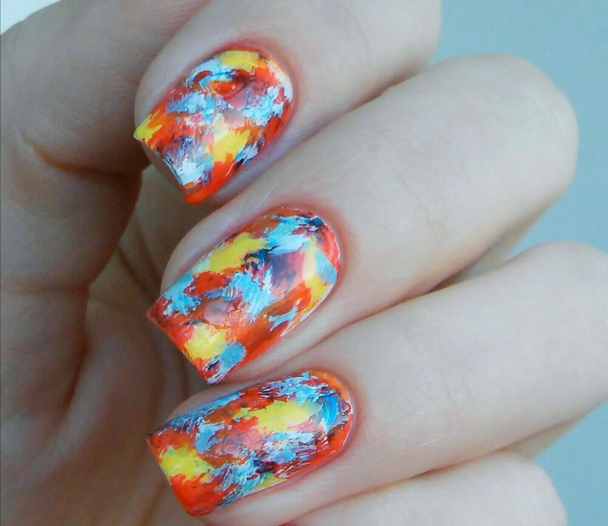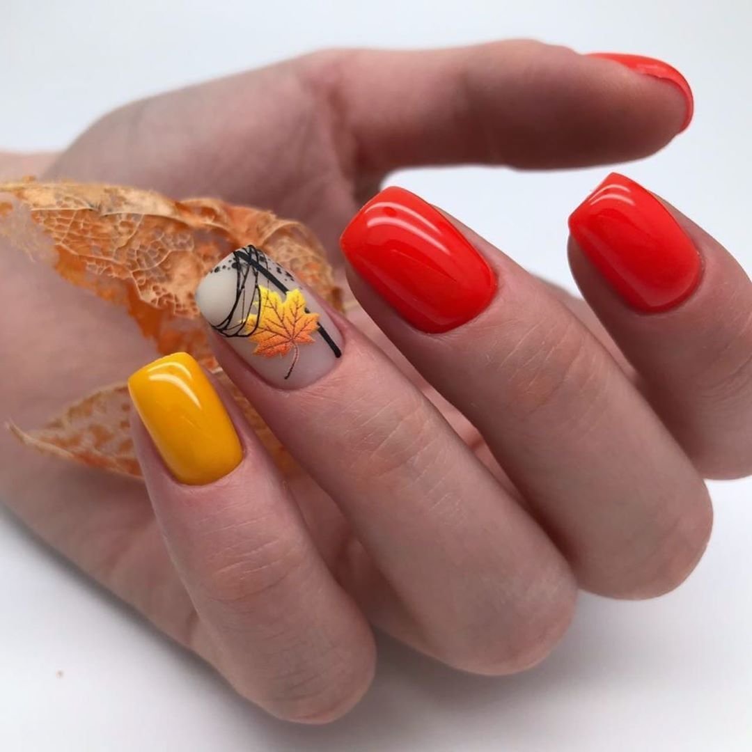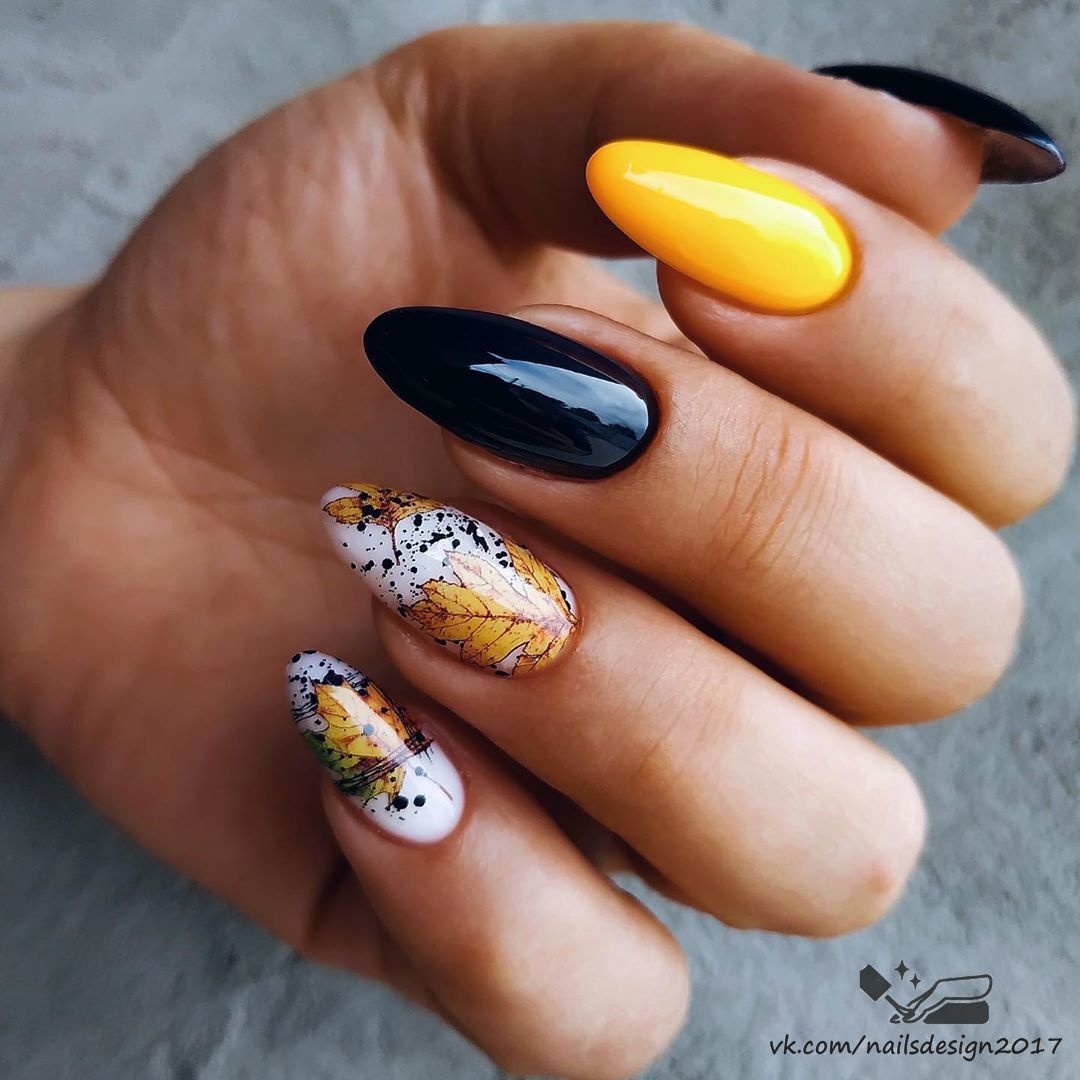 Если посмотреть осенью вокруг себя, можно увидеть удивительное буйство красок. Почему бы не повторить его в маникюре? Выбирайте базовый набор лаков и наносите их в произвольном порядке. Мазки краски можно заменить брызгами. Вам не нужно соблюдать четких правил — творите на свой вкус или доверьтесь мастеру. Таким образом можно оформить все ноготки или всего один или два на руке.