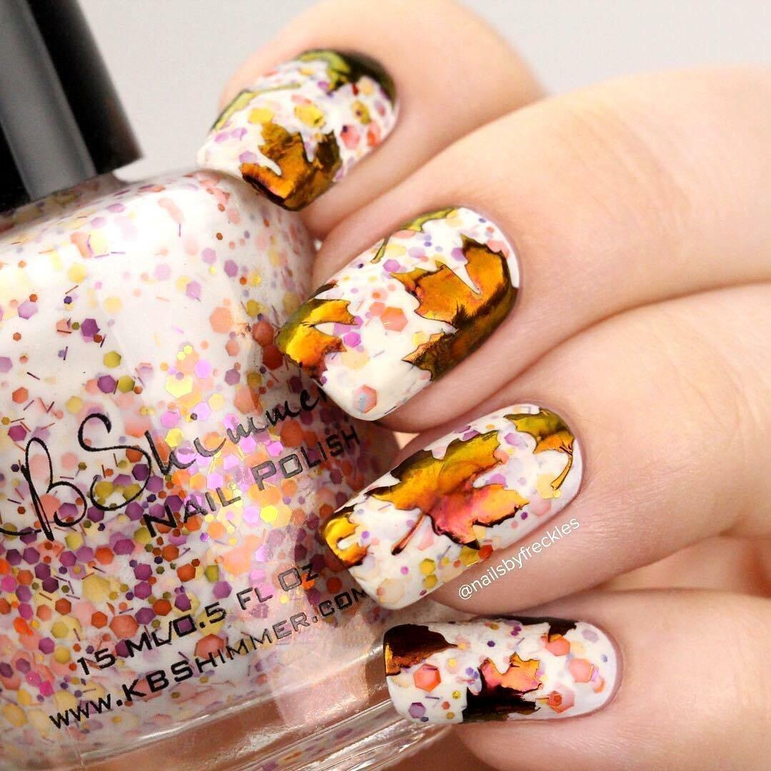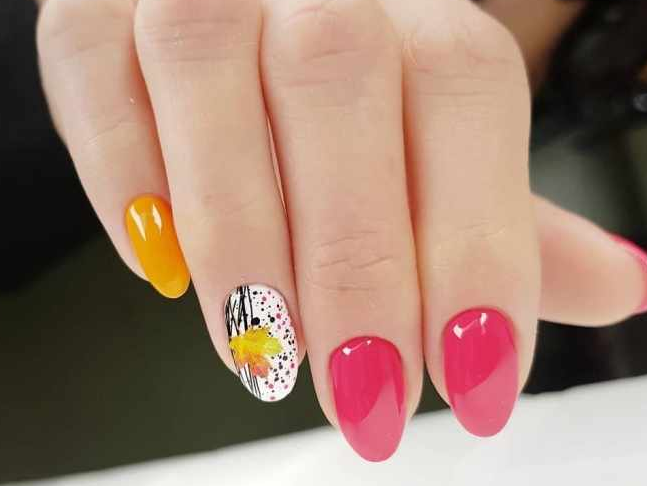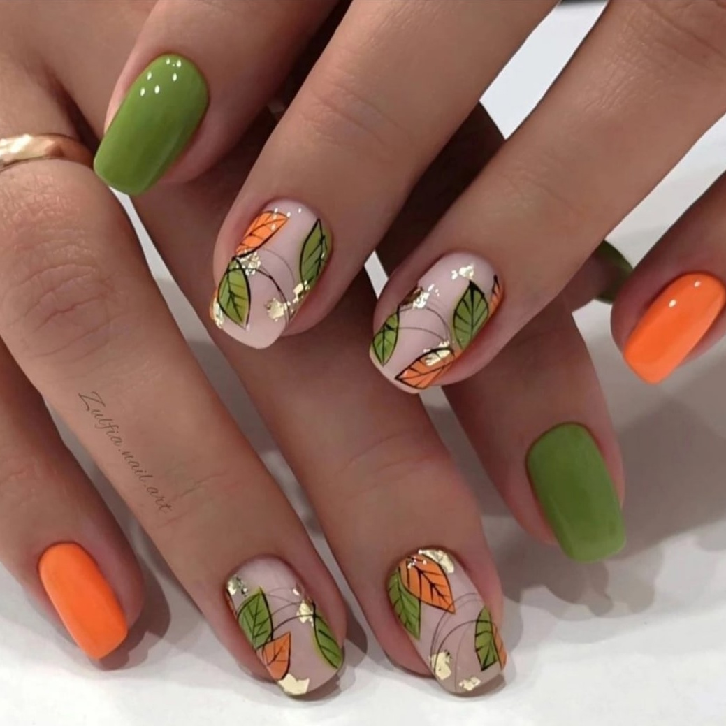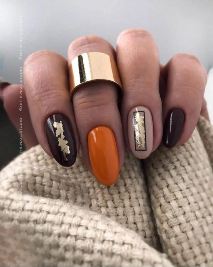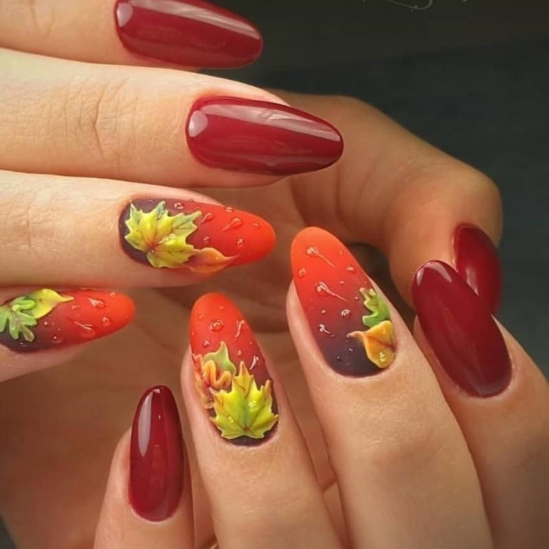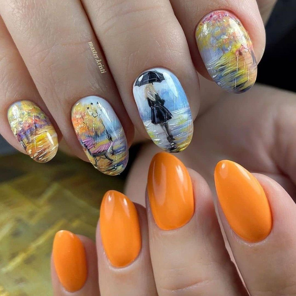 Если посмотреть осенью вокруг себя, можно увидеть удивительное буйство красок. Почему бы не повторить его в маникюре? Выбирайте базовый набор лаков и наносите их в произвольном порядке. Мазки краски можно заменить брызгами. Вам не нужно соблюдать четких правил — творите на свой вкус или доверьтесь мастеру. Таким образом можно оформить все ноготки или всего один или два на руке.