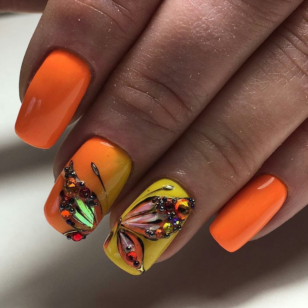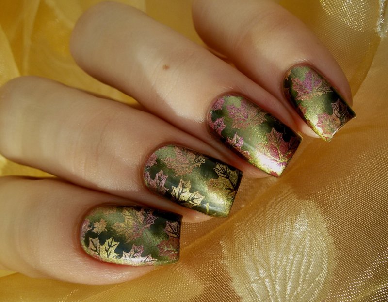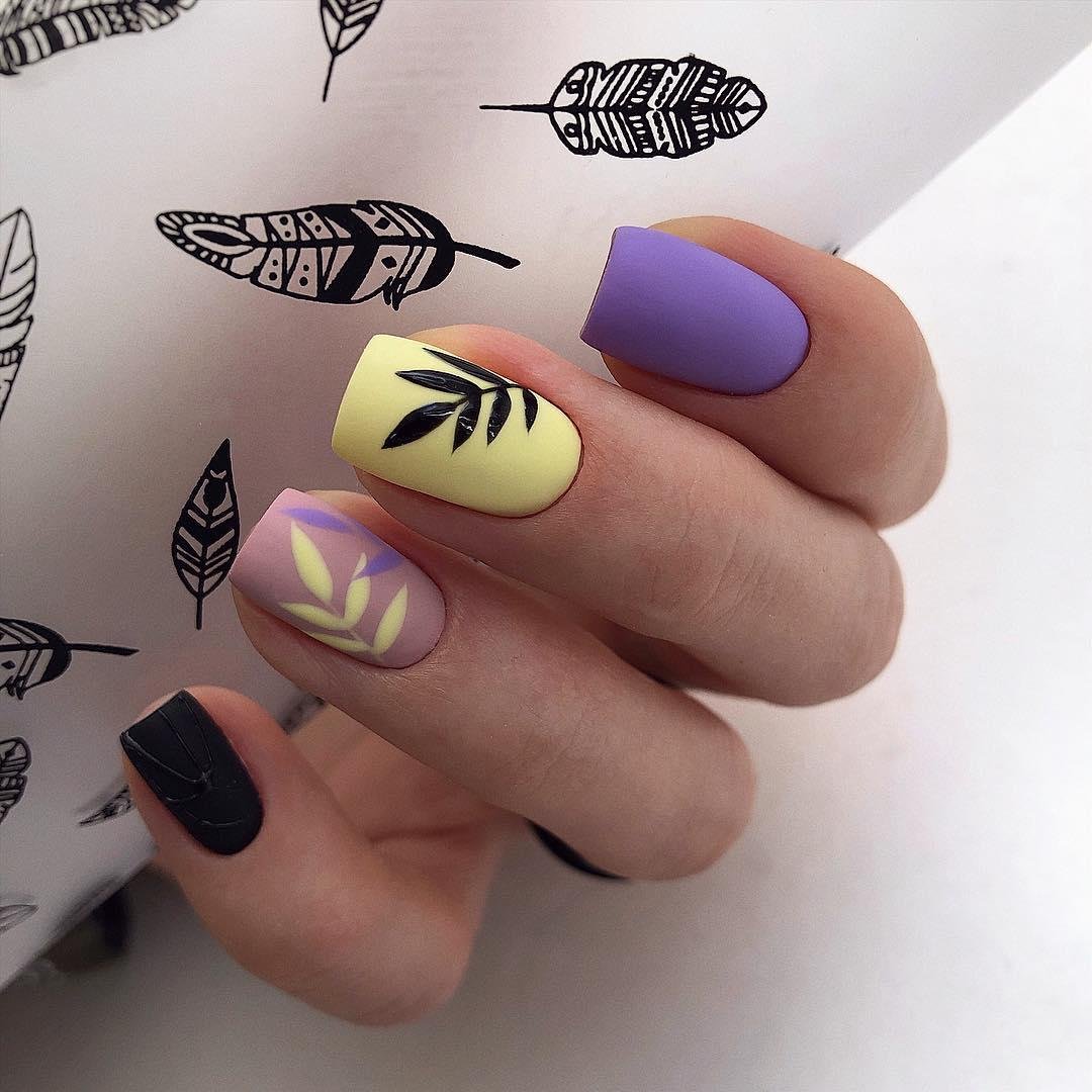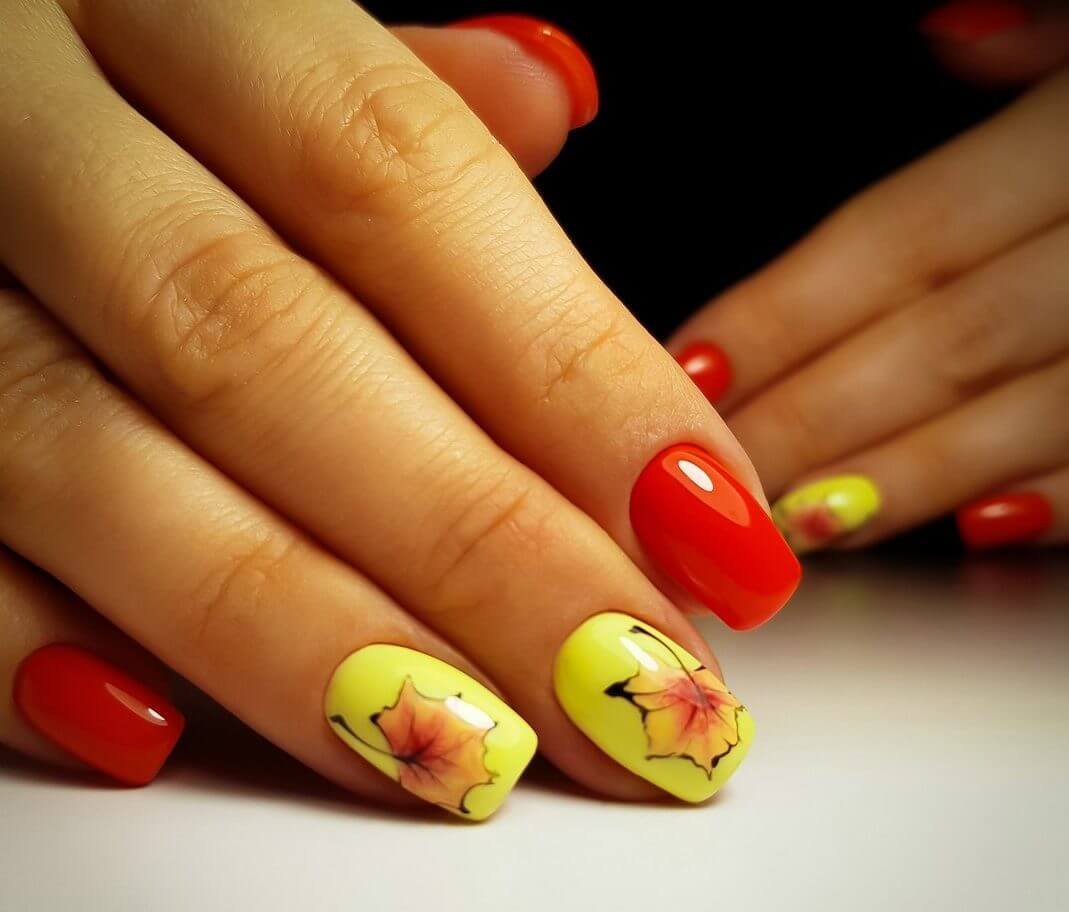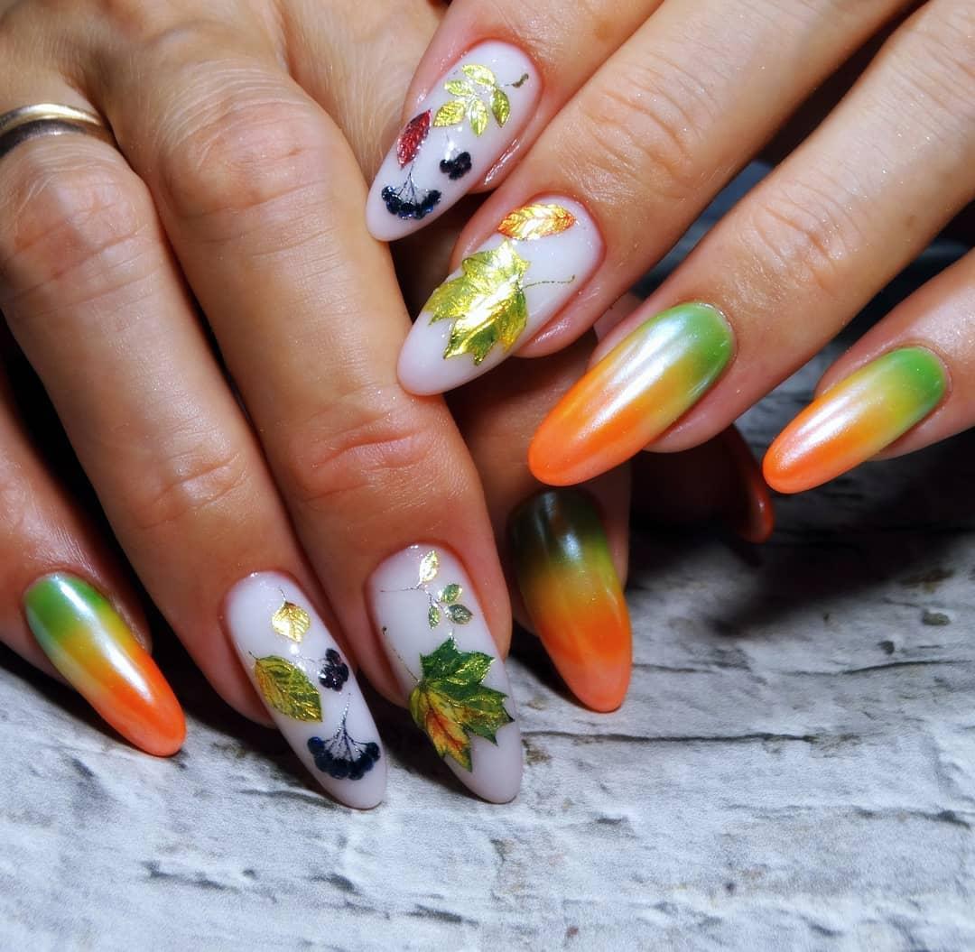 Если посмотреть осенью вокруг себя, можно увидеть удивительное буйство красок. Почему бы не повторить его в маникюре? Выбирайте базовый набор лаков и наносите их в произвольном порядке. Мазки краски можно заменить брызгами. Вам не нужно соблюдать четких правил — творите на свой вкус или доверьтесь мастеру. Таким образом можно оформить все ноготки или всего один или два на руке.