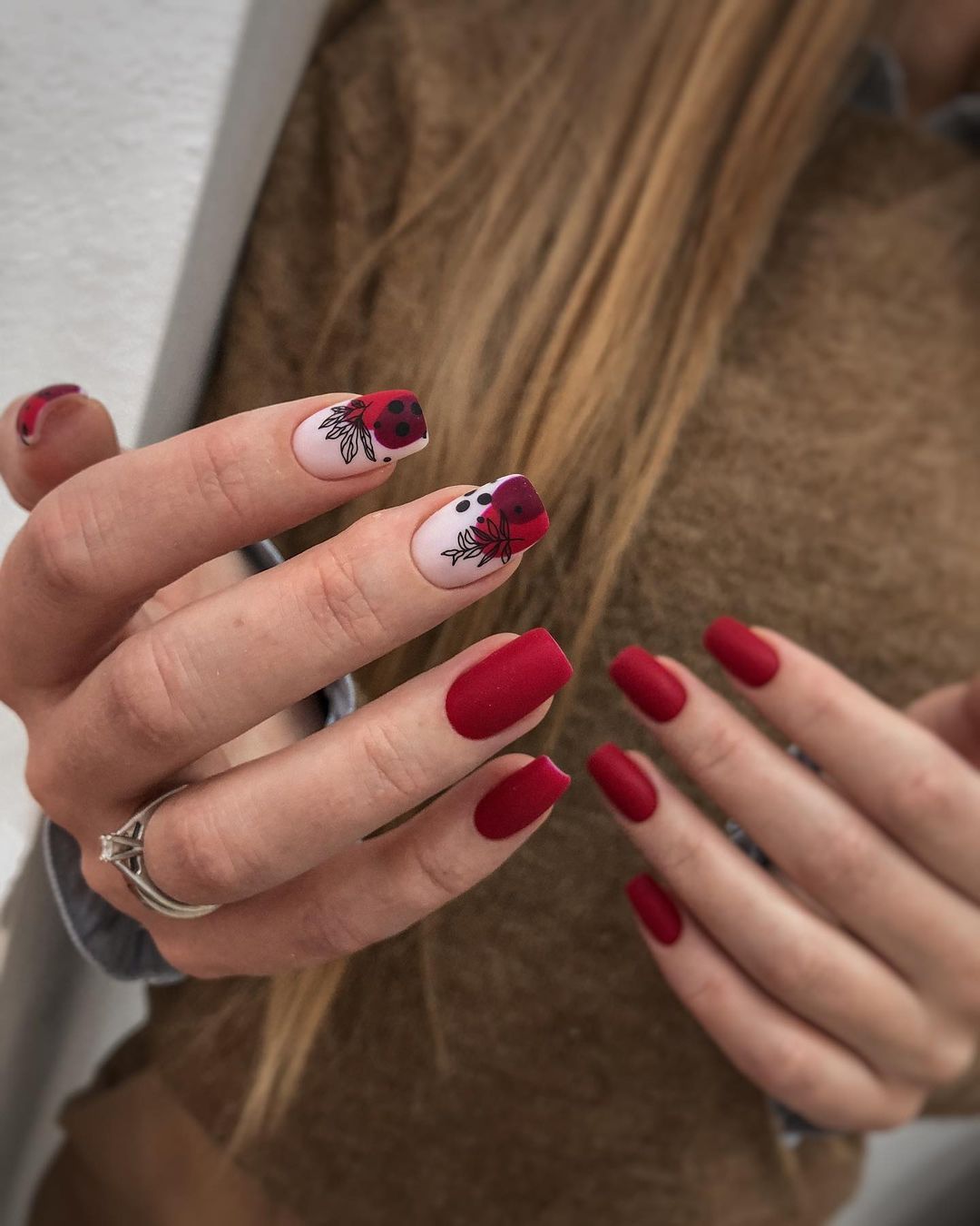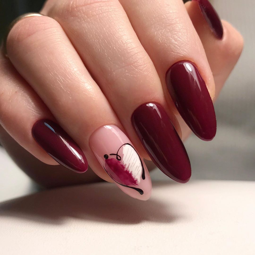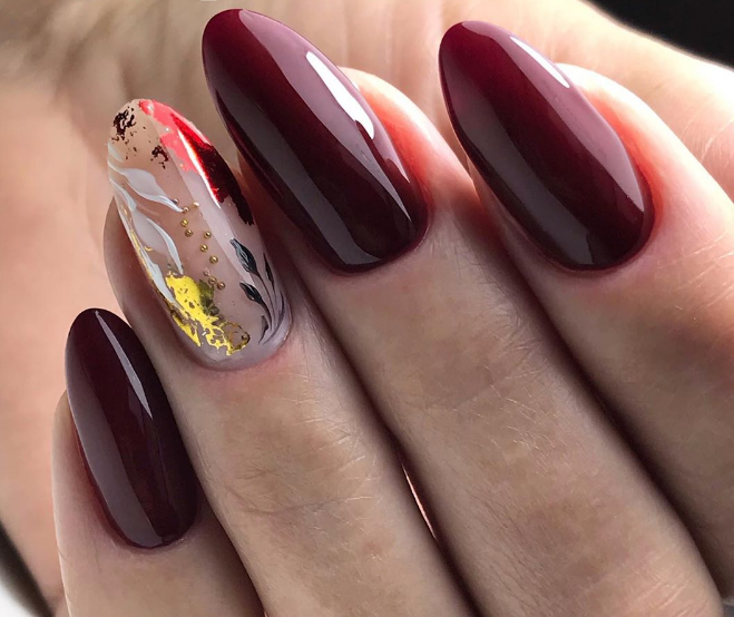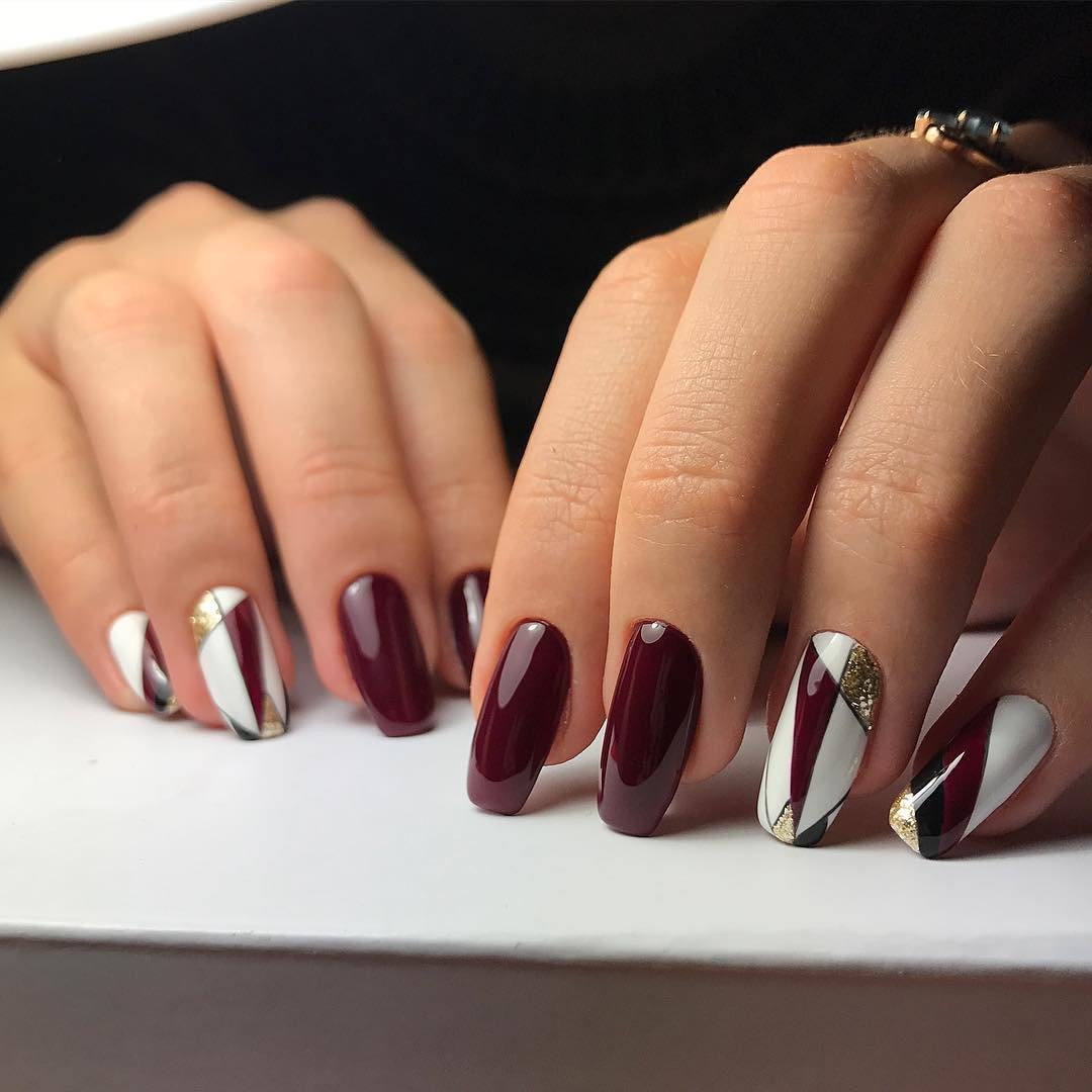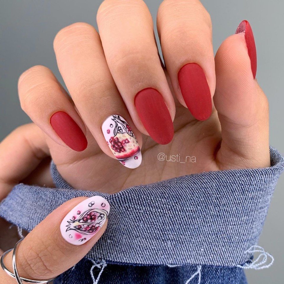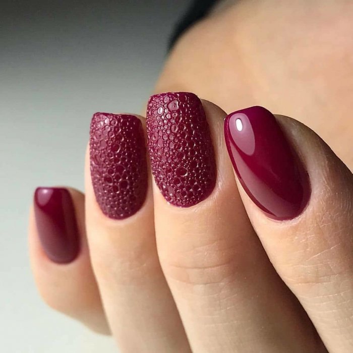 Это теплая и очень богатая палитра. Страстные и глубокие красные — уже самостоятельный декор. Они отлично смотрятся с матовым топом, глянцевым слексом. С помощью оттенка бордо можно сделать осенний цветной френч.