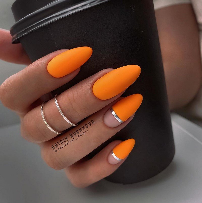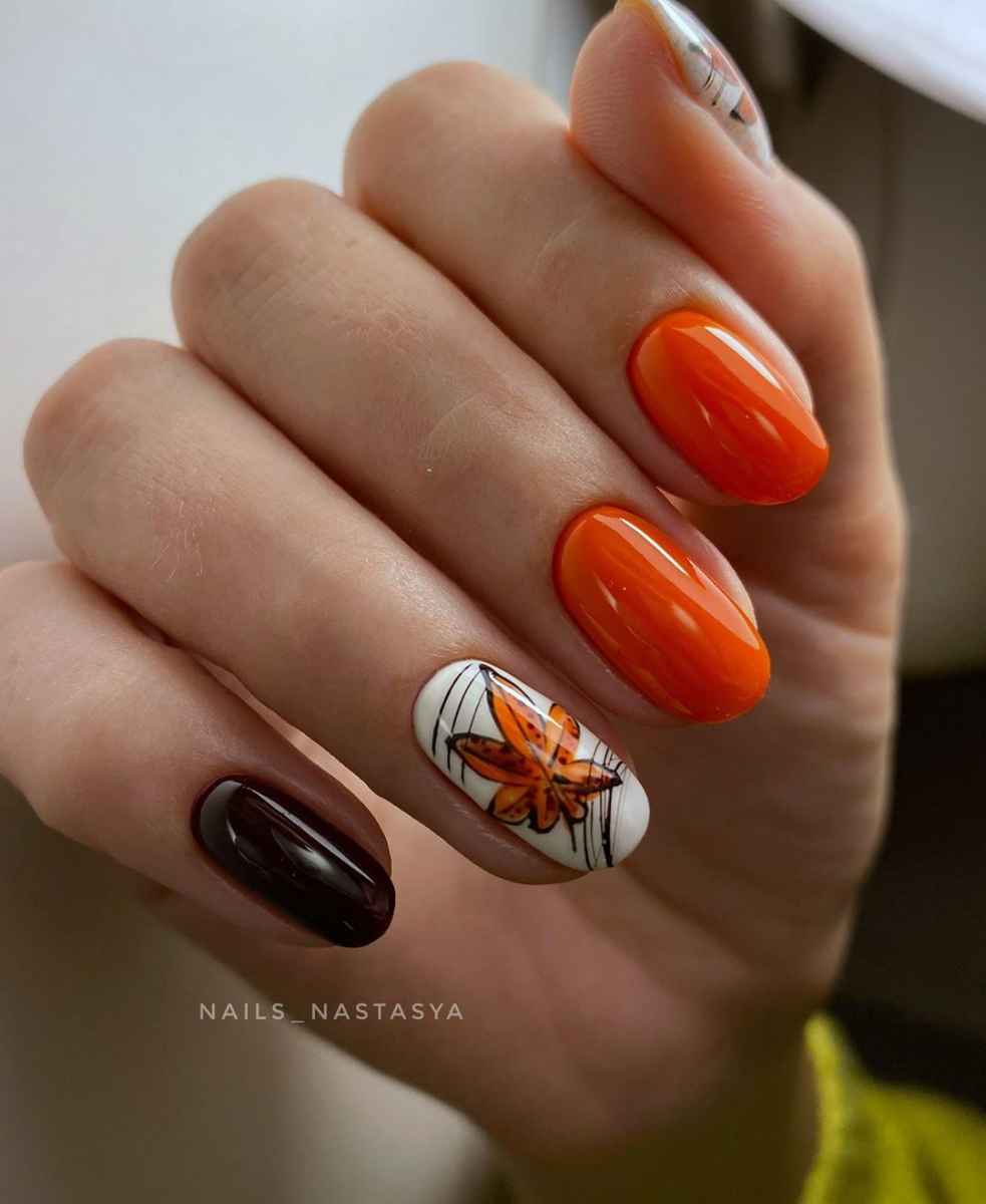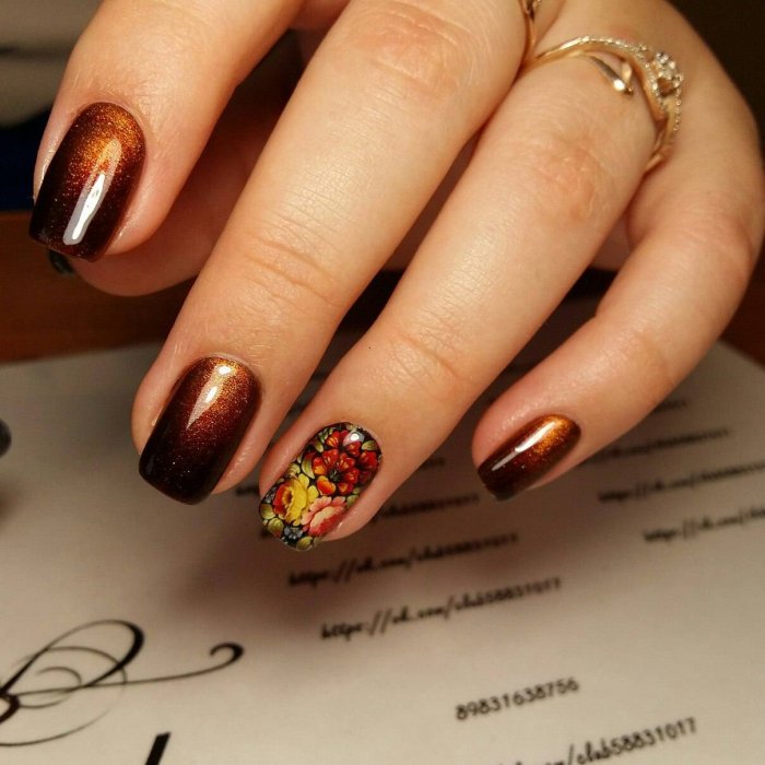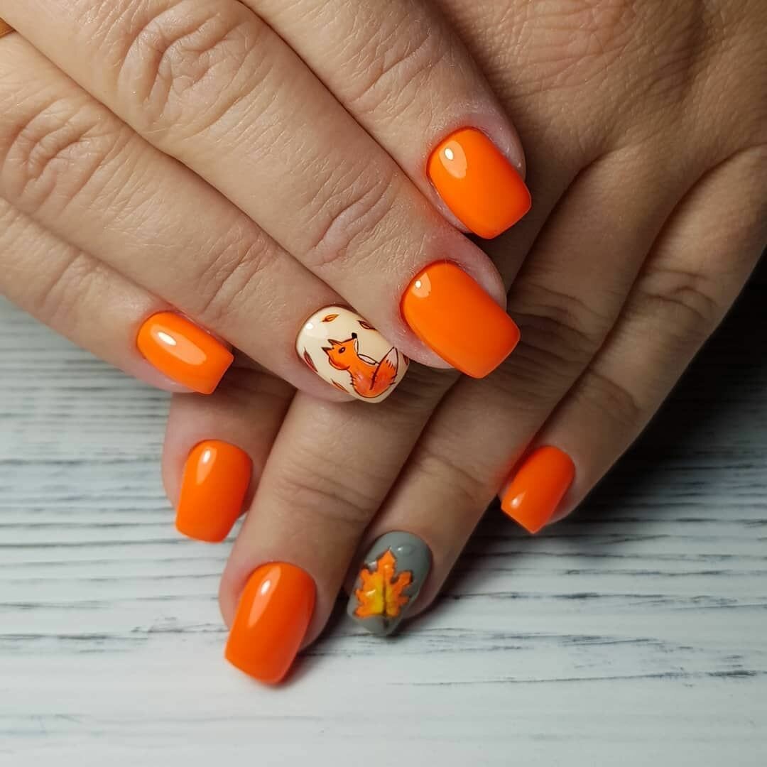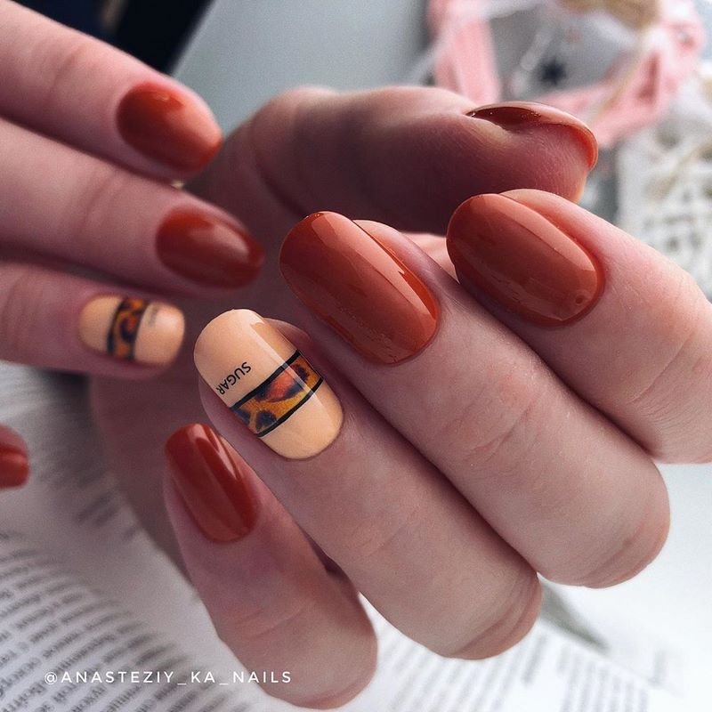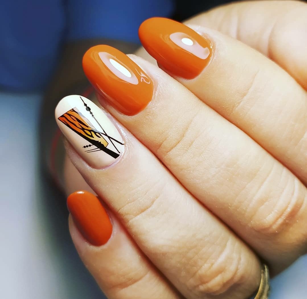 Все оттенки оранжевого как никогда актуальны именно осенью. Для создания модного маникюра выбирайте оттенок с медным тоном. Он может стать как базовым, так и использоваться для стильного акцента.