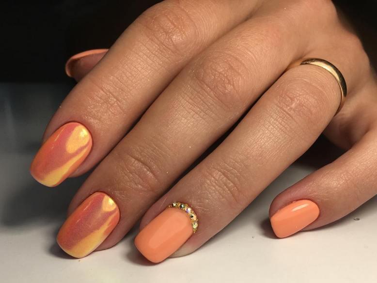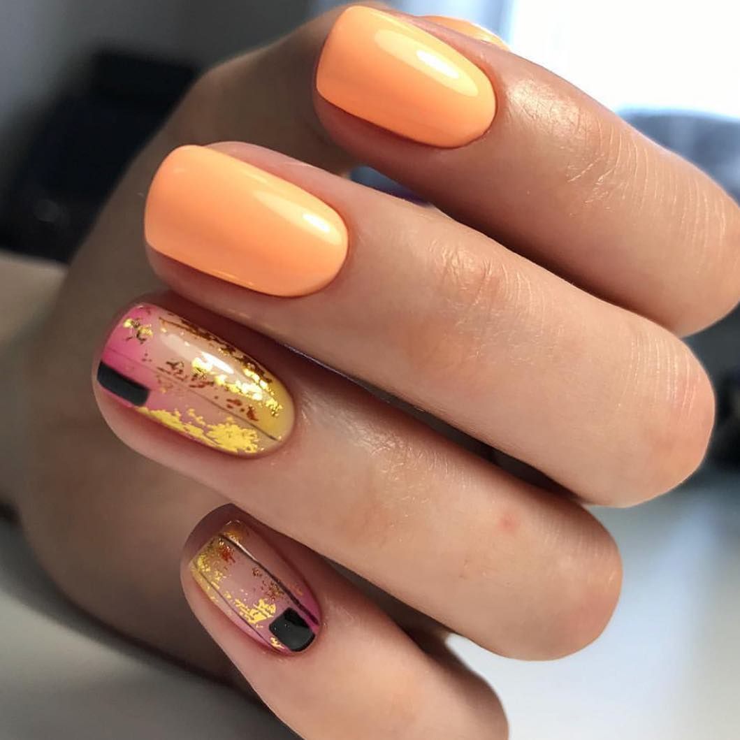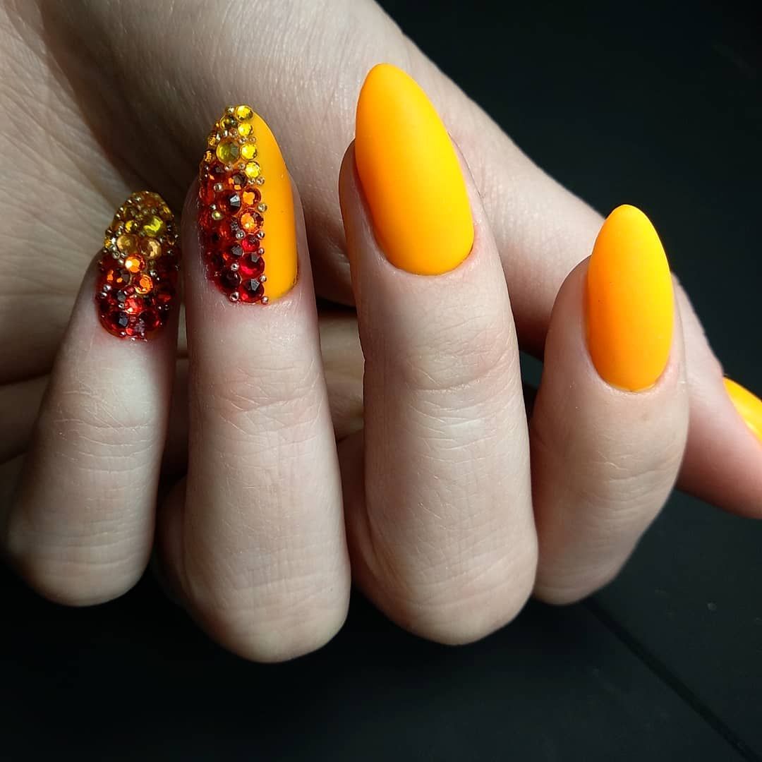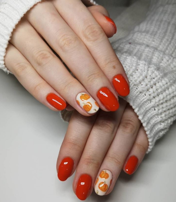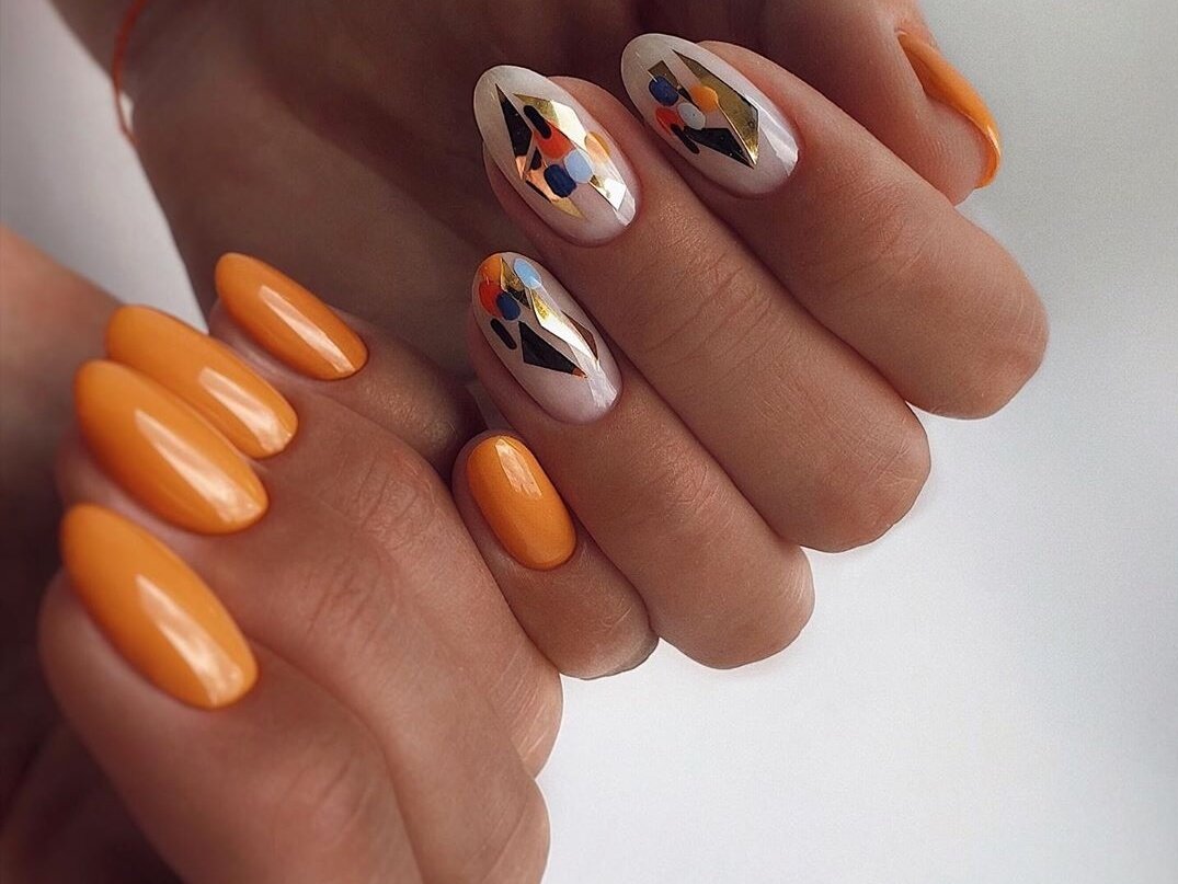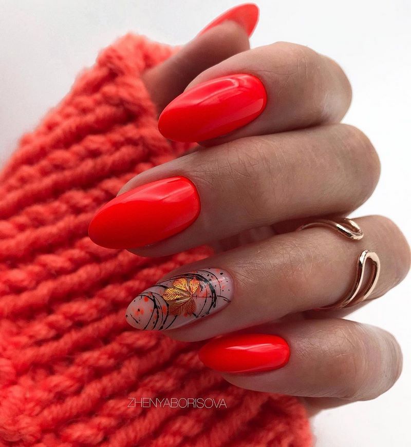 Все оттенки оранжевого как никогда актуальны именно осенью. Для создания модного маникюра выбирайте оттенок с медным тоном. Он может стать как базовым, так и использоваться для стильного акцента.