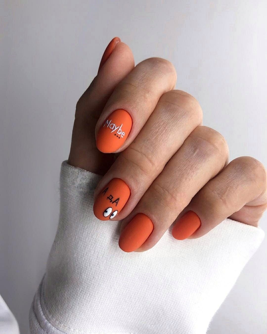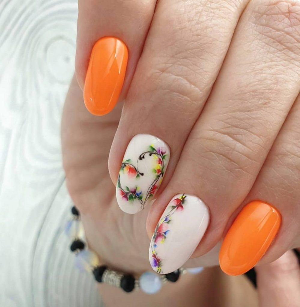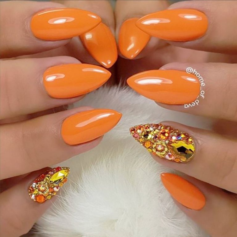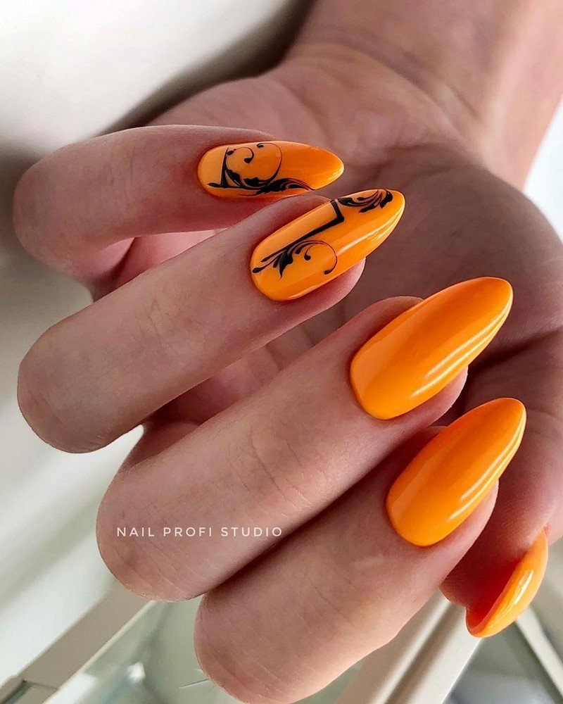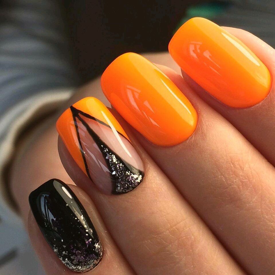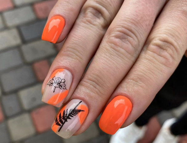 Все оттенки оранжевого как никогда актуальны именно осенью. Для создания модного маникюра выбирайте оттенок с медным тоном. Он может стать как базовым, так и использоваться для стильного акцента.
