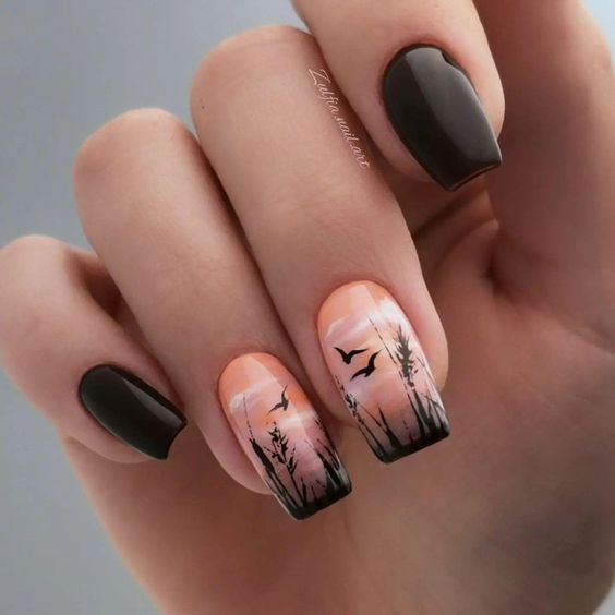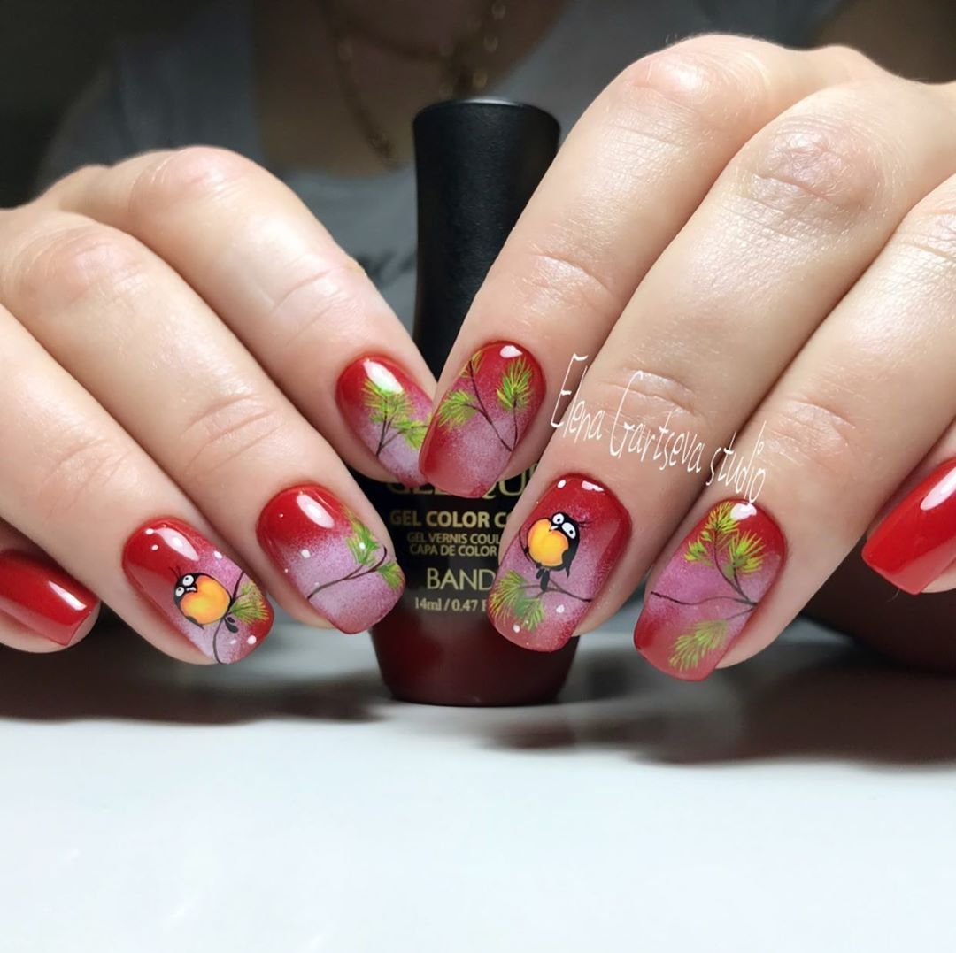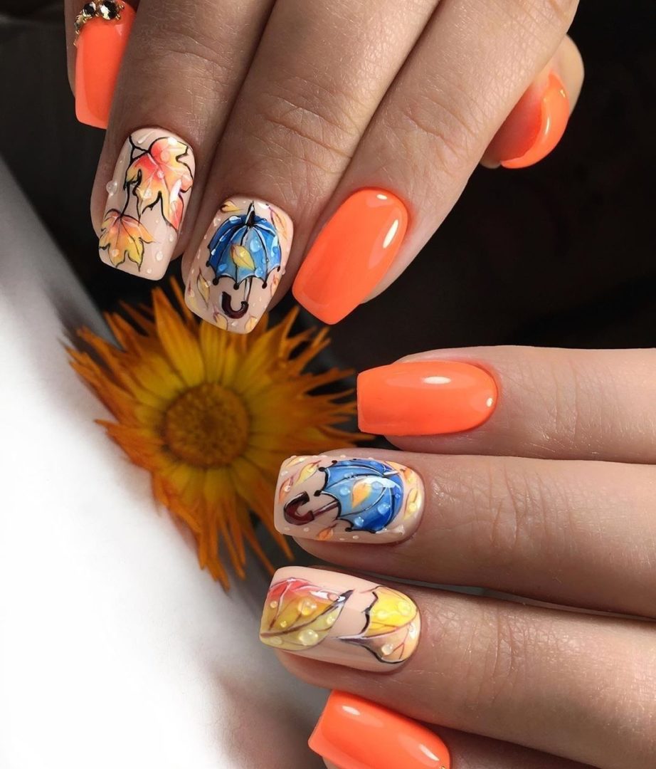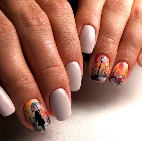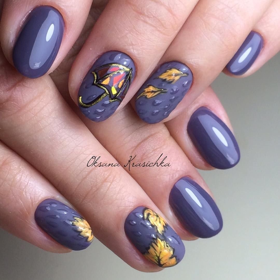 Совет: не стоит зацикливаться на привычных для осени орнаментах. Стильно и необычно на ногтях будут смотреться атрибуты прохладного и дождливого времени года — резиновые сапожки, зонтики и ягоды. Отдельно стоит сказать о принте птичек. Ведь осенью большинство из них улетают в теплые края. Сделайте маникюр в стиле минимализм.