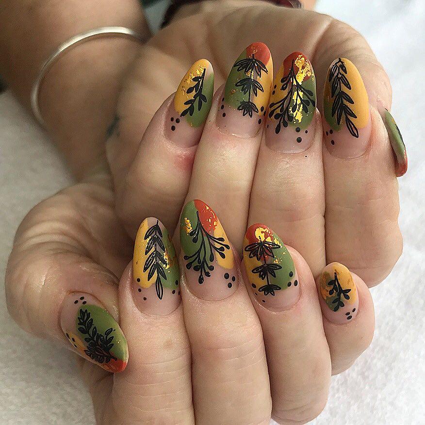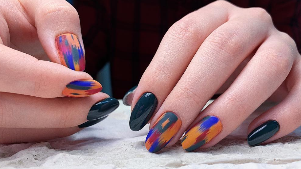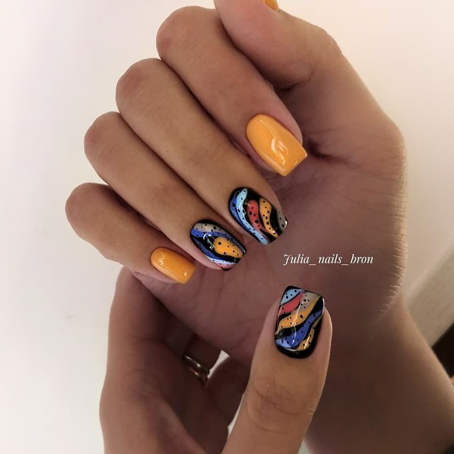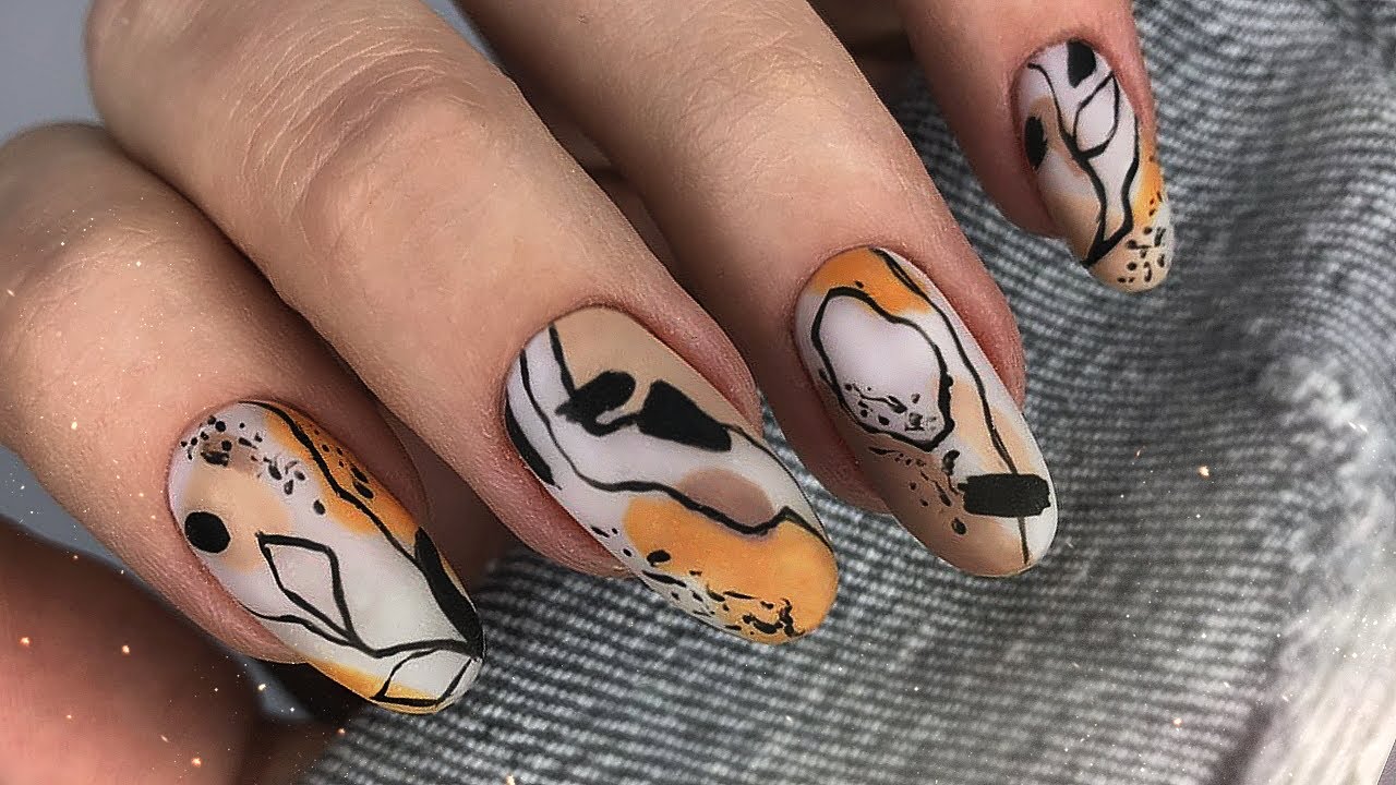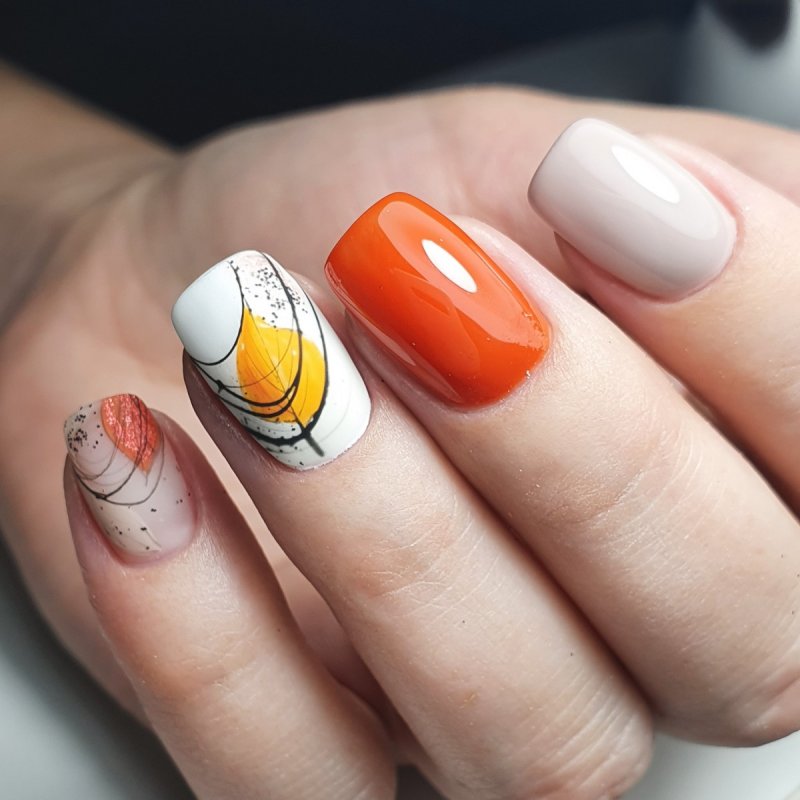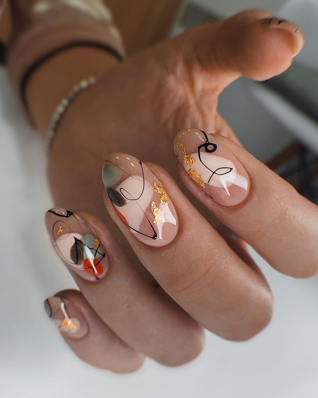 Абстрактный рисунок обычно предполагает буйство красок. Для осеннего маникюра вы можете выбрать все самые любимые — коричневые, оранжевые, зеленые, синие. Лучше сочетать абстракцию с негативным пространством, чтобы декор был более универсальным и стильным.
