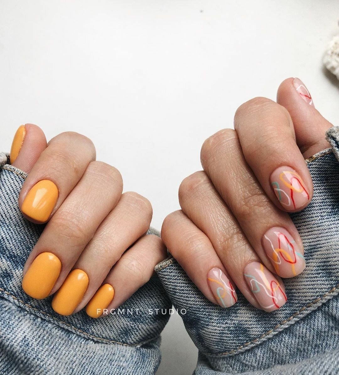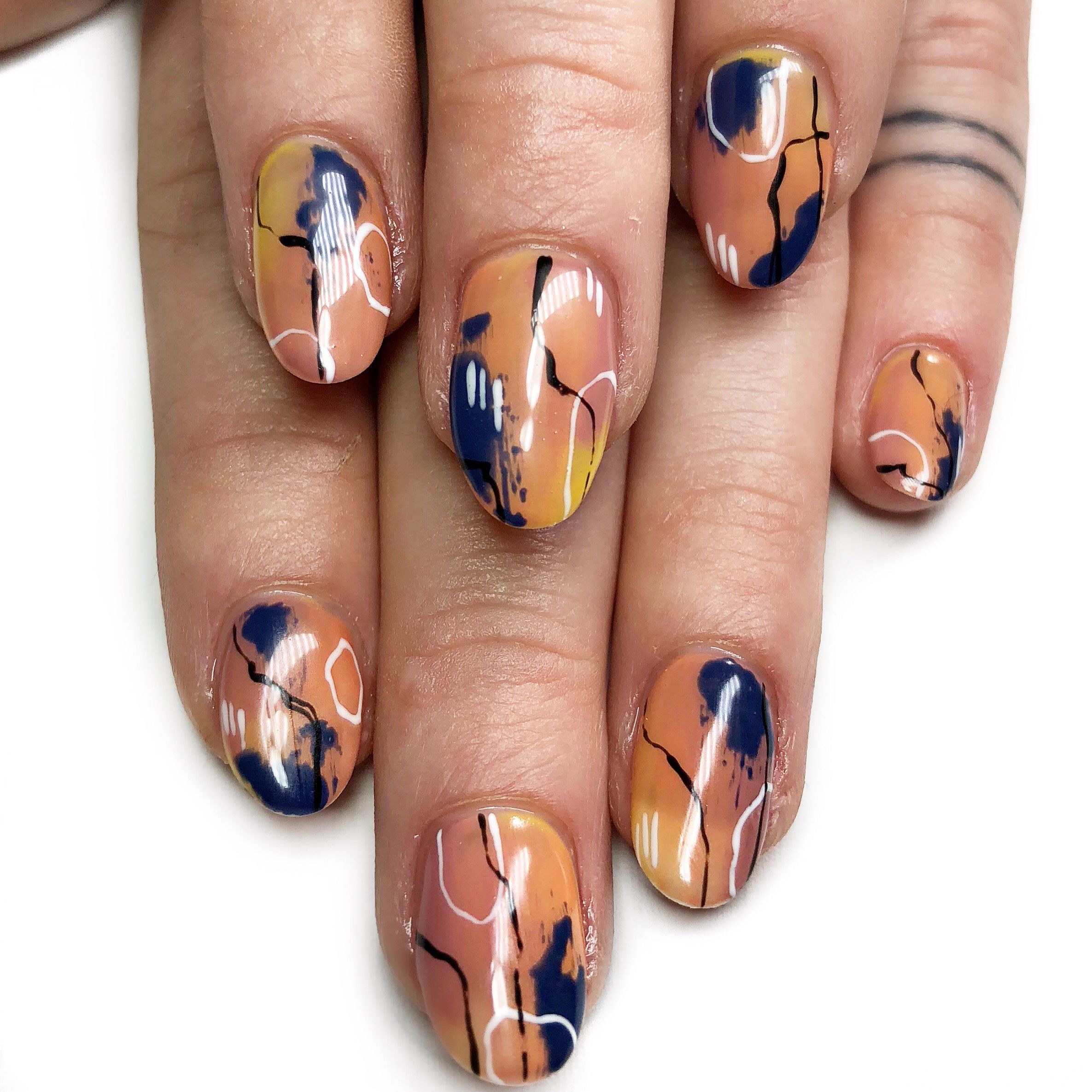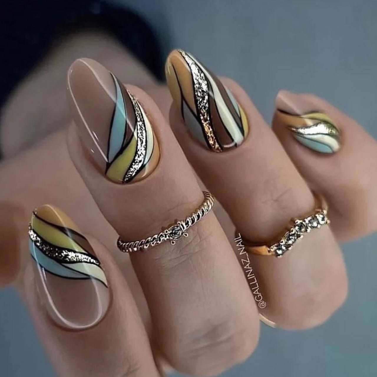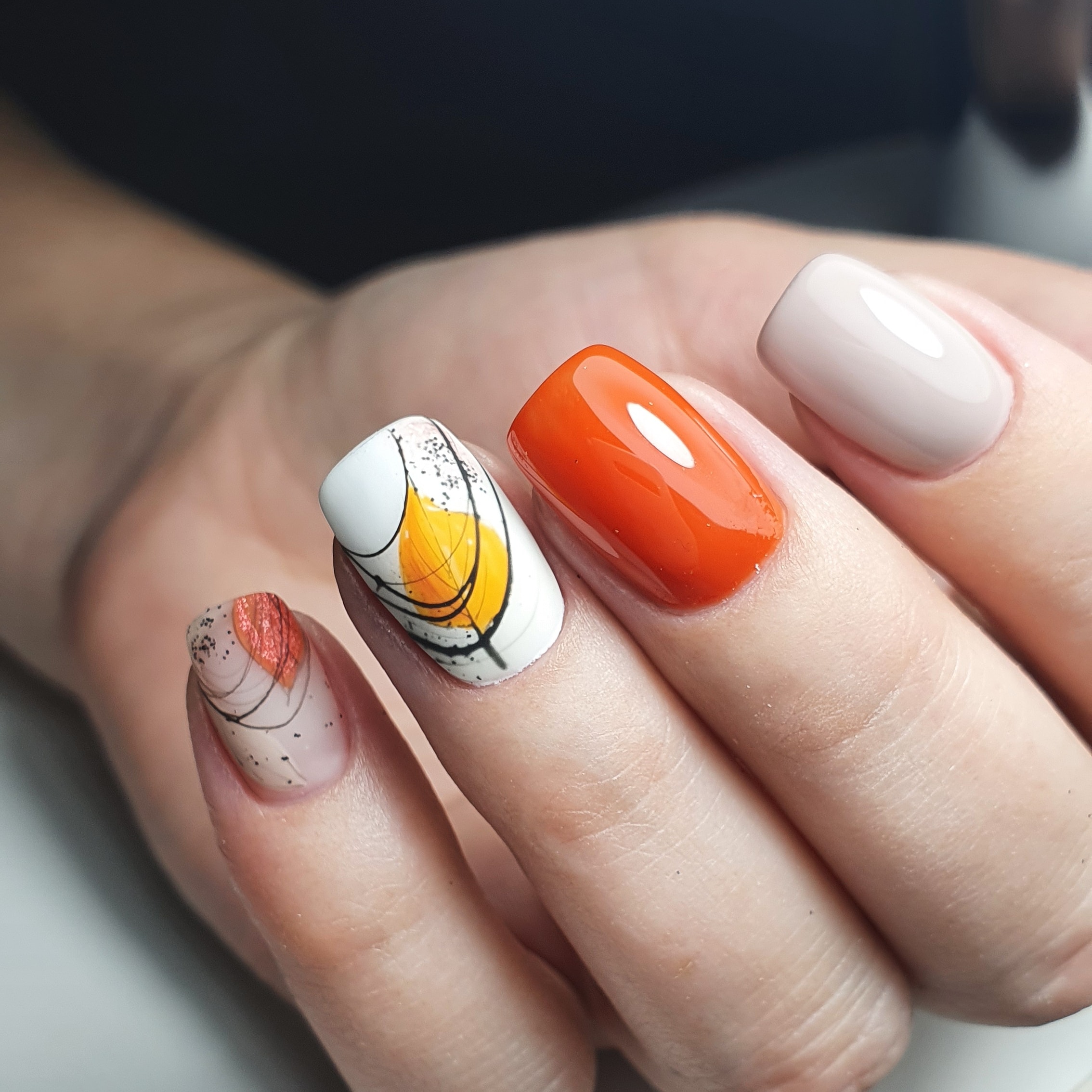 Абстрактный рисунок обычно предполагает буйство красок. Для осеннего маникюра вы можете выбрать все самые любимые — коричневые, оранжевые, зеленые, синие. Лучше сочетать абстракцию с негативным пространством, чтобы декор был более универсальным и стильным.