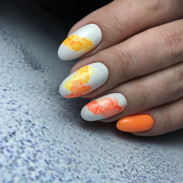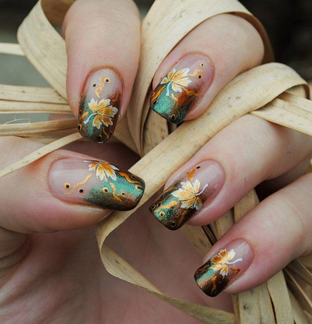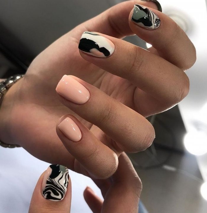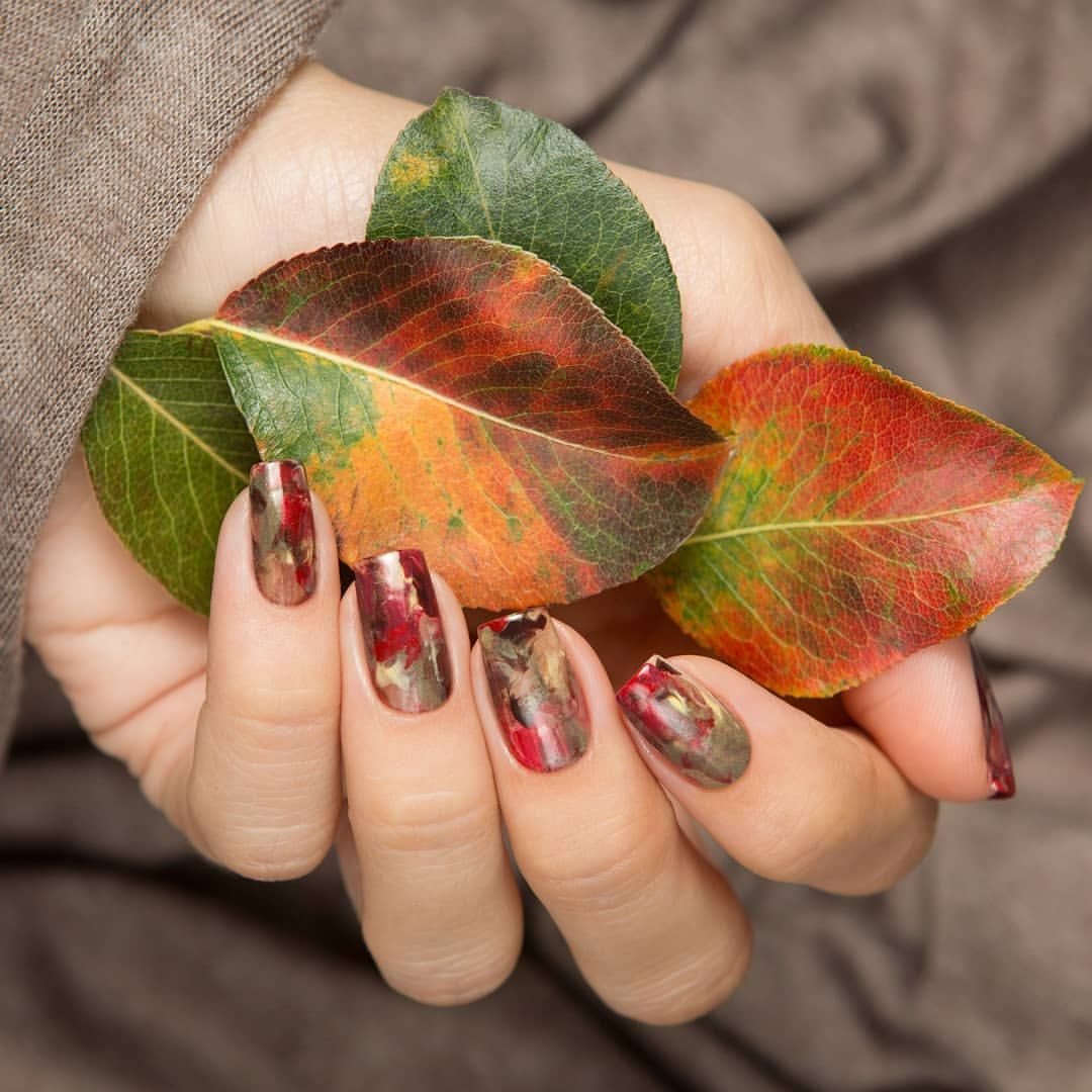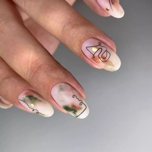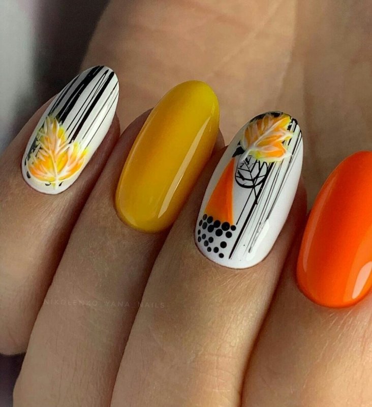 Абстрактный рисунок обычно предполагает буйство красок. Для осеннего маникюра вы можете выбрать все самые любимые — коричневые, оранжевые, зеленые, синие. Лучше сочетать абстракцию с негативным пространством, чтобы декор был более универсальным и стильным.