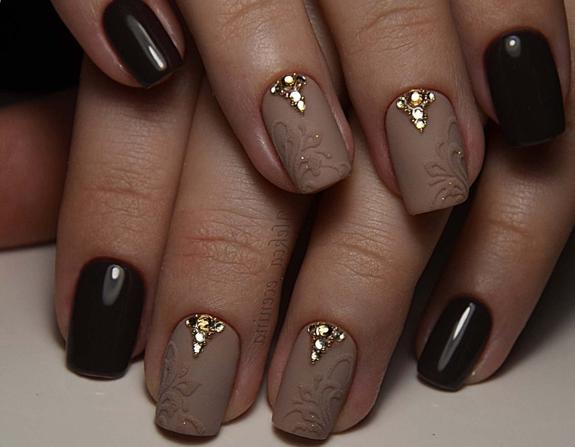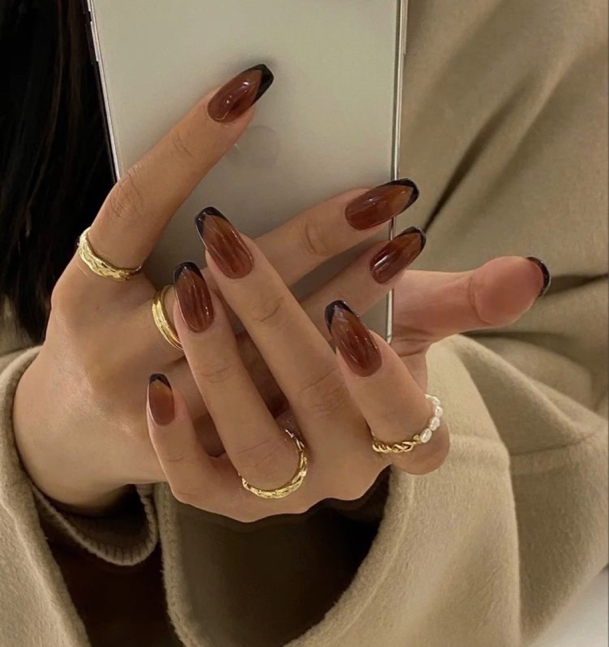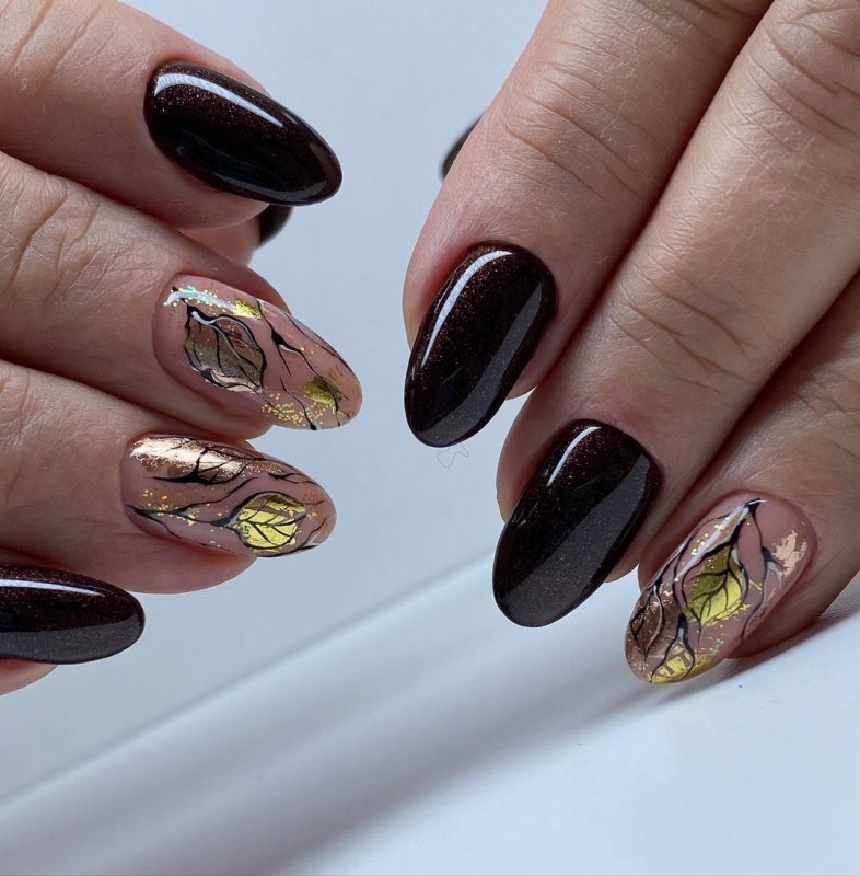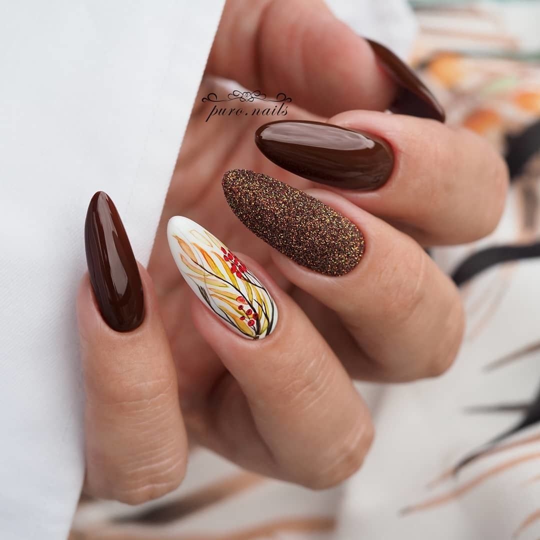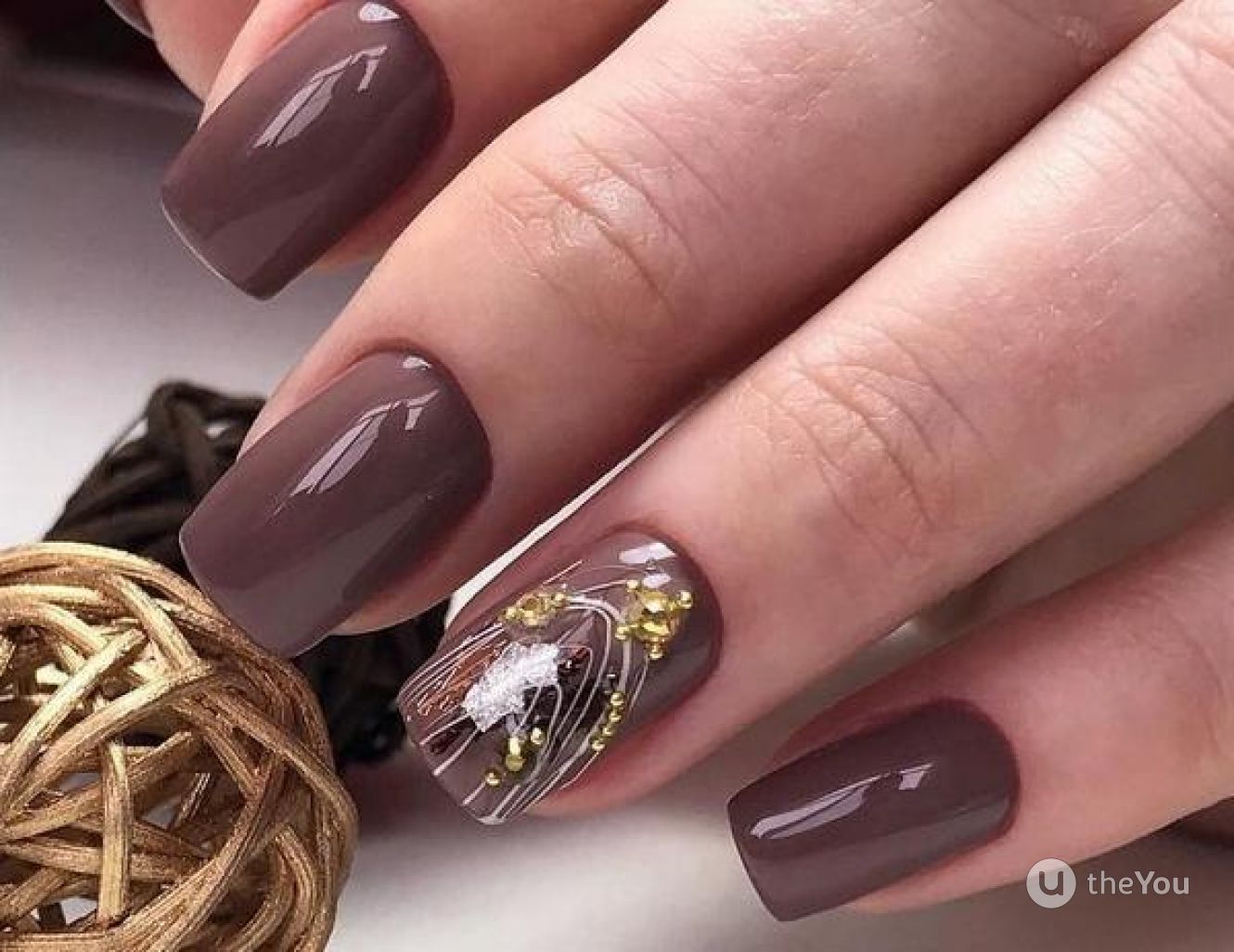 А вот здесь можно выбирать горькие оттенки. Вкусный шоколад на ногтях — отличное решение для осеннего маникюра. Сделайте смелый шоколадный френч или дополните дизайн рисунками, фольгой и у вас получится стильный образ.