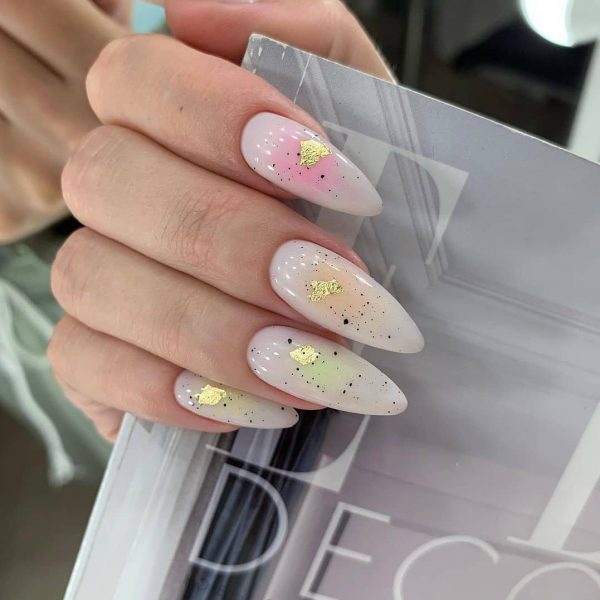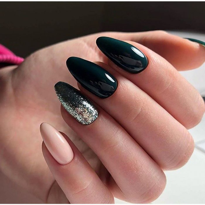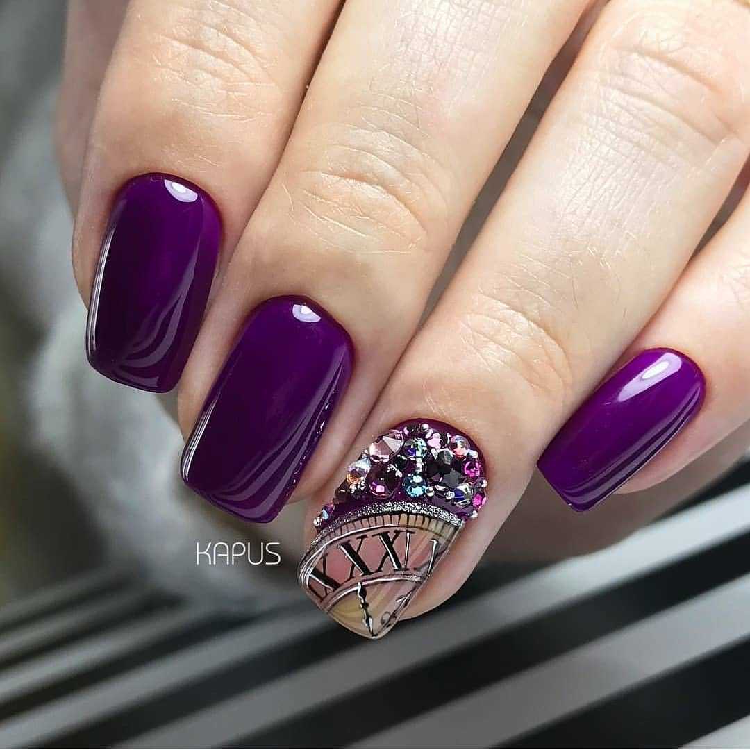 Блестки и стразы — простой вариант придать блеска обычному маникюру. Вы можете выделить лунку или сделать небольшой блестящий акцент и сразу увидите как преобразиться дизайн ногтей. Только не переусердствуйте — обилие камней не просто сделает декор вульгарным, но и может нанести вред пластине.