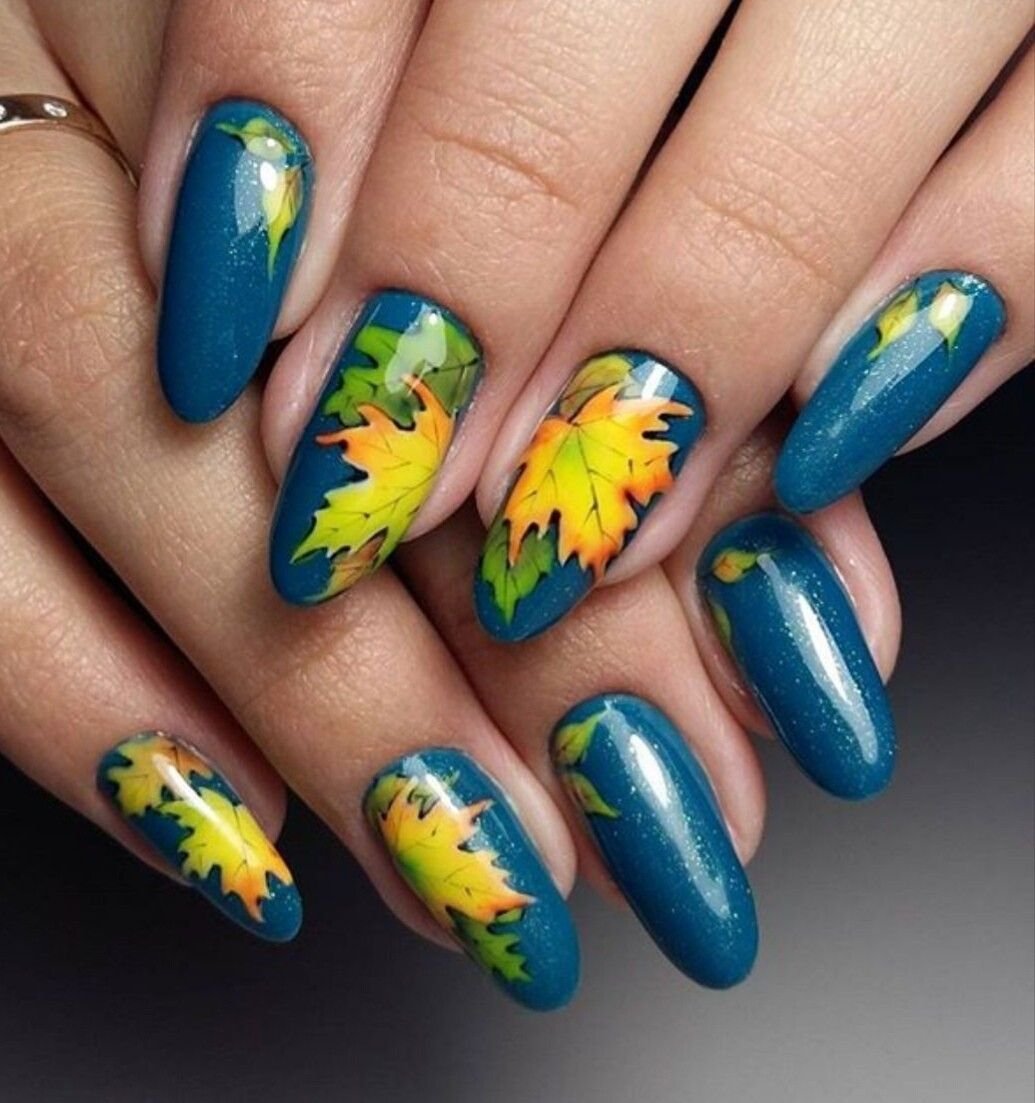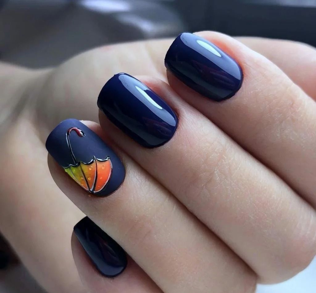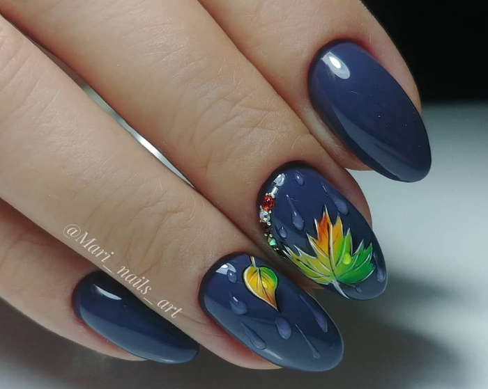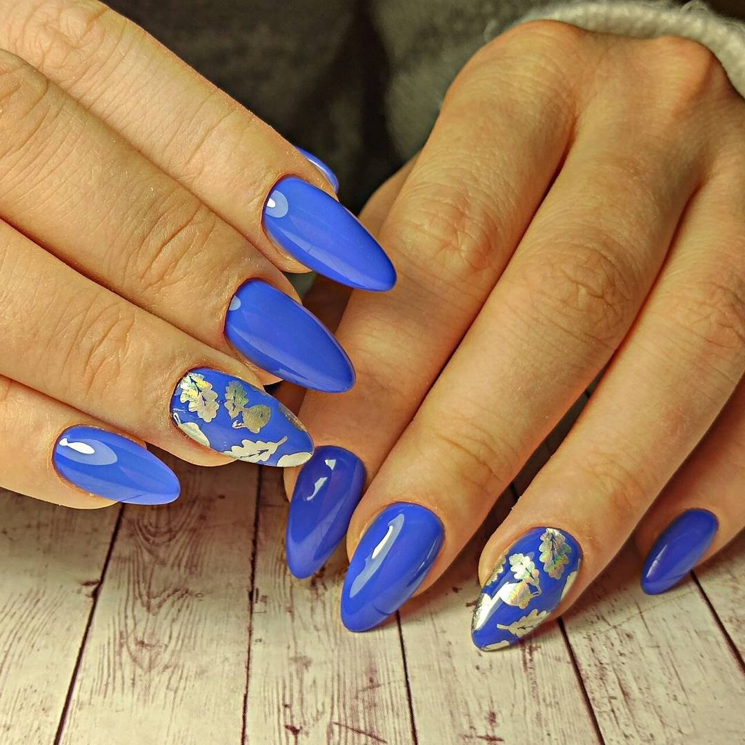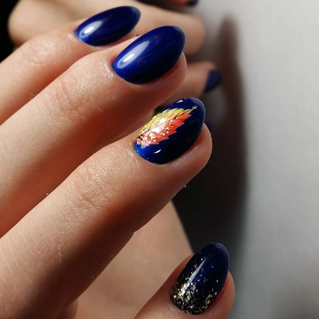Для осеннего маникюра актуальны довольно темные оттенки синего — от индиго до сине-свинцового. Это самостоятельный оттенок, который можно дополнить контрастным цветом — оранжевым, желтым, золотом или серебром.