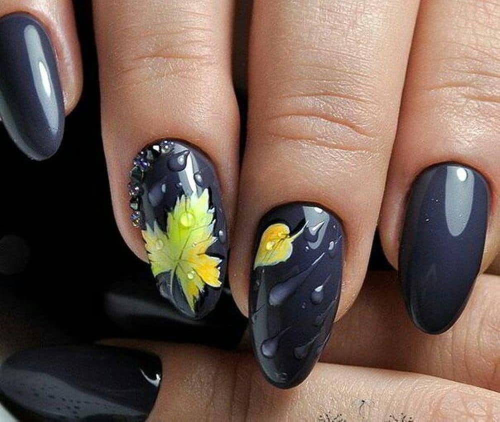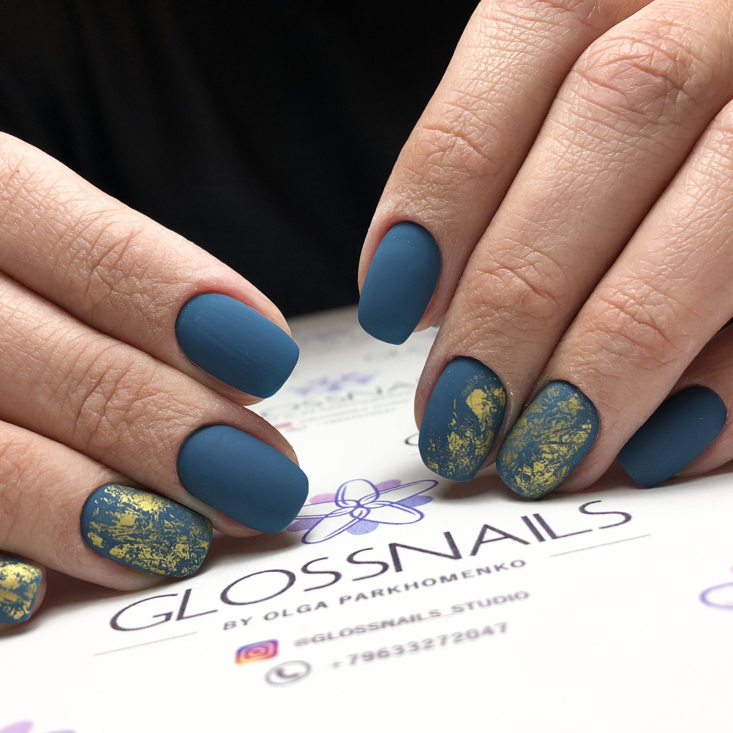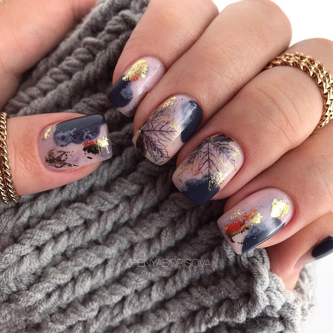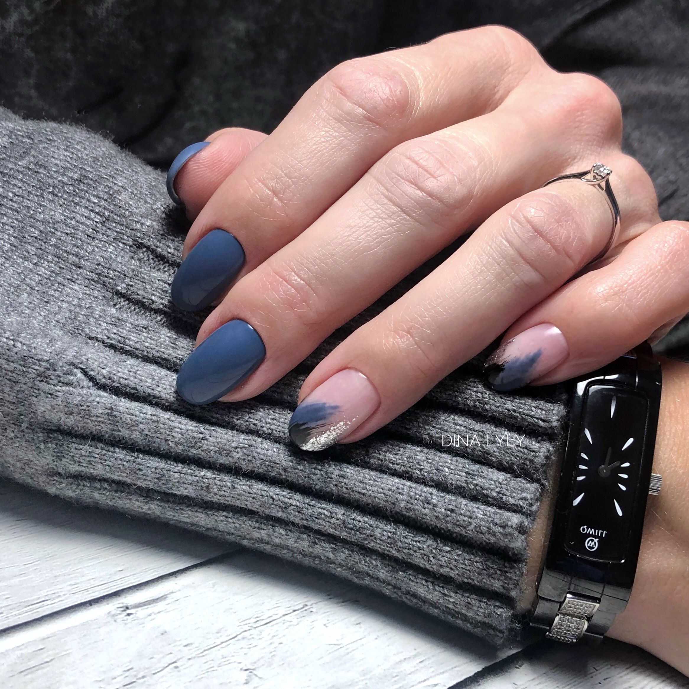 Для осеннего маникюра актуальны довольно темные оттенки синего — от индиго до сине-свинцового. Это самостоятельный оттенок, который можно дополнить контрастным цветом — оранжевым, желтым, золотом или серебром.