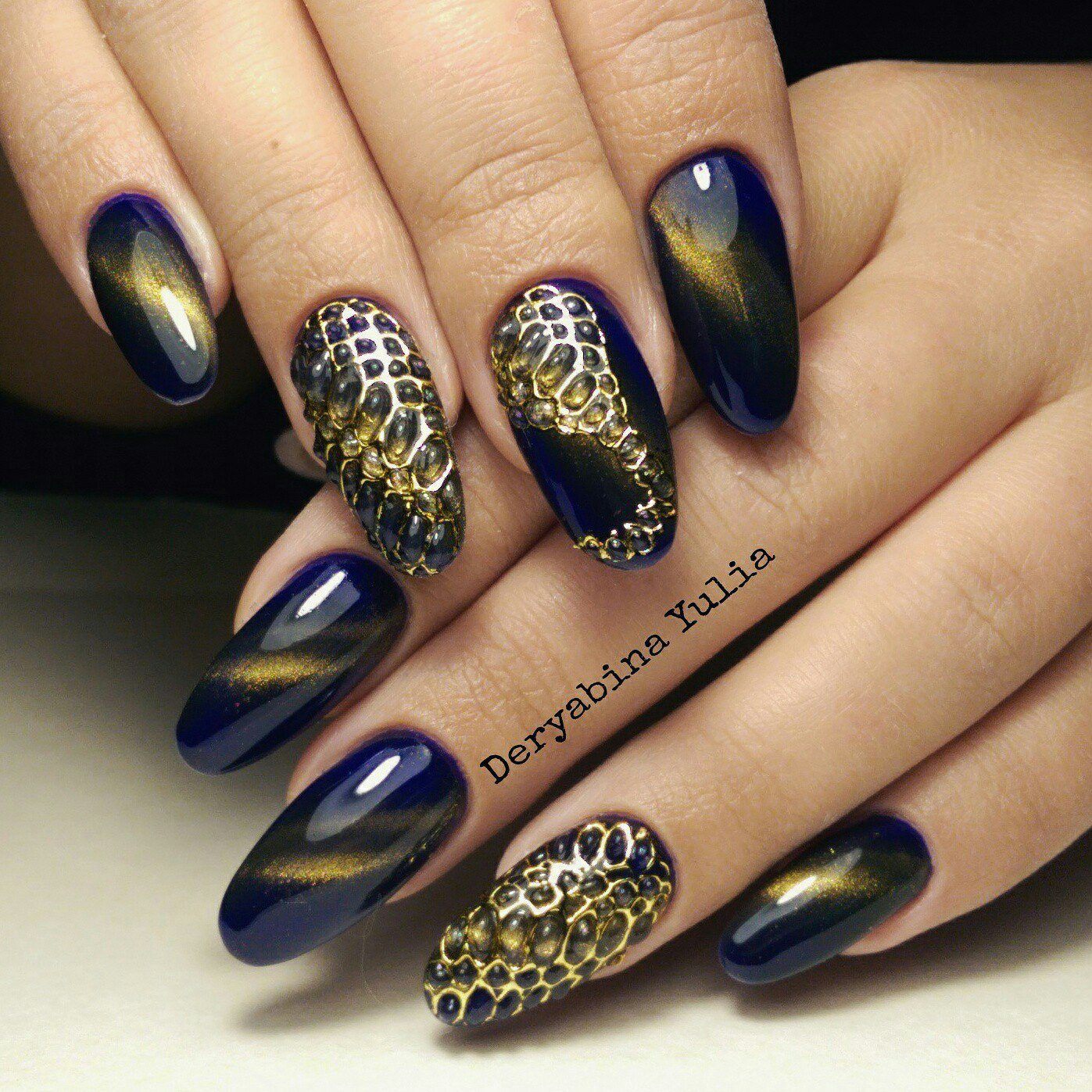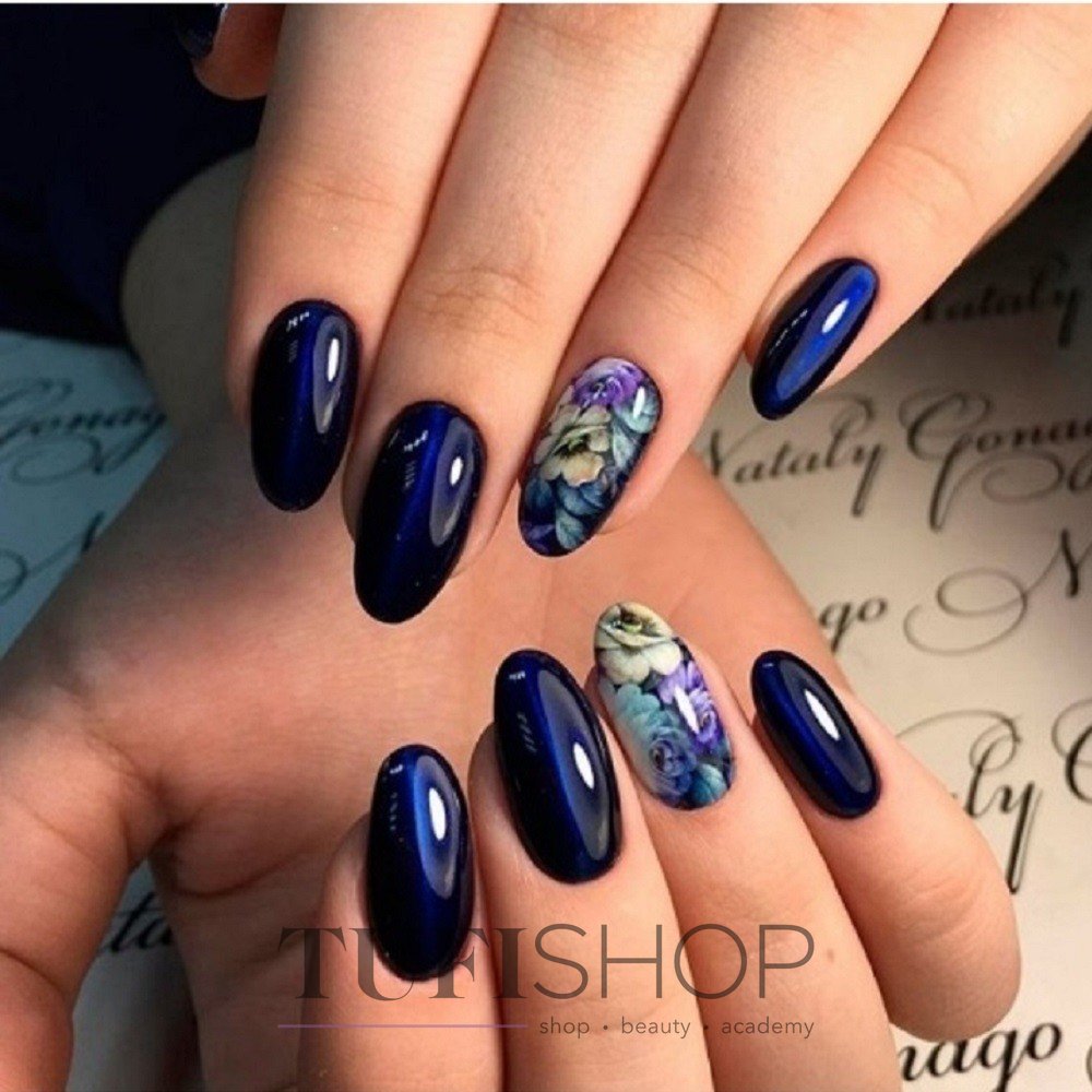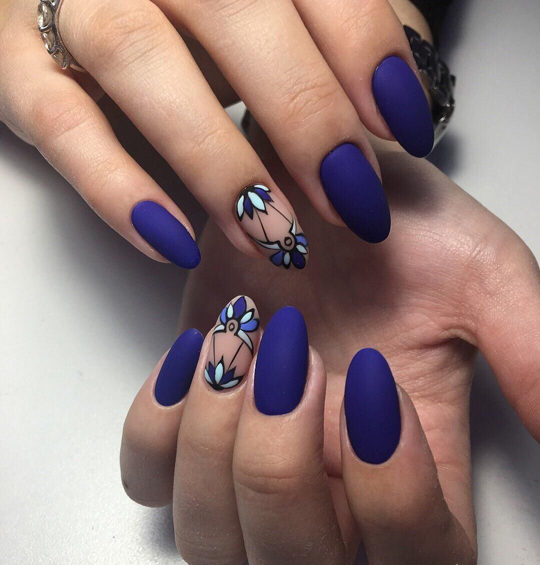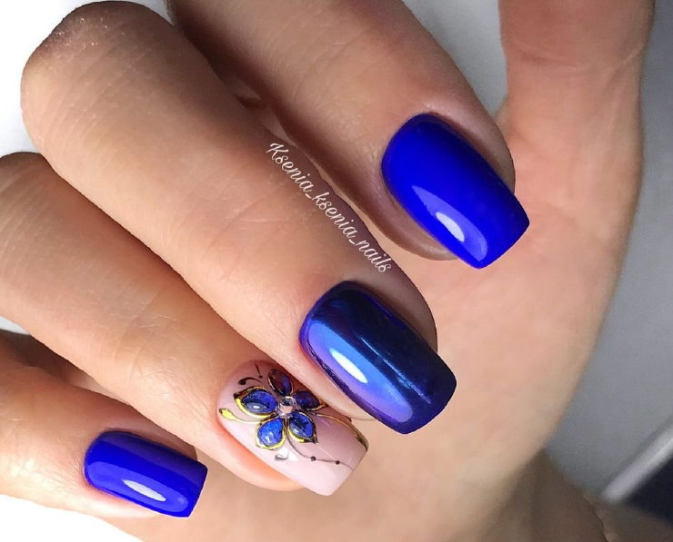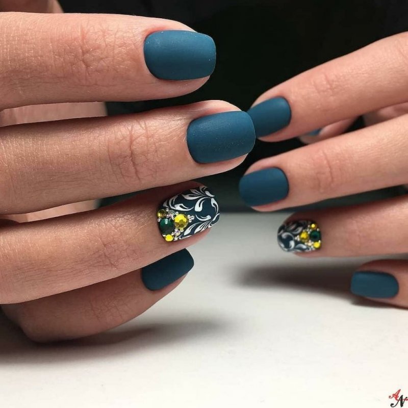 Для осеннего маникюра актуальны довольно темные оттенки синего — от индиго до сине-свинцового. Это самостоятельный оттенок, который можно дополнить контрастным цветом — оранжевым, желтым, золотом или серебром.