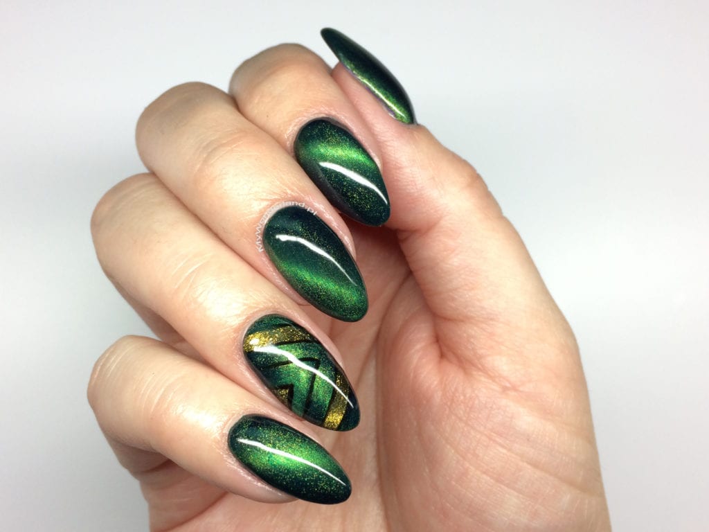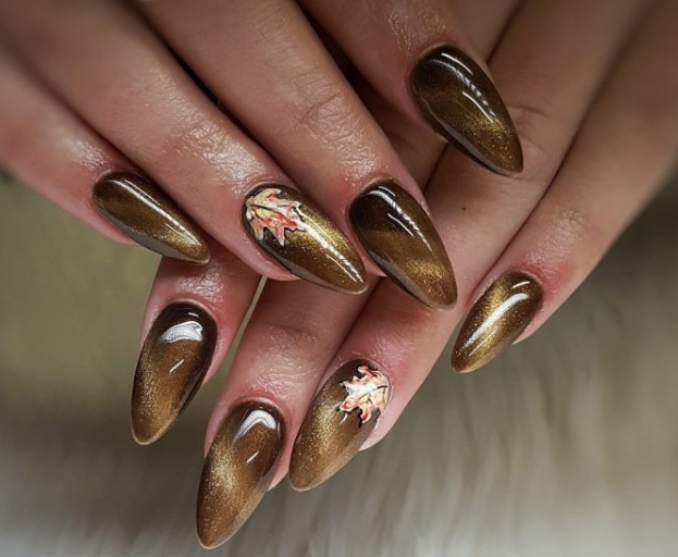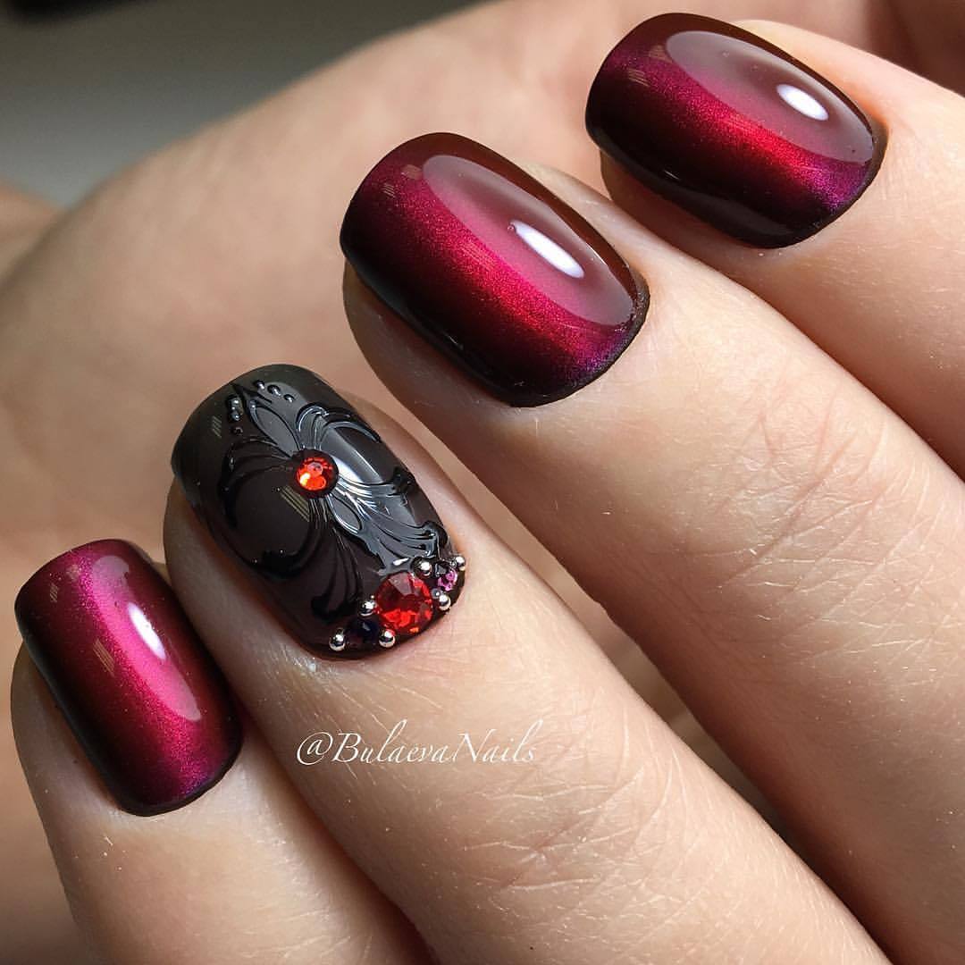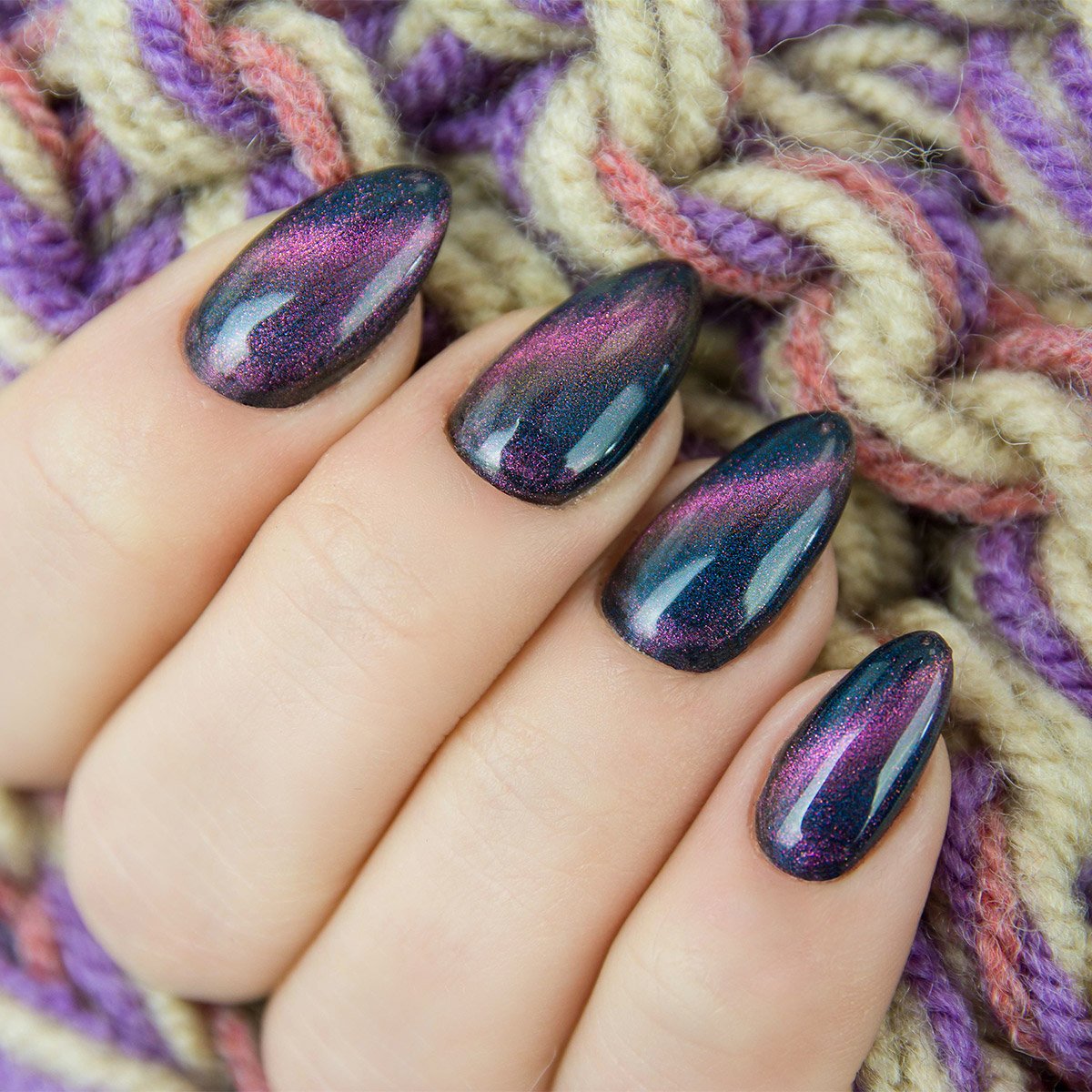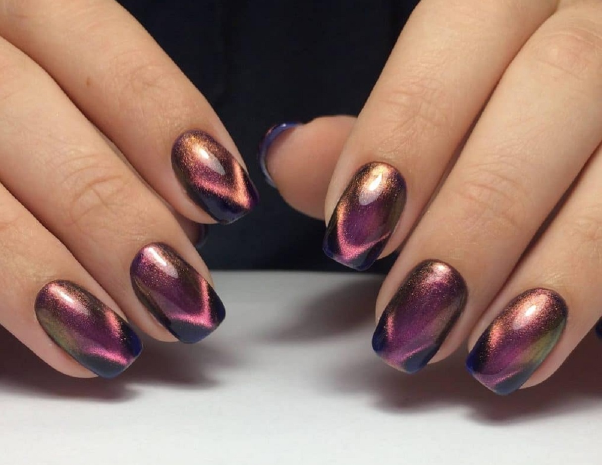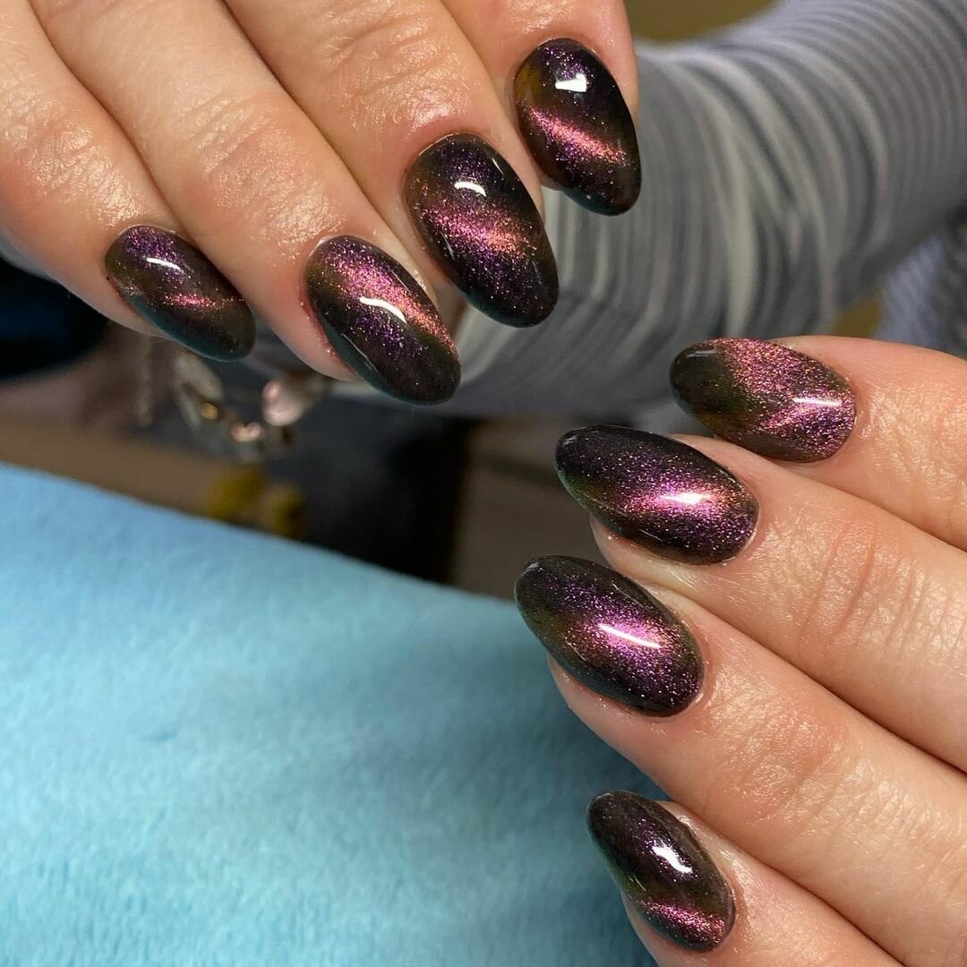 Таинственные переливы — эффект, который можно получить на ногтях с помощью специального магнитного лака. Красивый сочный осенний оттенок заиграет новыми красками, а маникюр получится простой, но очень стильный.