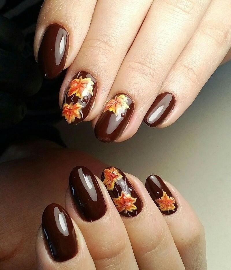 Короткие ногти в осенний период лучше «одевать» в темные оттенки лака. Выбирайте самые модные цвета осени — коричневый, шоколад, густой синий или ультрамодный хаки.