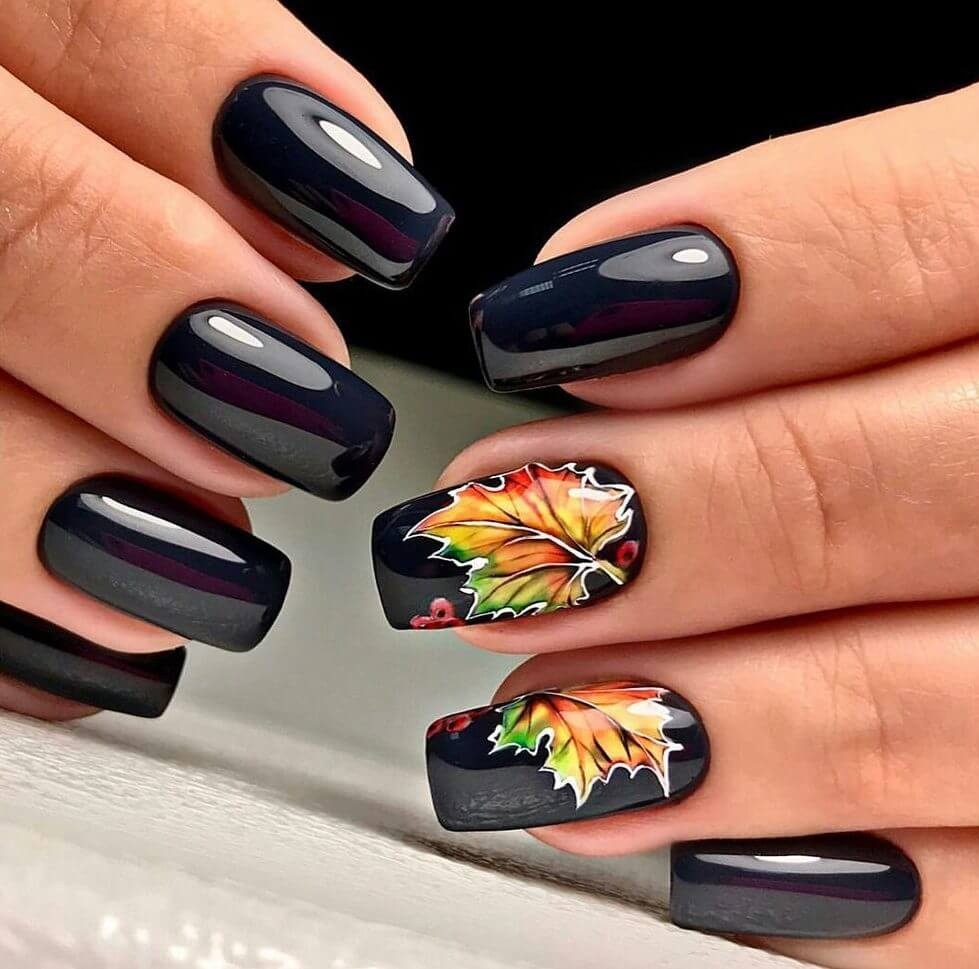 Форма квадрат довольно смелая и подходит стремительным деловым натурам. Осенний маникюр на такую форму прекрасно уживается с любым оттенком лака. А вот для дизайна стоит выбрать рисунок или классический френч.