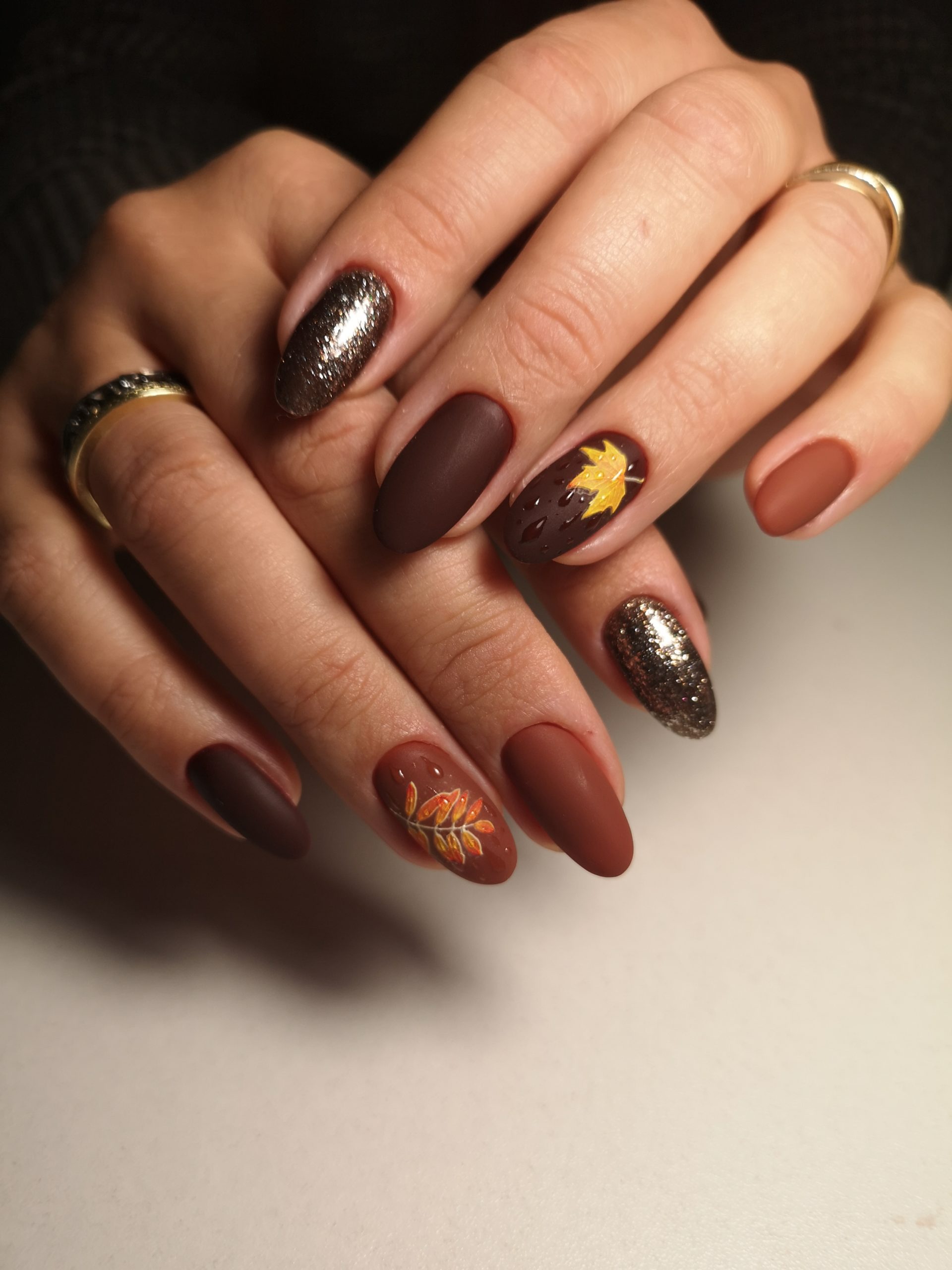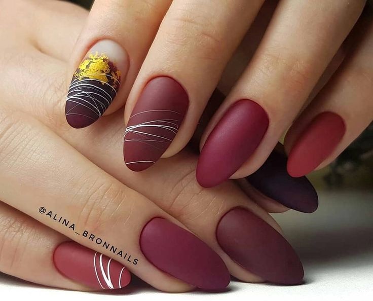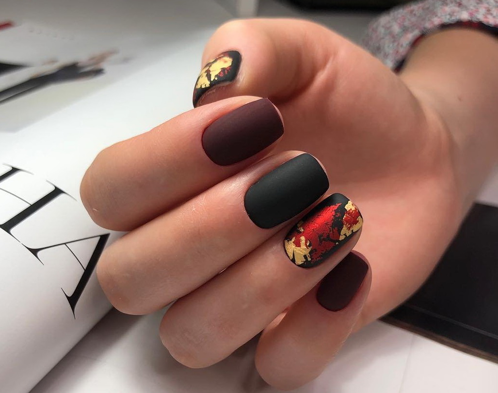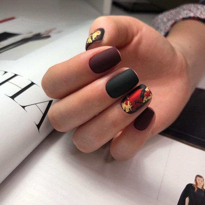 Глянцевый блеск — всегда беспроигрышное решение для маникюра. Но осенние оттенки особенно эффектно смотрятся в матовом исполнении. Оригинальная идея — сочетать два варианта фактуры. Например, матовая основа и выделение улыбки или лунки глянцевым лаком.