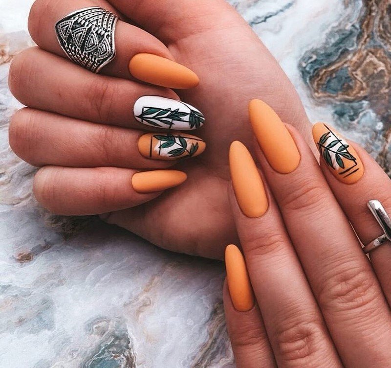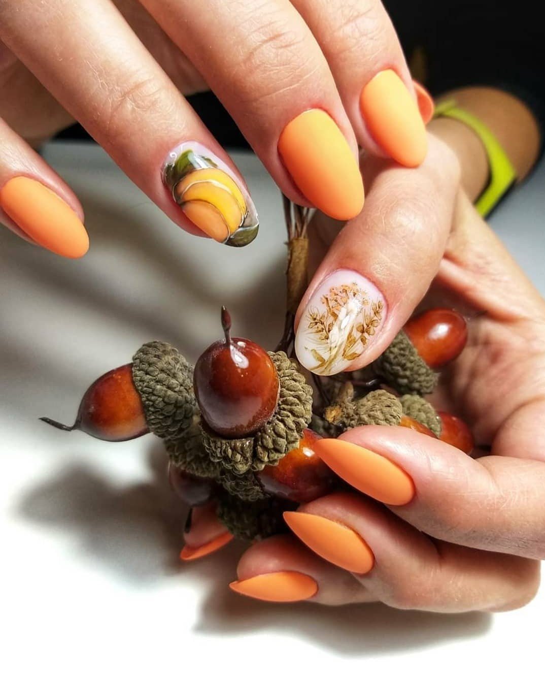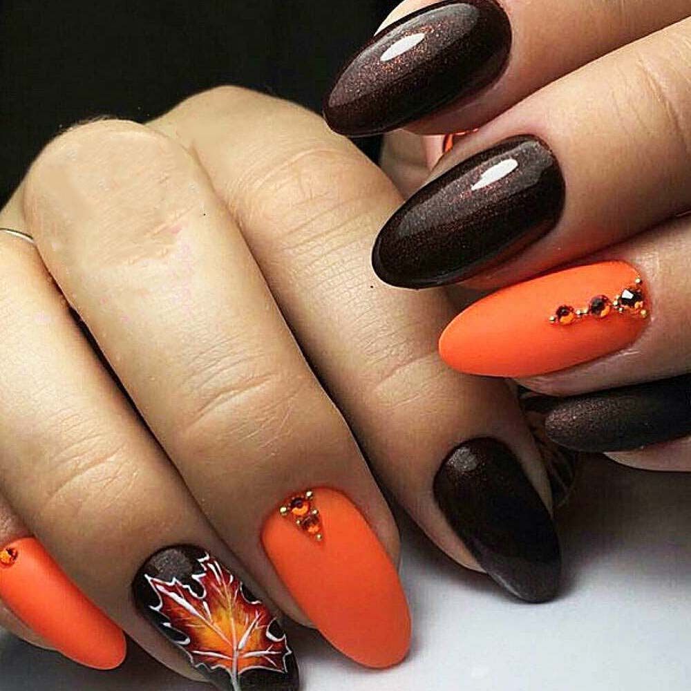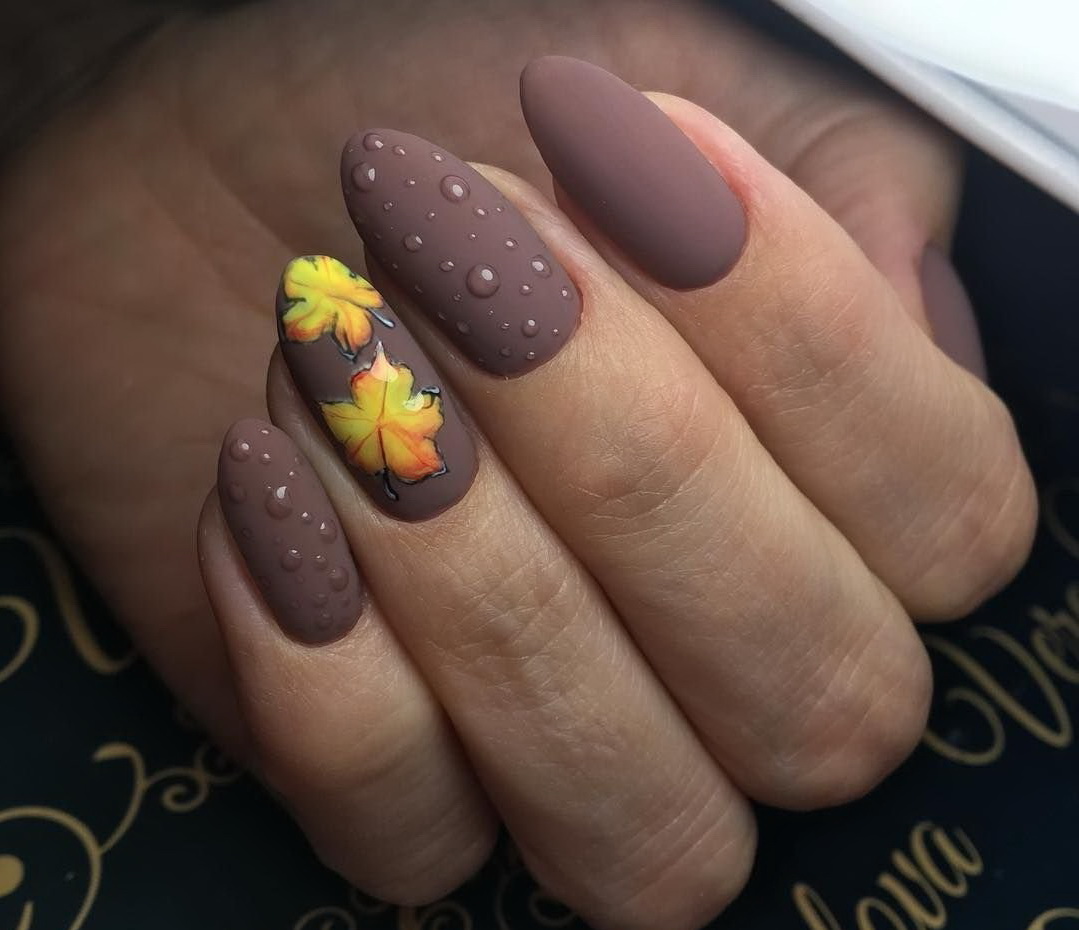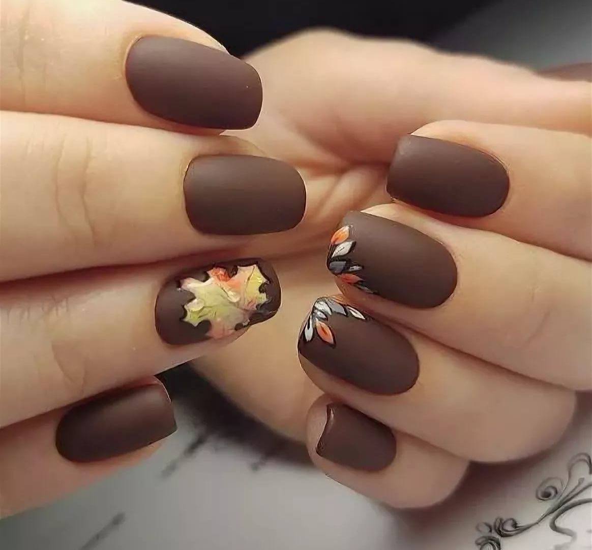 Длинные ноготки в осеннем маникюре позволяют отпустить фантазию в полет — вы можете выбрать любые оттенки лака. Ведь вам не нужно визуально удлинять пластину. Особенно стильно на большой длине будет смотреться матовая фактура. Здесь можно обойтись и без дополнительного дизайна.