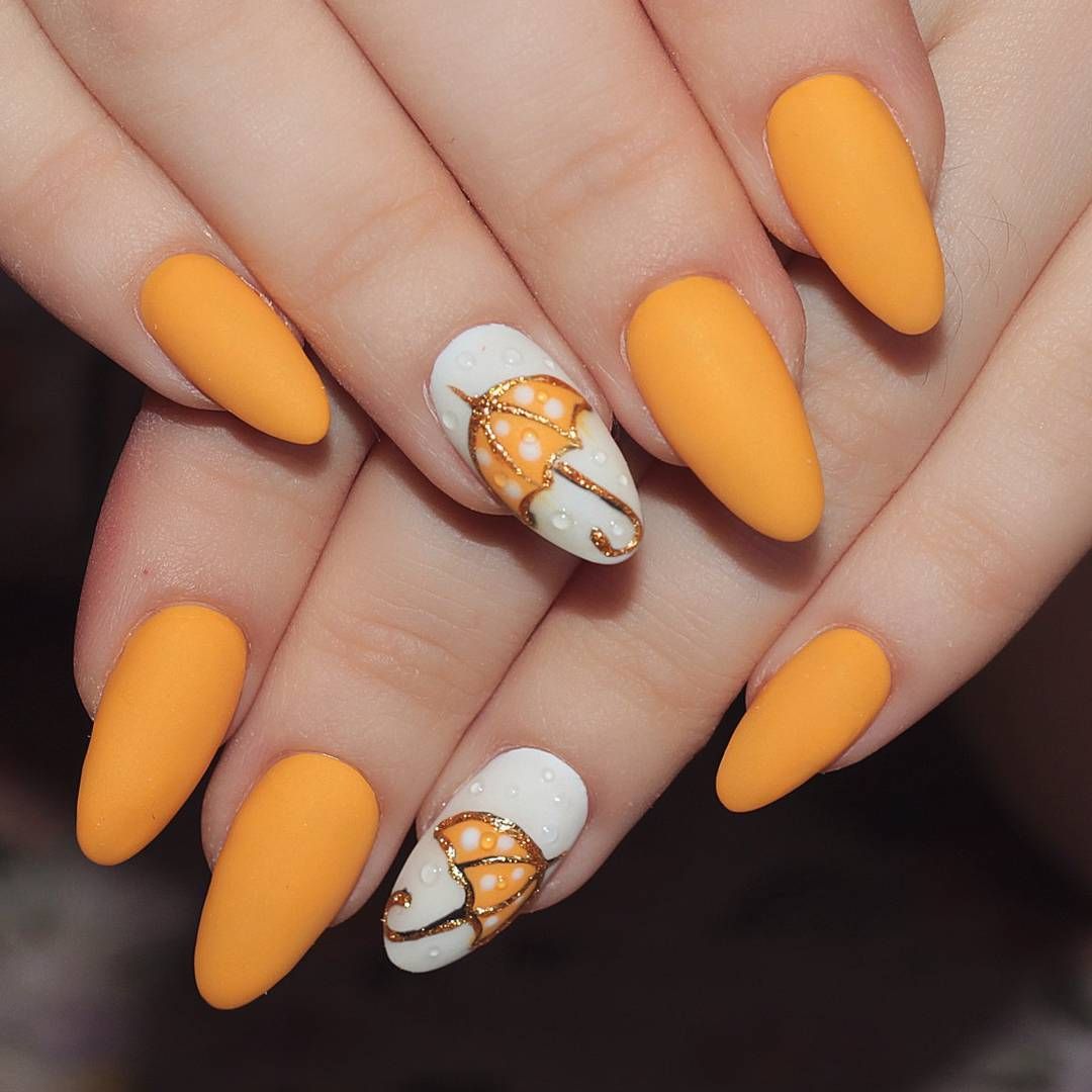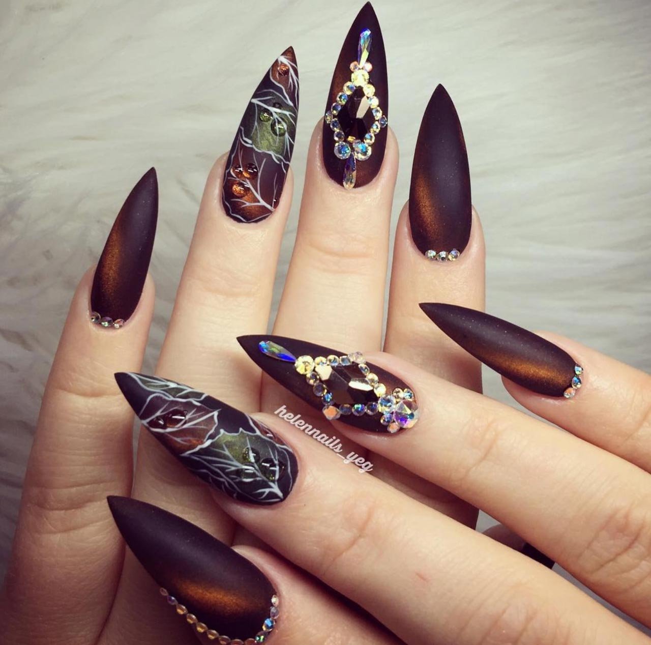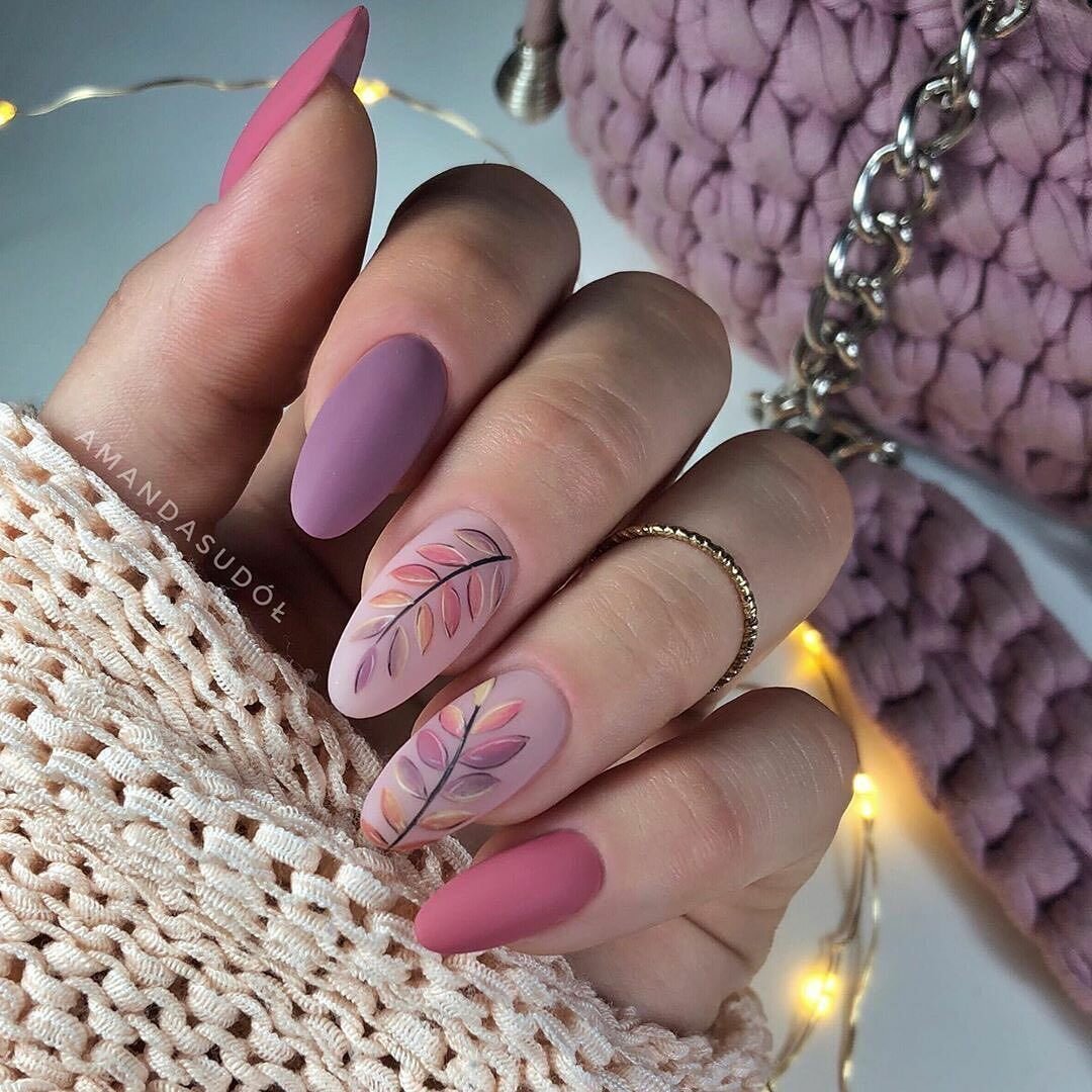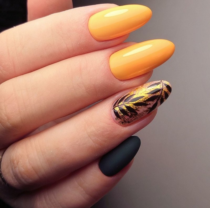 Длинные ноготки в осеннем маникюре позволяют отпустить фантазию в полет — вы можете выбрать любые оттенки лака. Ведь вам не нужно визуально удлинять пластину. Особенно стильно на большой длине будет смотреться матовая фактура. Здесь можно обойтись и без дополнительного дизайна.