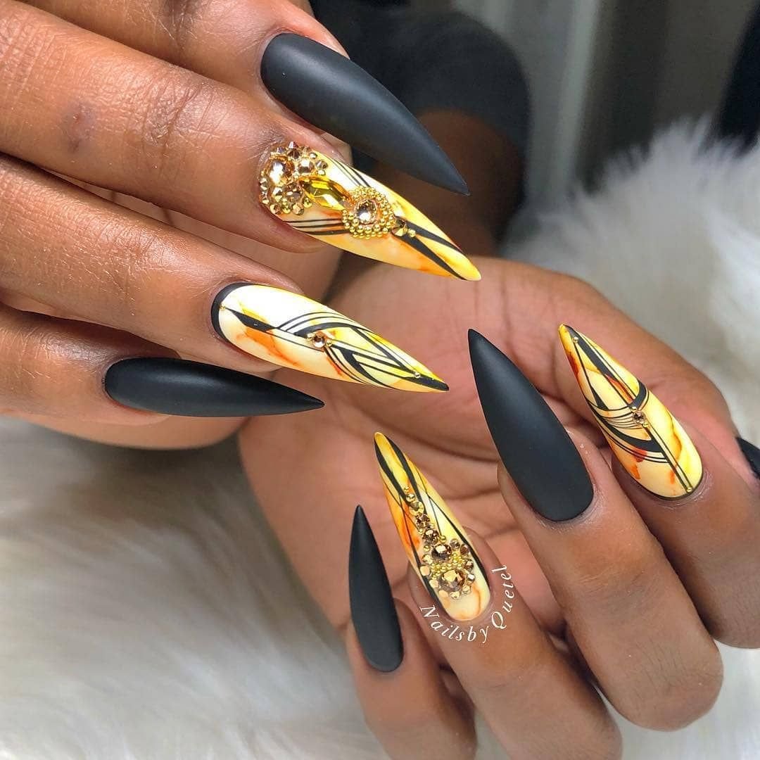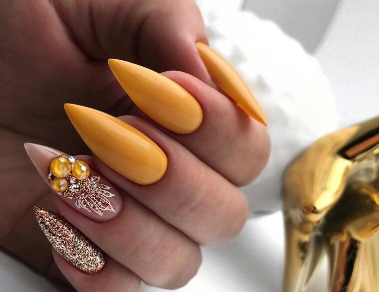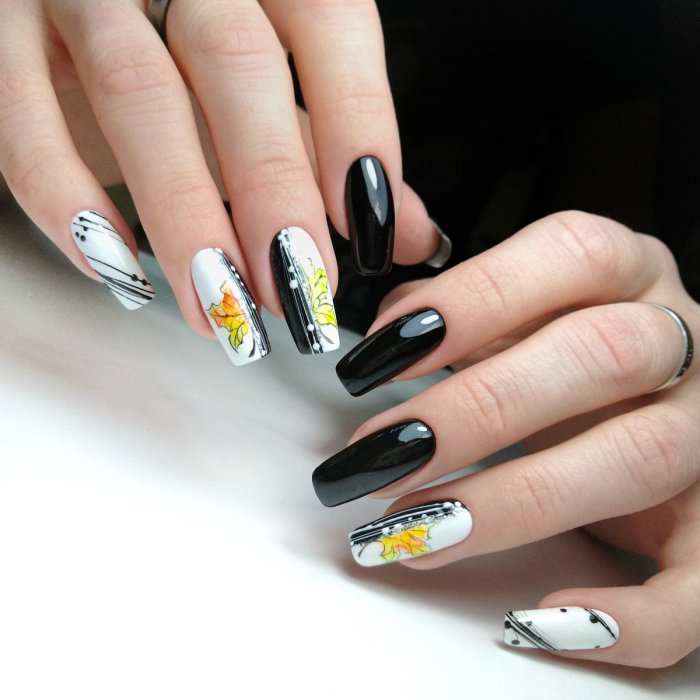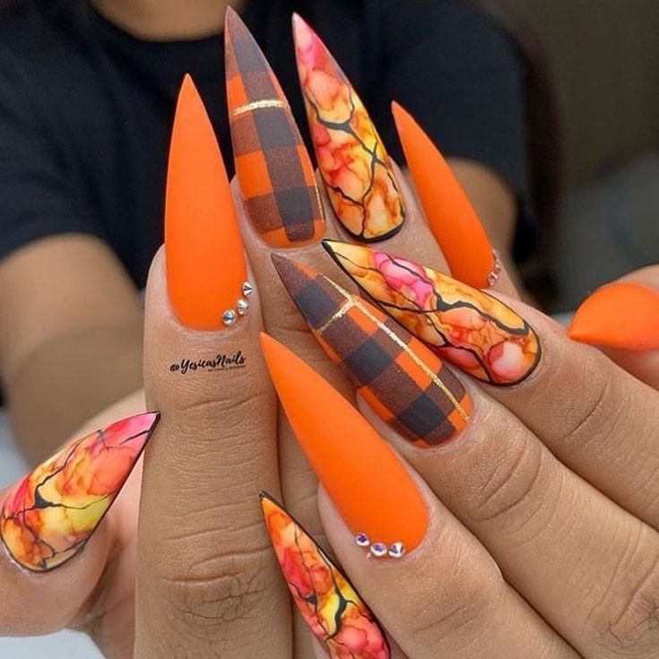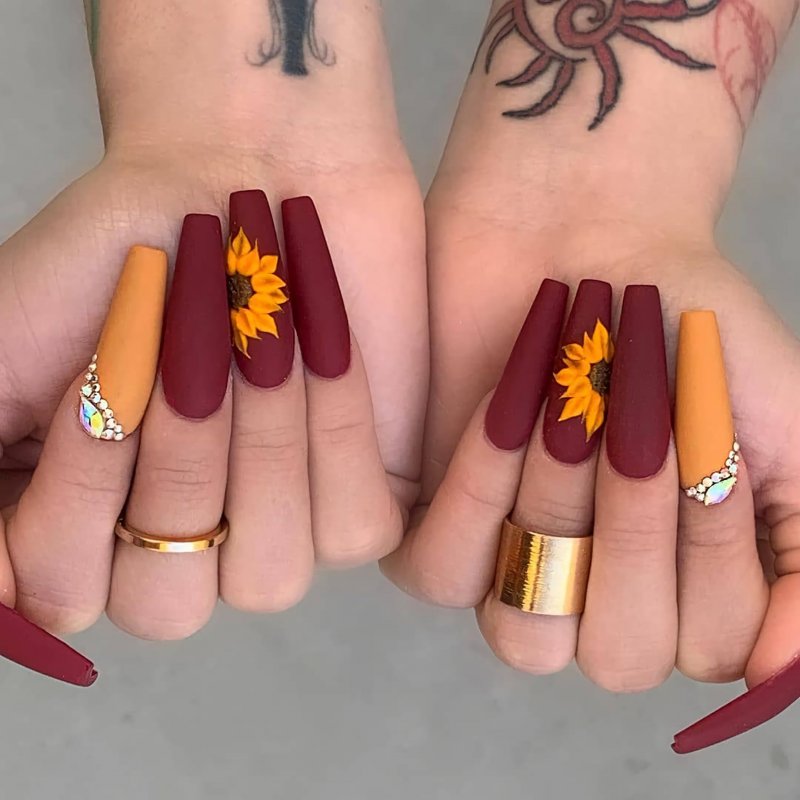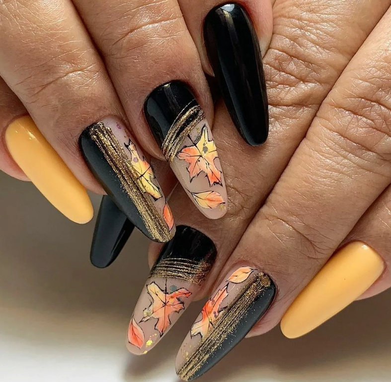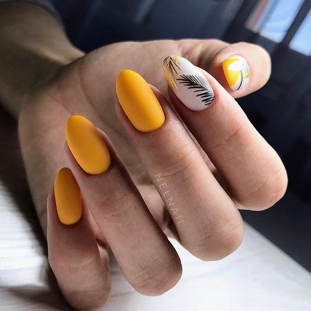 Длинные ноготки в осеннем маникюре позволяют отпустить фантазию в полет — вы можете выбрать любые оттенки лака. Ведь вам не нужно визуально удлинять пластину. Особенно стильно на большой длине будет смотреться матовая фактура. Здесь можно обойтись и без дополнительного дизайна.