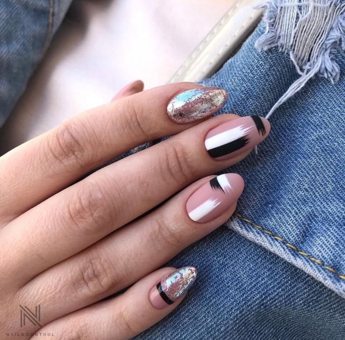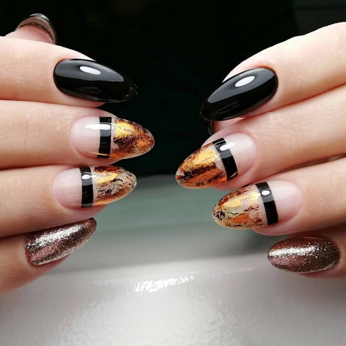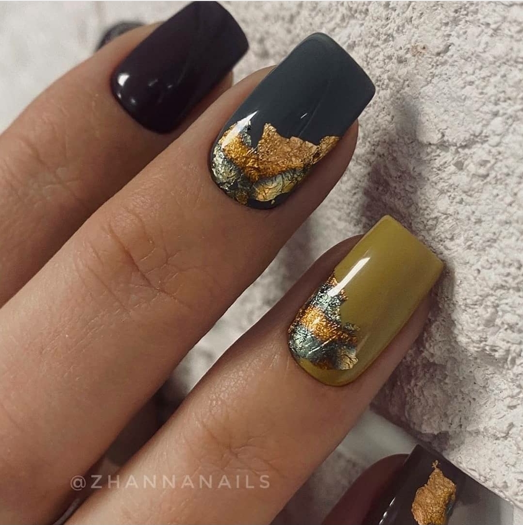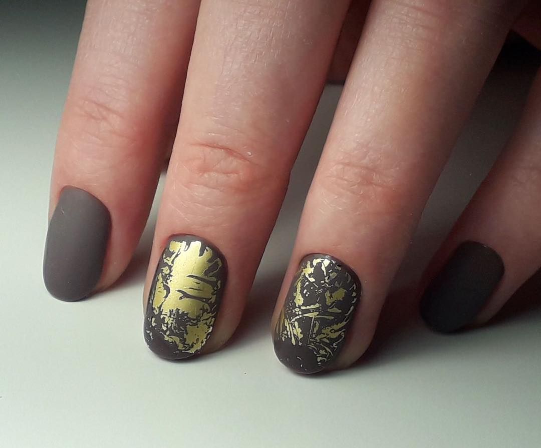 Для осеннего маникюра мастера советуют выбирать фольгу. Очень стильно смотрится сочетание матового топа и фольги контрастных оттенков. Фольгу вы можете располагать так, как позволяет фантазия. В новом сезоне 2026 мастера нейл арта предлагают выбирать особую технику, для которой используют кракелюр фольгу. Она создаст эффект состаренной фактуры.