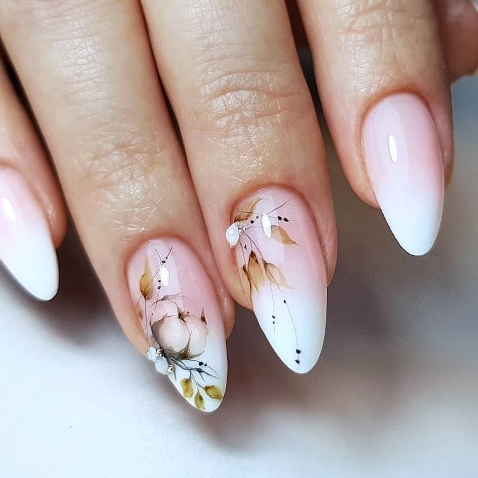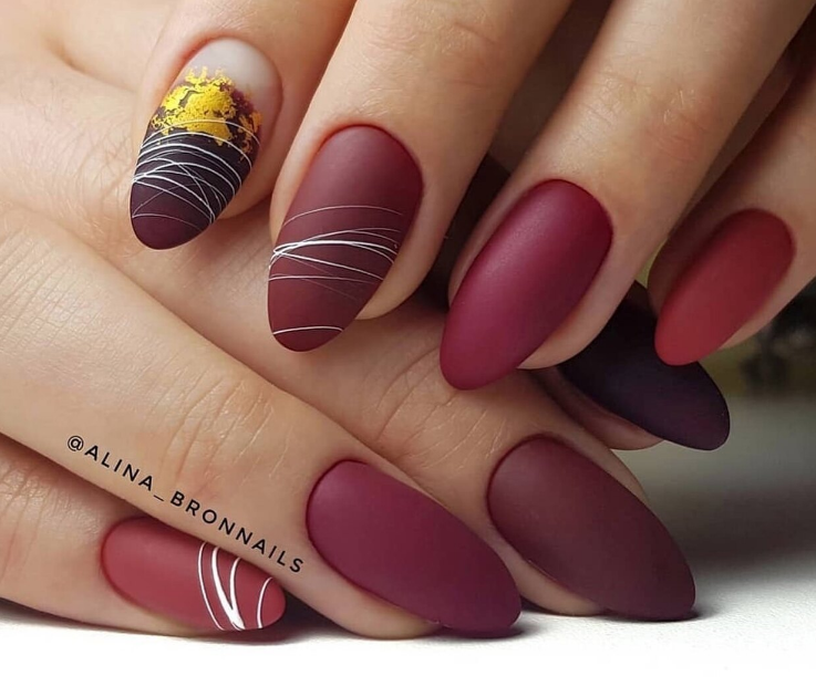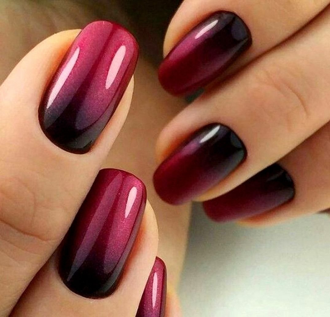 Градиент или омбре — популярная техника, которая применяется не один сезон. В осеннем маникюре лучше использовать близкие, а не контрастные оттенки. При желании градиентный дизайн можно дополнить рисунками или полосками, которые мастера советуют располагать посередине ноготка — вертикально. Так вы сможете вытянуть пластину визуально.