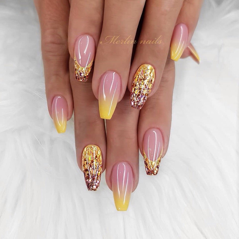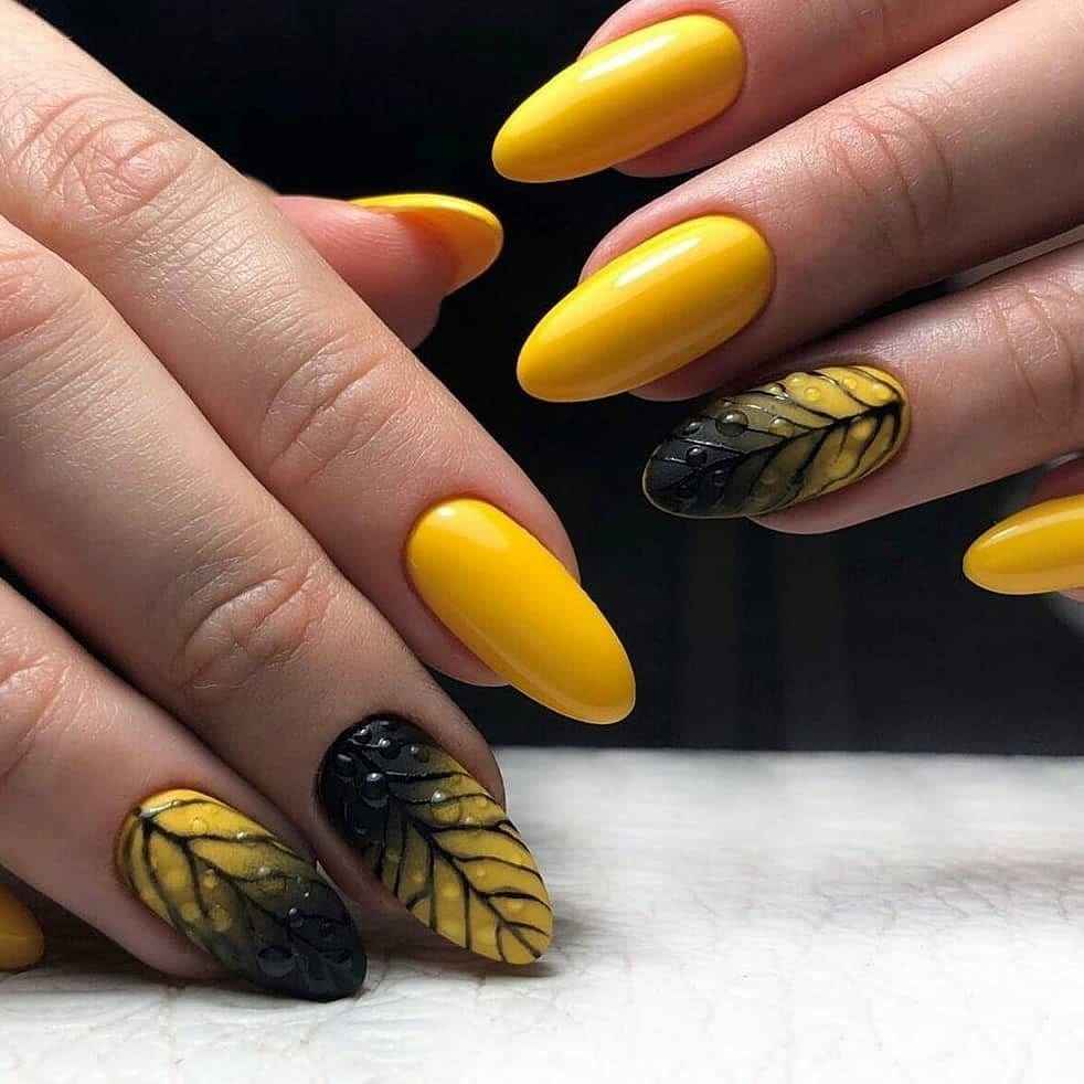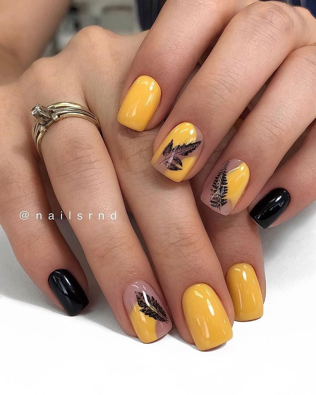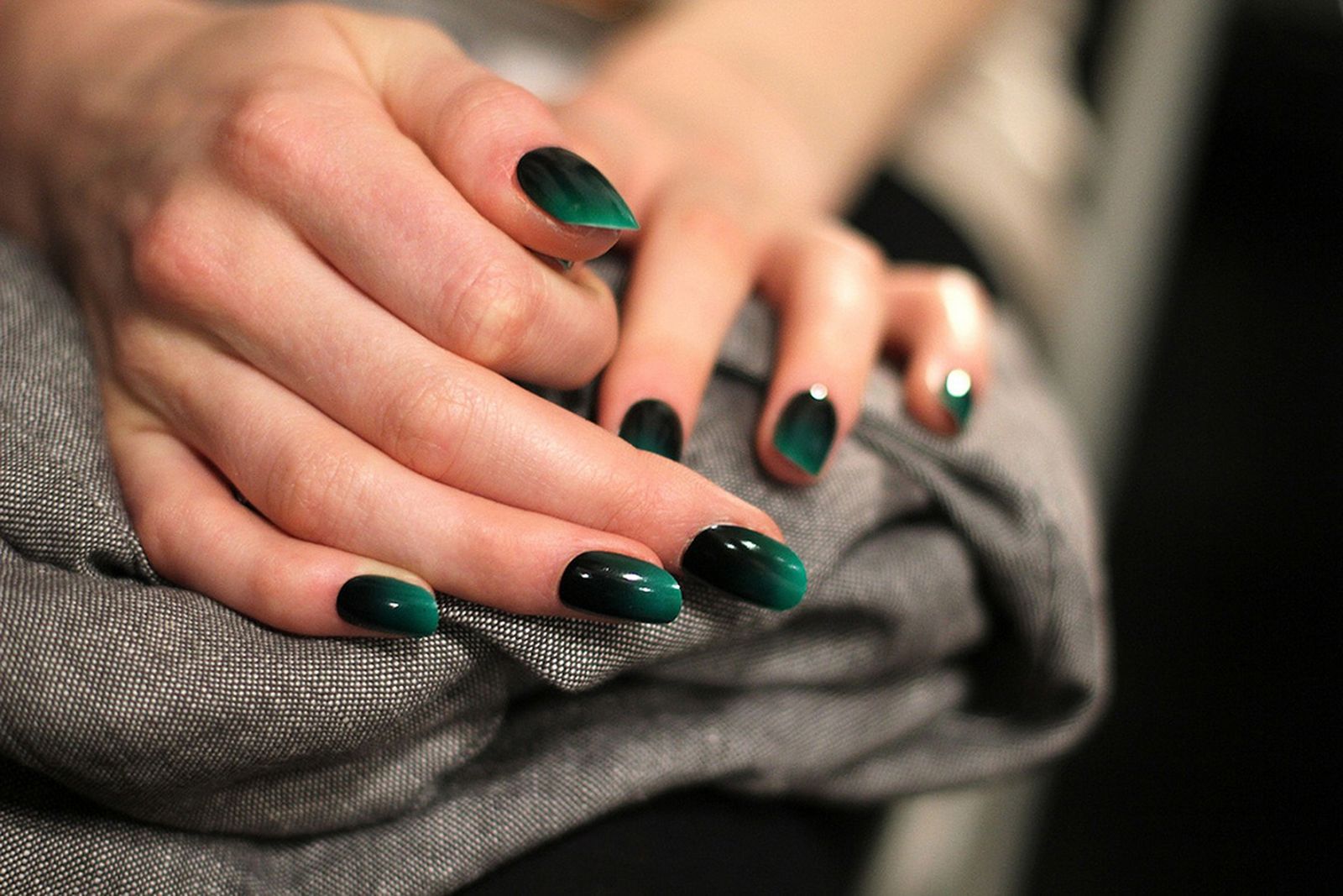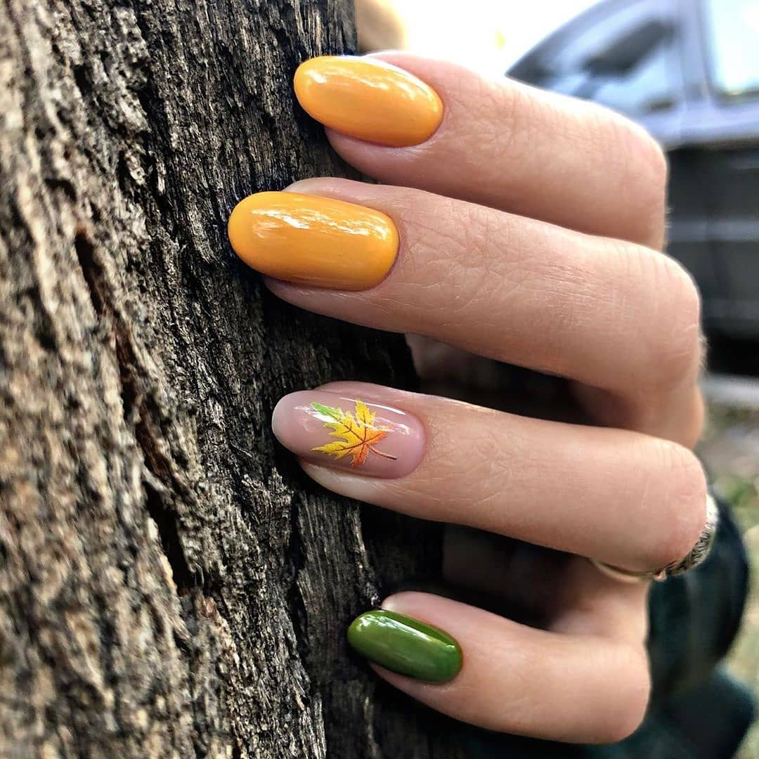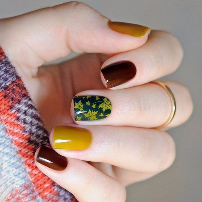 Разные руки — смелый и довольно популярный вариант дизайна ногтей. Для осеннего маникюра выбирайте сходные оттенки лака, растягивая их по ноготкам. Начать можно с теплого желтого и закончить темным шоколадом.