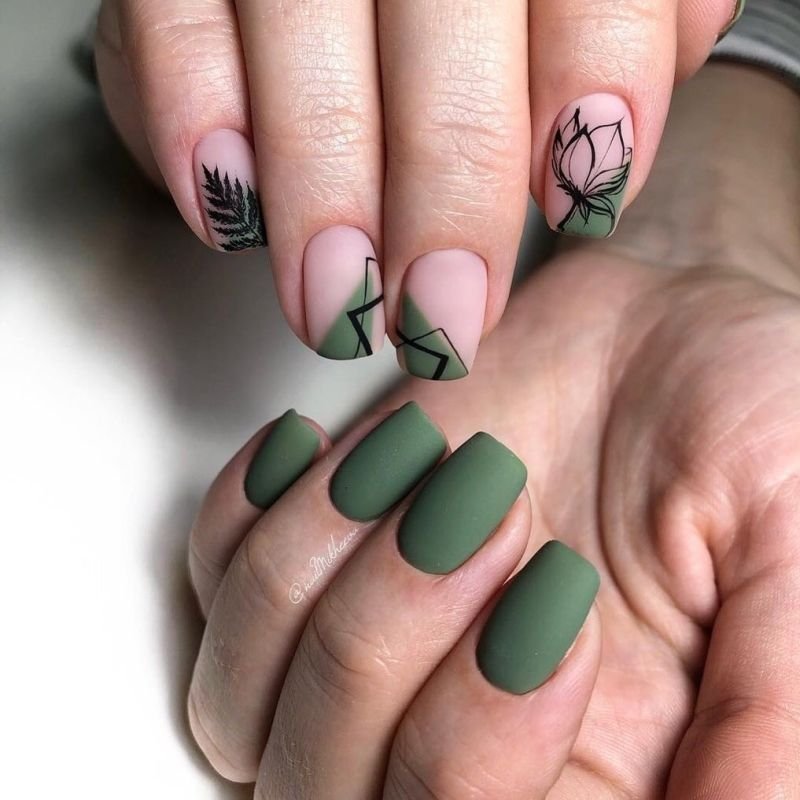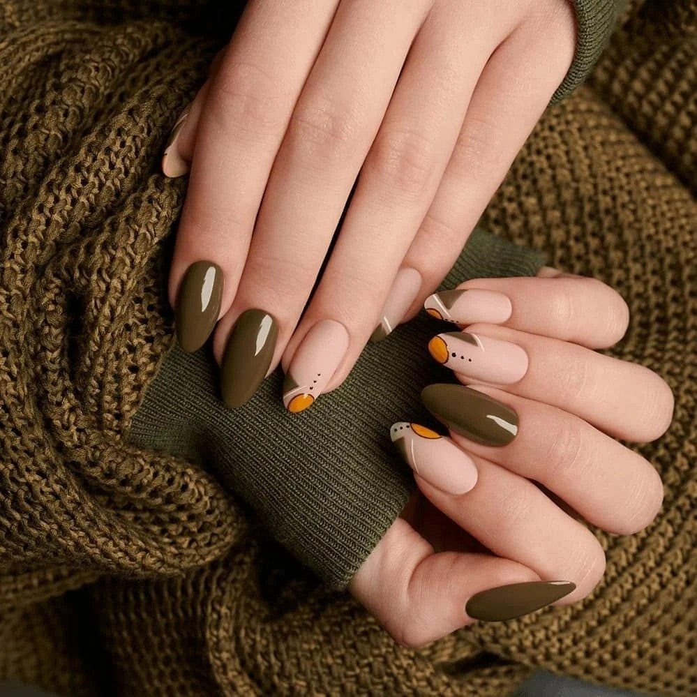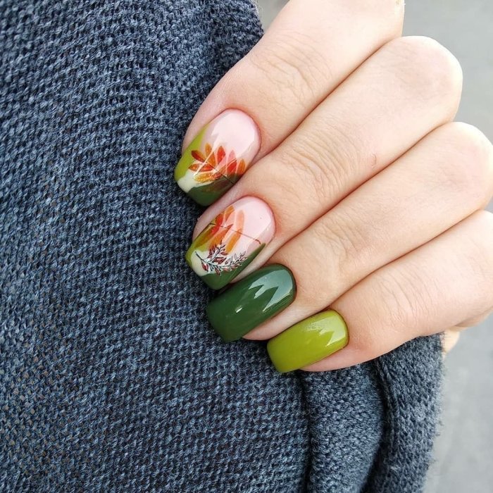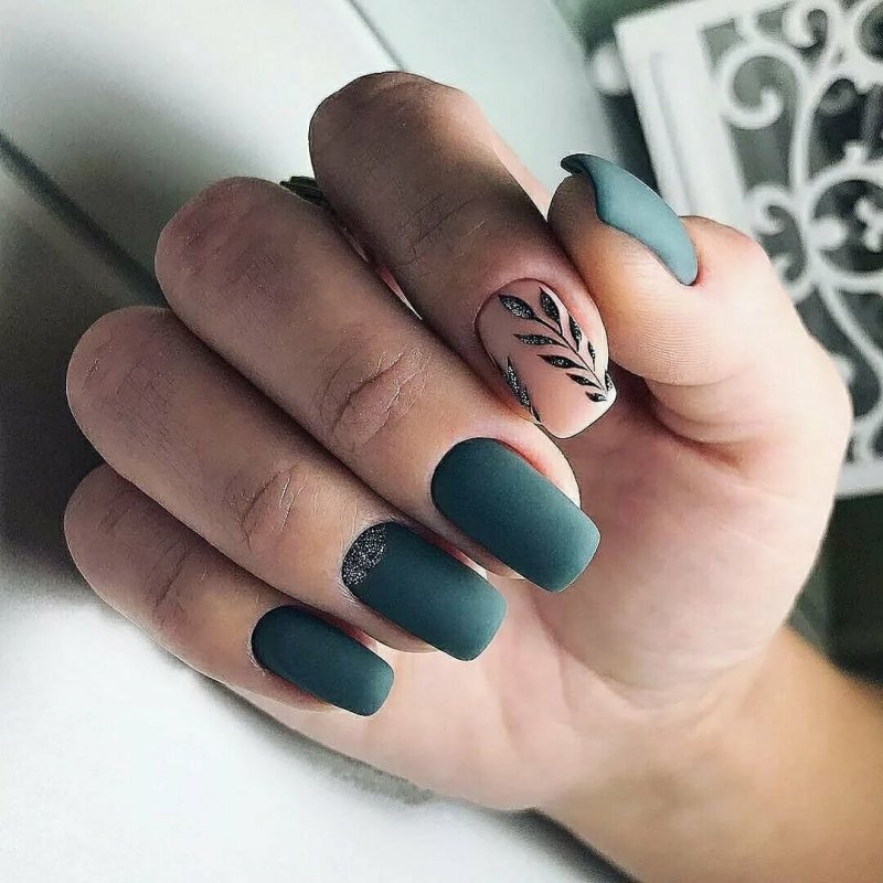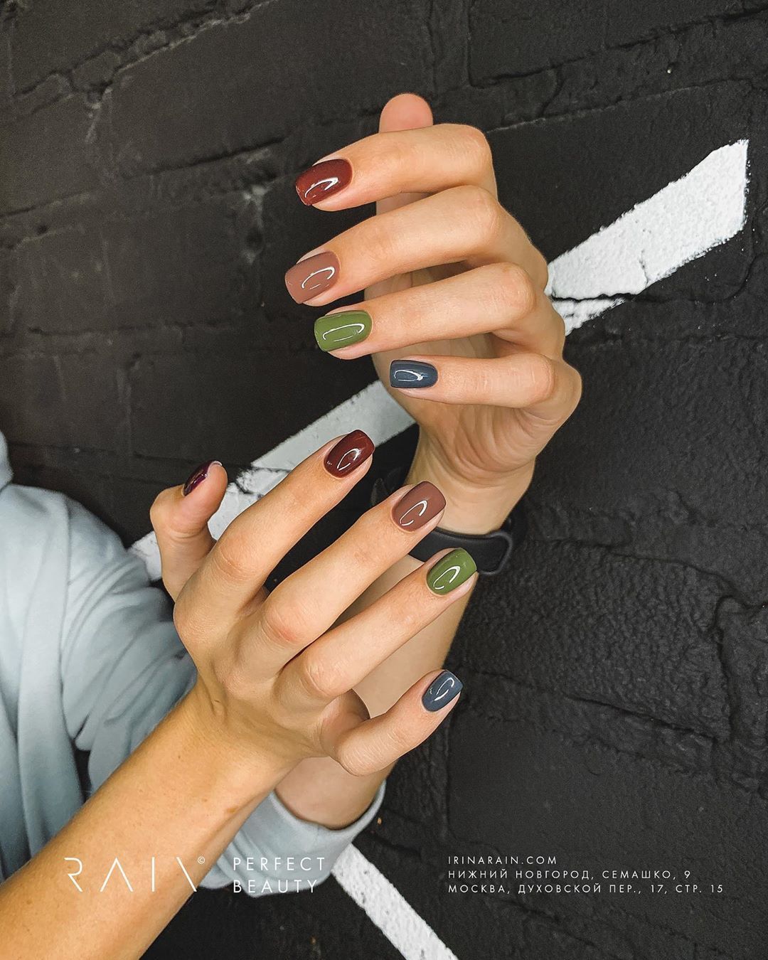 Самые актуальные в сезоне 2026 оттенки хаки: это и модный оливковый, и армейский зеленый. В осеннем маникюре вы сможете сочетать два самых модных направления — хаки и рисунок рябины. Только не перебарщивайте. Здесь актуально правило — минимализм или выделение всего одного ноготка.