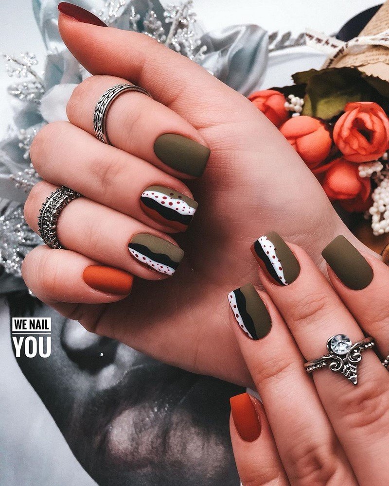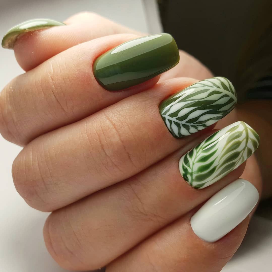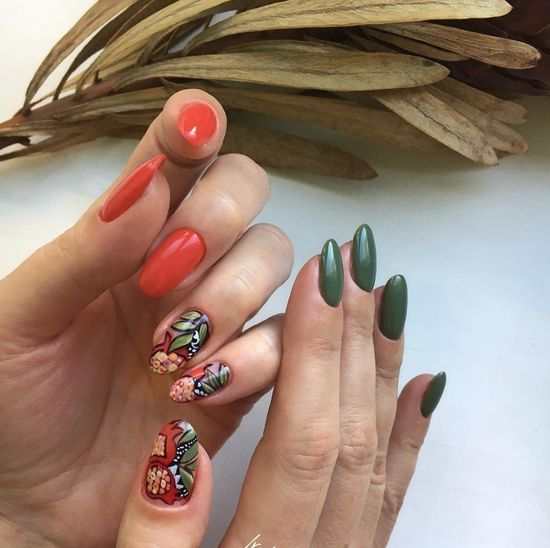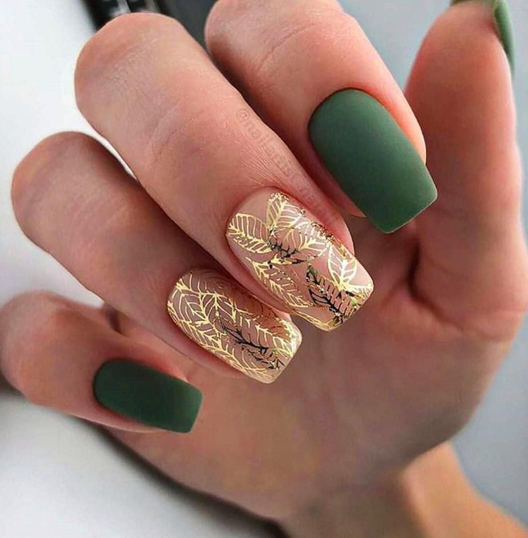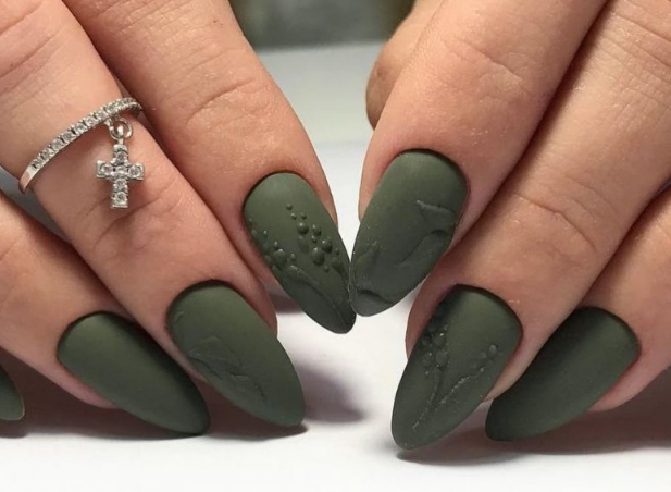 Самые актуальные в сезоне 2026 оттенки хаки: это и модный оливковый, и армейский зеленый. В осеннем маникюре вы сможете сочетать два самых модных направления — хаки и рисунок рябины. Только не перебарщивайте. Здесь актуально правило — минимализм или выделение всего одного ноготка.