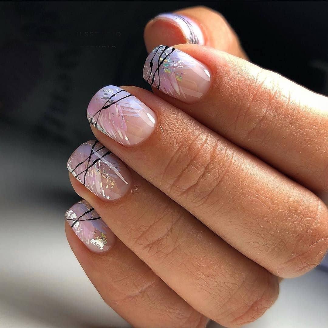 Не обязательно окрашивать ногти в густые плотные осенние цвета. С наступление холодного времени года можно не отказываться от полупрозрачных баз. Они отлично подойдут для довольно смелых и интенсивных вариантов дизайна — страз, блесток, рисунков с негативным пространством.