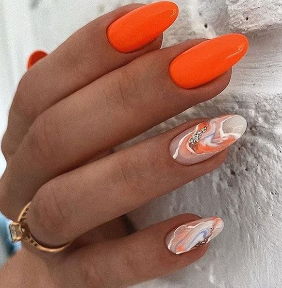 Мраморный дизайн — модная тенденция осени 2026. Для создания каменной фактуры на ногтях можно использовать нестандартные варианты цвета — оранжевые, коричневые, серые, красные и другие.