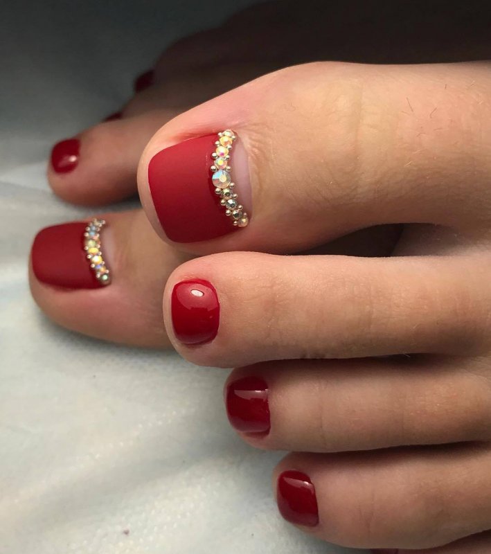 Интересный вариант ногтевого покрытия — матовый летний френч педикюр. Такое дизайнерское решение всё больше набирает обороты. Исполняется матовый френч матовым лаком различных оттенков и цветов. Наиболее популярными являются синий, голубой, тёмно-зелёный, красный, бордовый, оранжевый, светло-жёлтый. На матовый лак можно в небольших количествах наносить глянец. Однако, чтобы не вышла нелепость, стоит заострить внимание на сочетании тонов. Также на матовую поверхность некоторые мастера наносят одноцветные стразы, делают серебряные или золотые узоры или наклеивают такие же полоски, рисуют сердечки или цветы. Цветовая гамма основного покрытия и рисунка не должны отличаться.