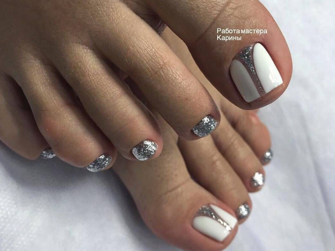 Французский маникюр на ногах с блестками