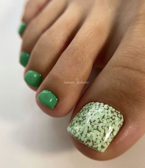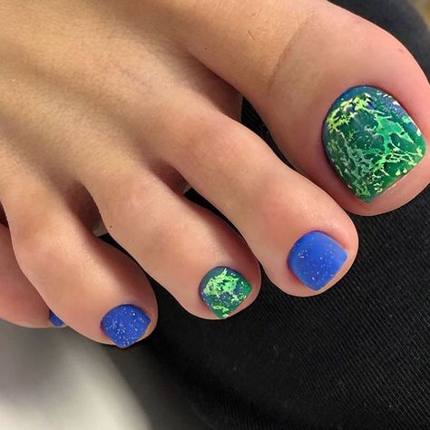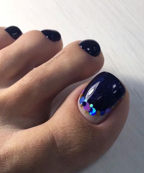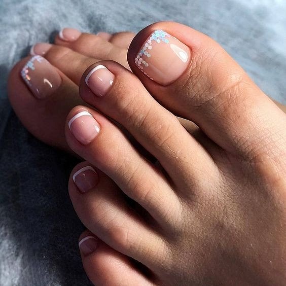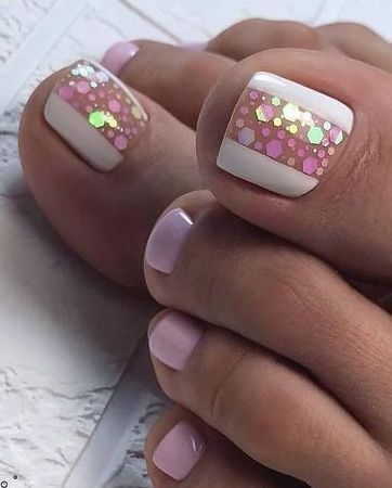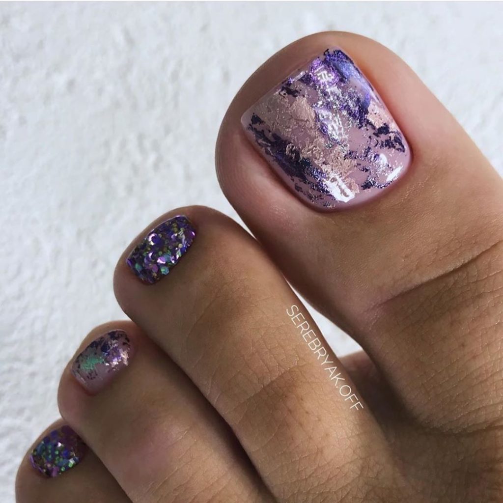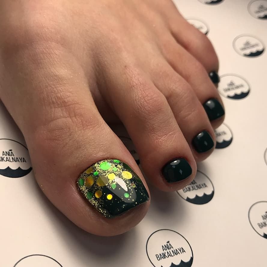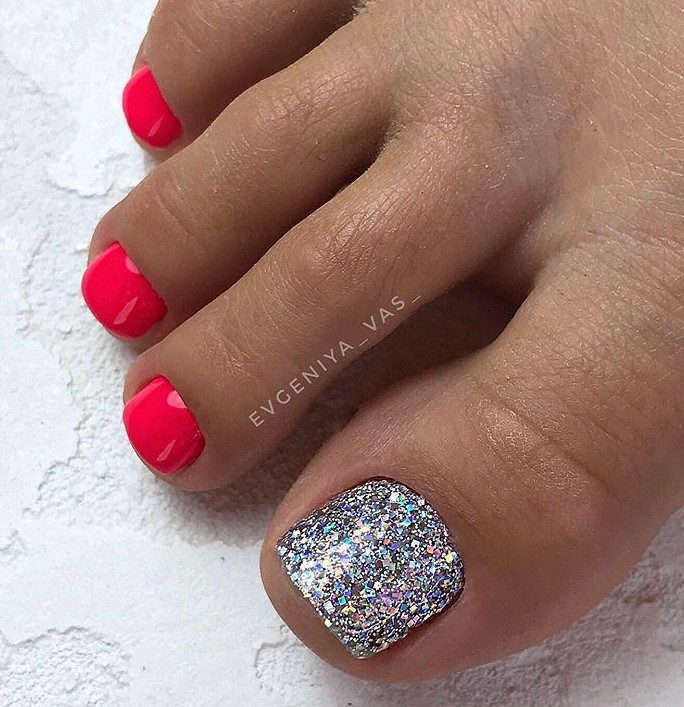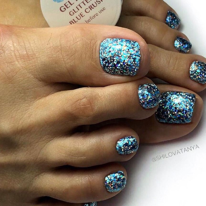 Блестки — отличное решение для педикюра. Использовать стразы здесь довольно проблематично из-за непрактичности такого дизайна, а вот блестки отлично подходят как для выделение одного пальчика полностью или создания небольших акцентов на каждом.