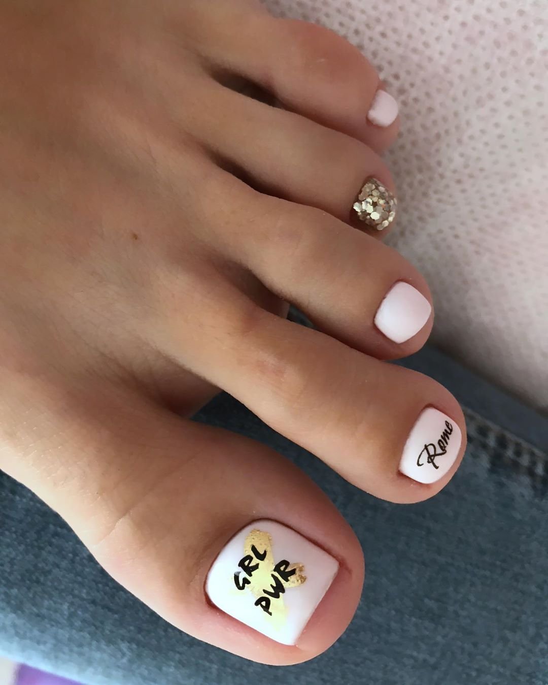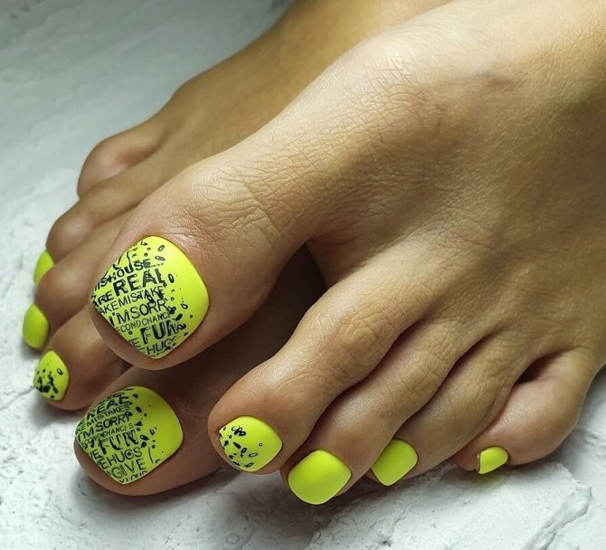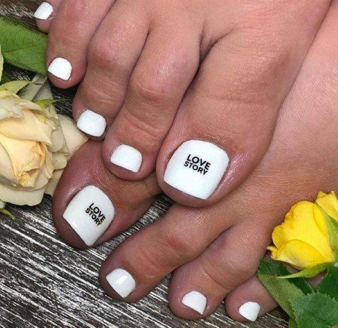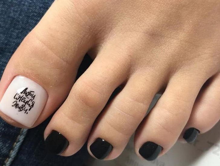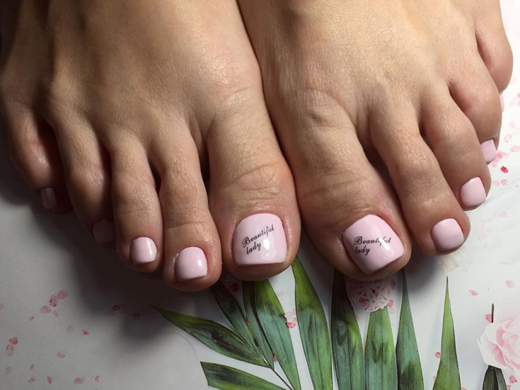 Интересные и простые надписи — хорошая идея для педикюра. Как правило, для акцента мастер выбирает ноготь большого пальца. А для азы вы можете выбрать матовую текстуру. На бархатистой основе надпись выглядит заметно и стильно.