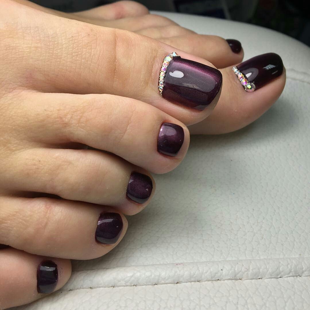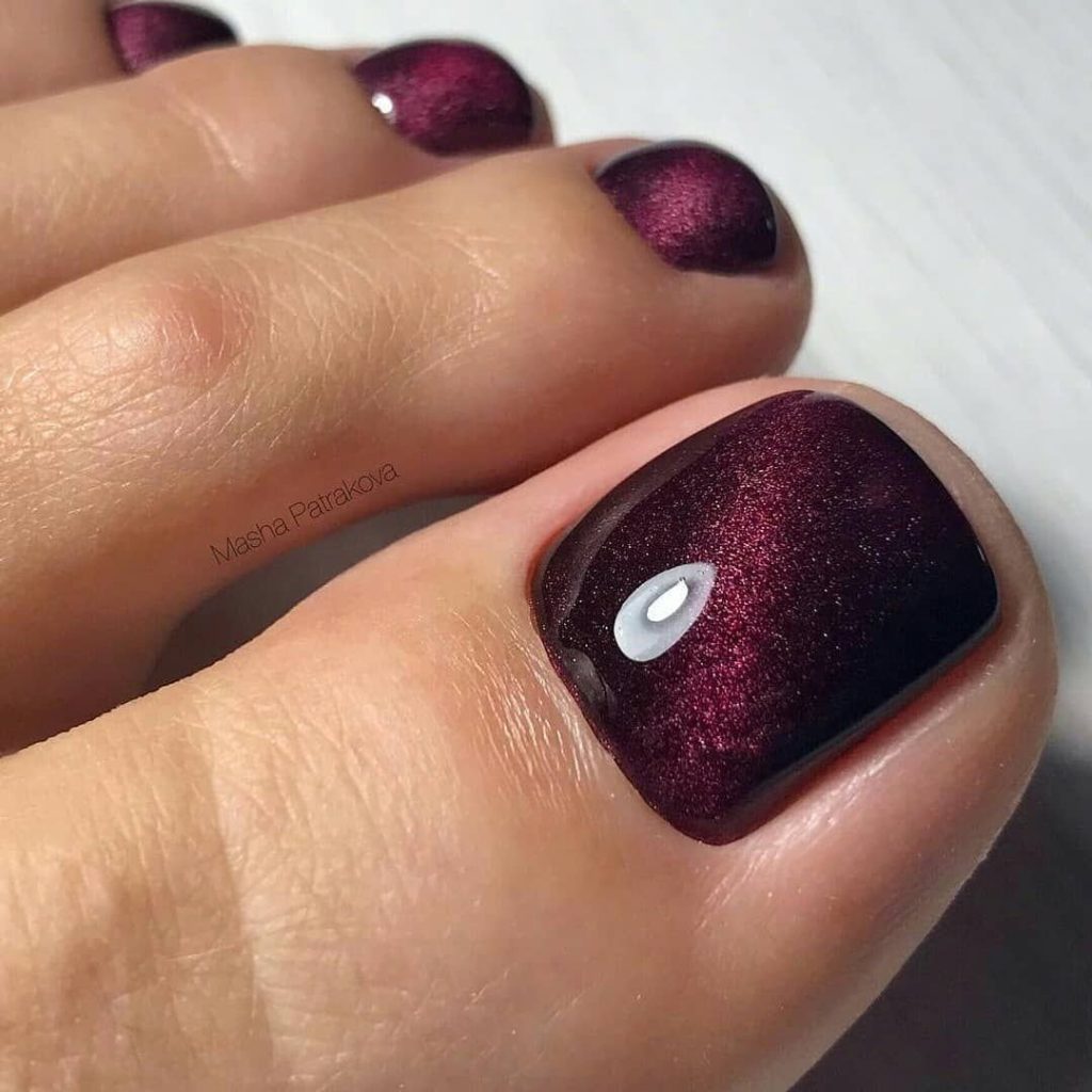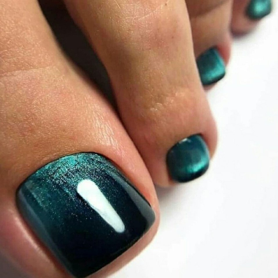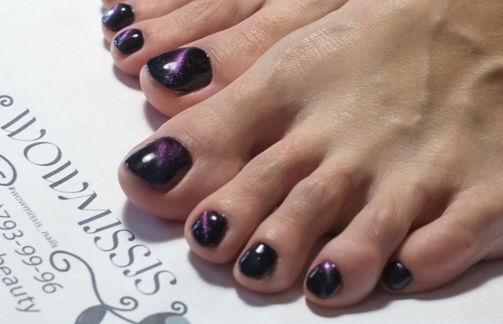 Еще один простой способ сделать дизайн педикюра ярким, но практичным. Загадочный блеск магнитного лака придает ноготкам эффект 3д. Чтобы выполнить дизайн в этой технике не обязательно идти в салон. Вы можете купить состав в любом магазине. Кроме того, понадобится магнит, которым можно менять направление блесток в составе. С его помощью можно создать замысловатый интересный узор.