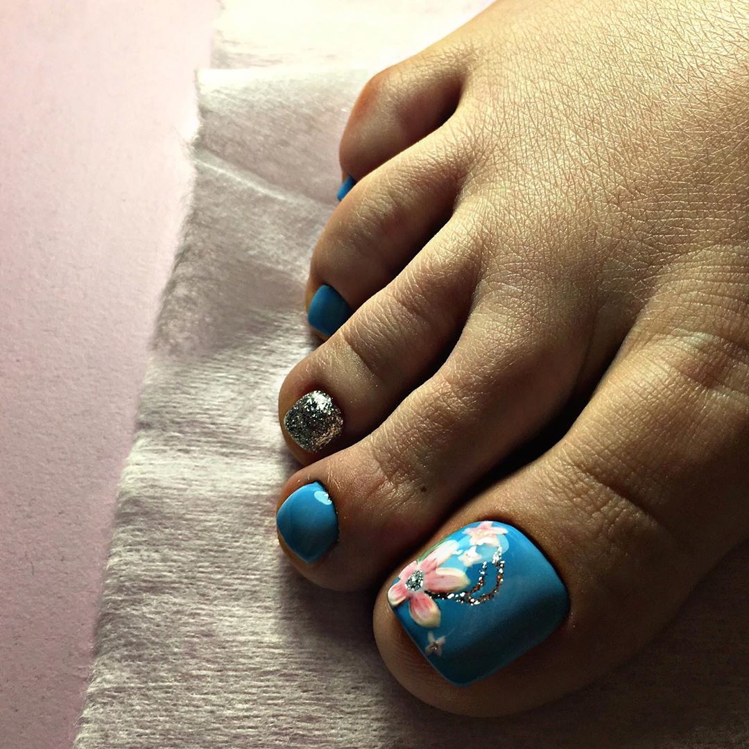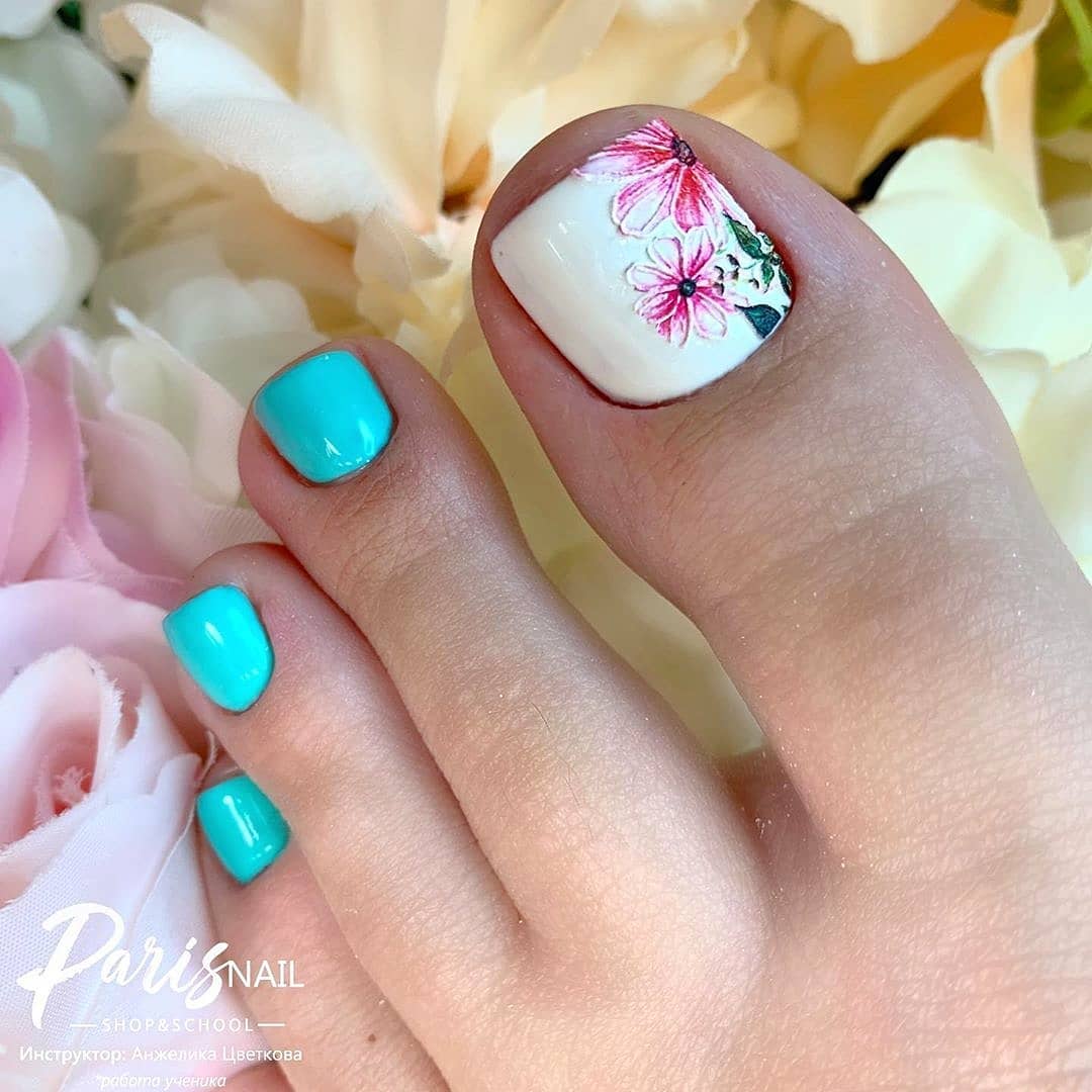 Конечно, педикюр с цветами хорош сам по себе. Он очень актуален весной и летом. Но иногда модницам он кажется скучным и хочется сочетать его с какой-нибудь модной техникой. Как правило, такое сочетание касается только большого пальчика ноги, поскольку размер его пластины позволяет проводить некоторые эксперименты. остальные ногти имеют довольно маленькую площадь и здесь обычно остается только играть с текстурами — матовая или глянцевая — или цветом.