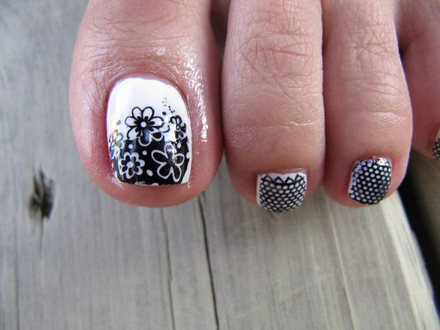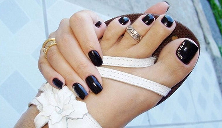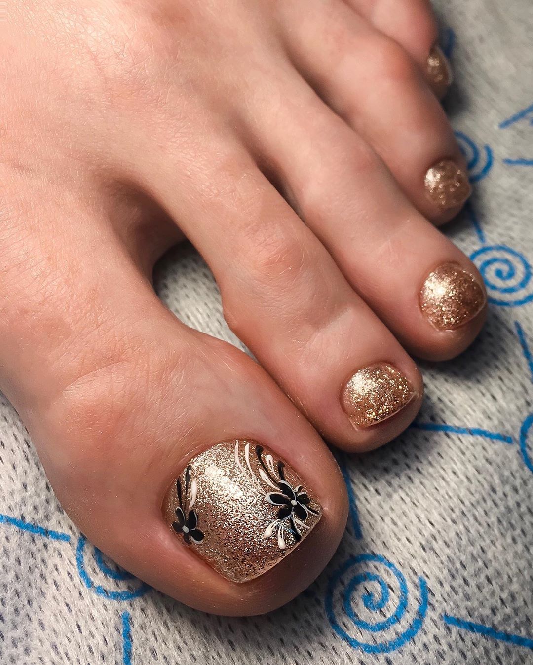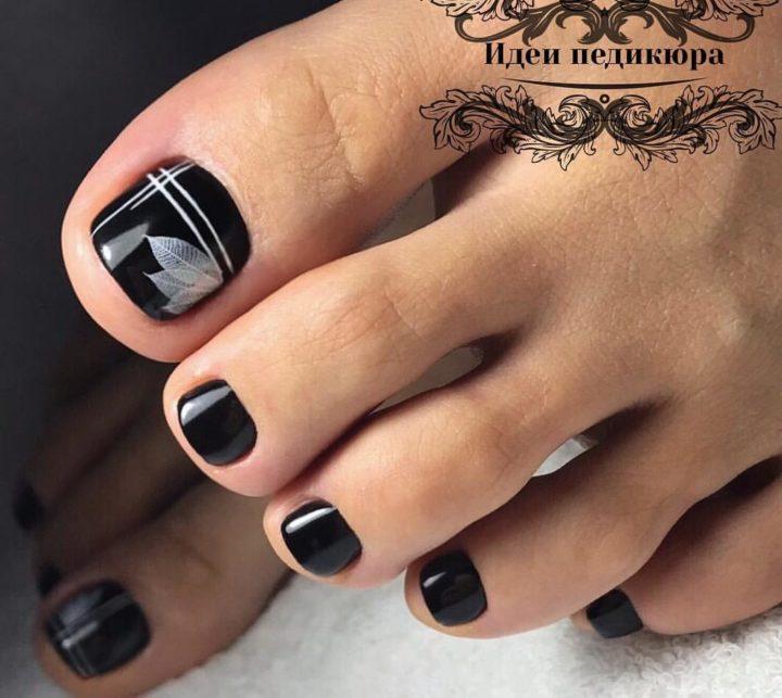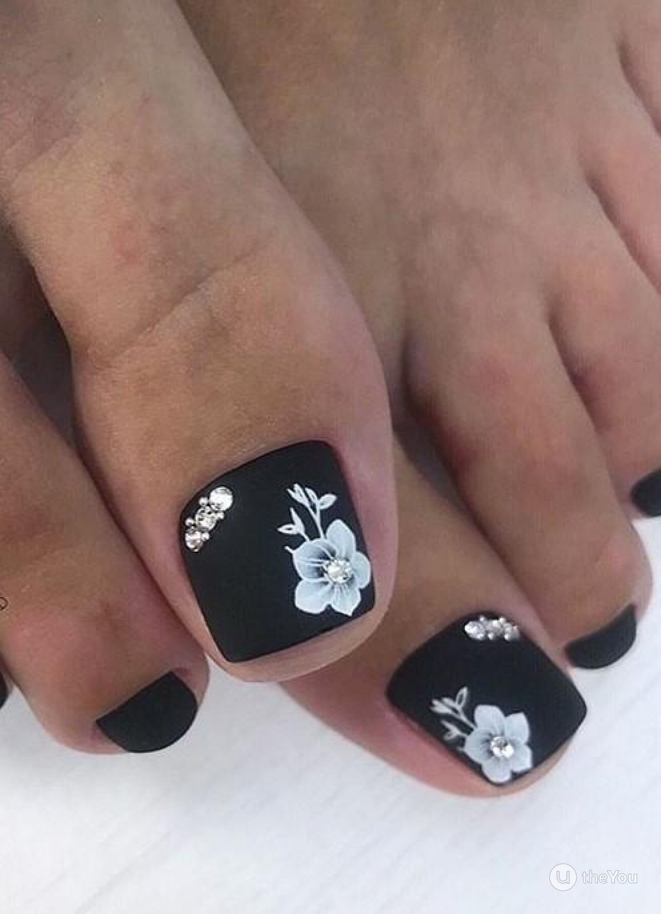 Черный педикюр с цветами чаще всего делают в монохромном исполнении. То есть цветы наносят с помощью белого лака- кистью или в технике стемпинга. Другой распространенный вариант — золотой или серебряный контур. Часто такой дизайн дополняют стразами или пигментом, который придает ноготкам незабываемый стальной блеск.