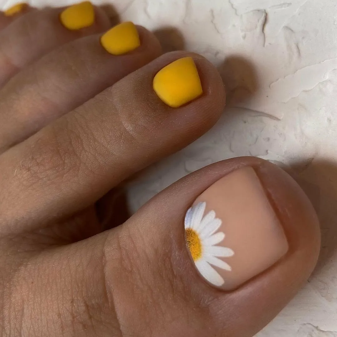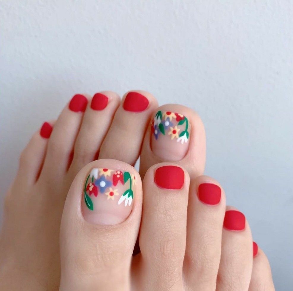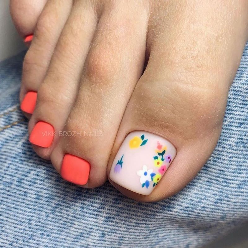 Матовая текстура актуальна в маникюре и педикюре. Ноготки выглядят так, словно их покрыли бархатом. И на этой базе цветы смотрятся особенно нежными и эффектным. Кстати, отличная идея — сочетать в одном дизайне две текстуры. Например, большой пальчик оформить матовым лаком, а остальные глянцевым.