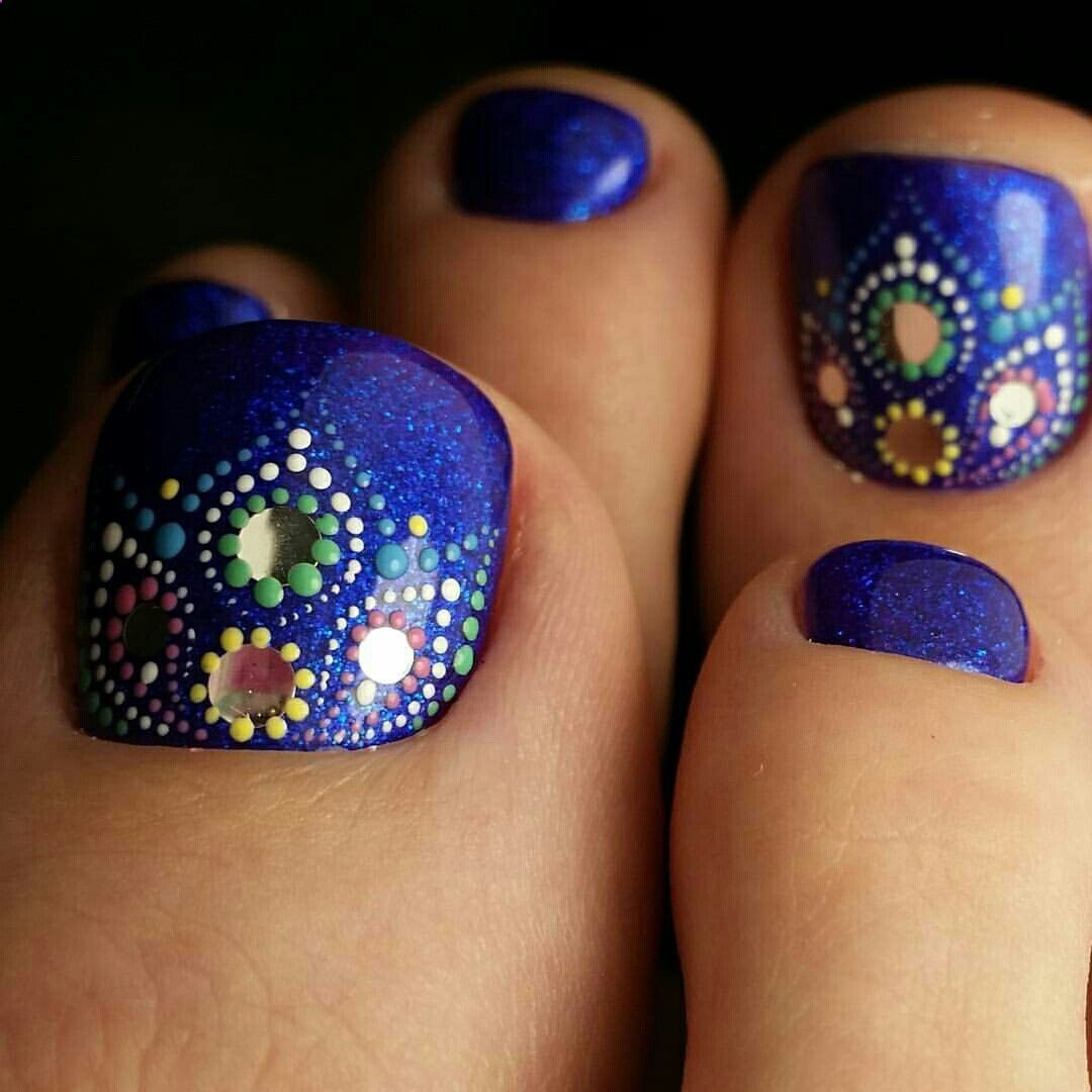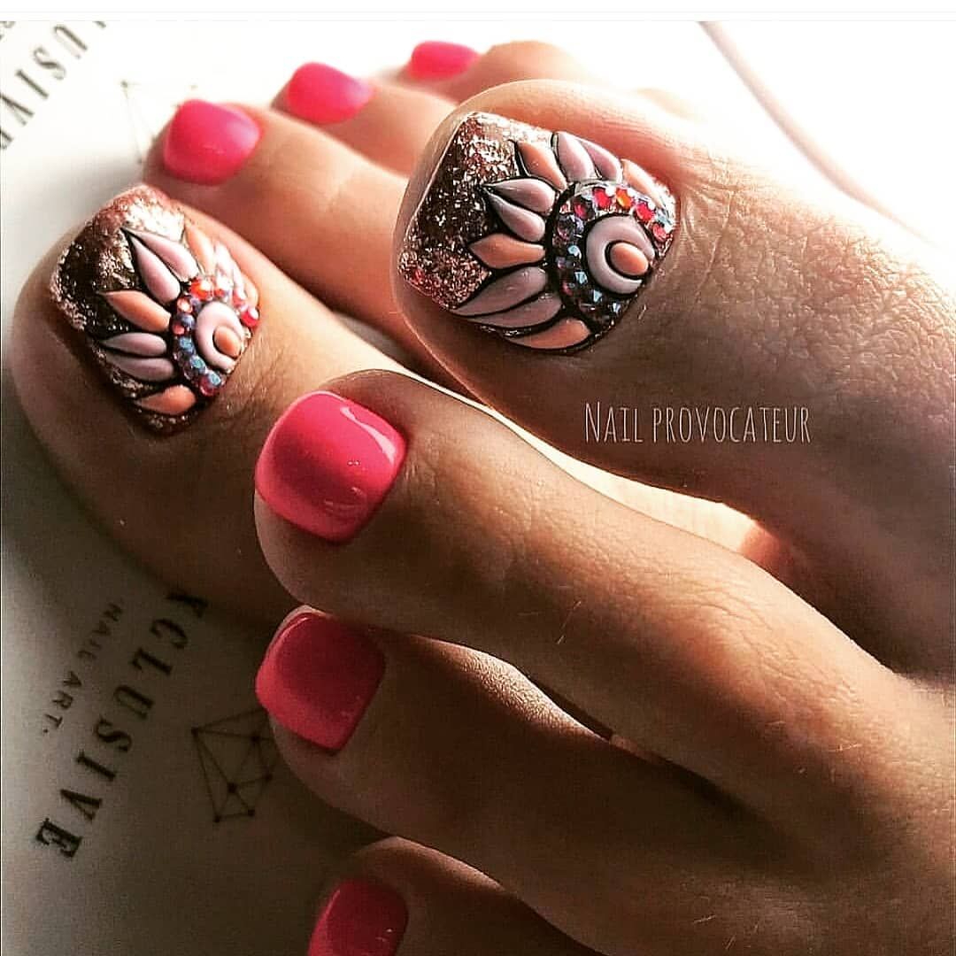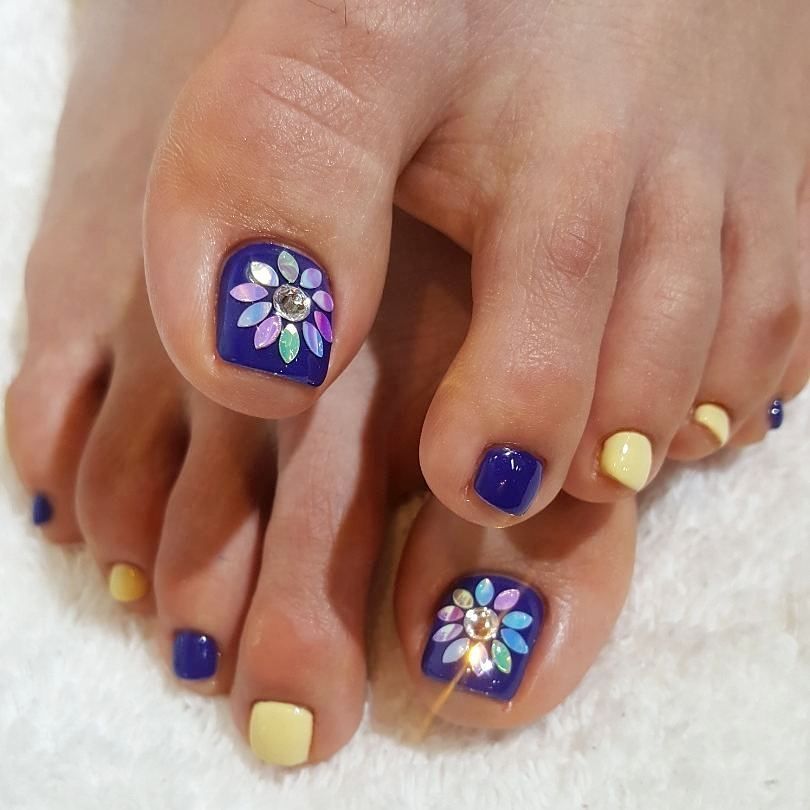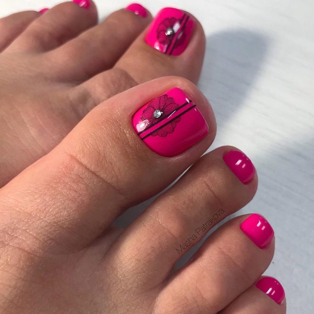 Это еще один и довольно необычный способ сформировать рисунок цветка в педикюре. Такой вариант дизайна подходит для летних деньков, но сделать его можно и весной. Все просто — выбираем актуальный рисунок, наносим на пластину контур (по трафарету или придумываем самостоятельно) и наклеиваем камни. Завершающий этап самый важный. Нужно будет тщательно проверить крепление страз и покрыть дизайн несколькими слоями закрепителя.