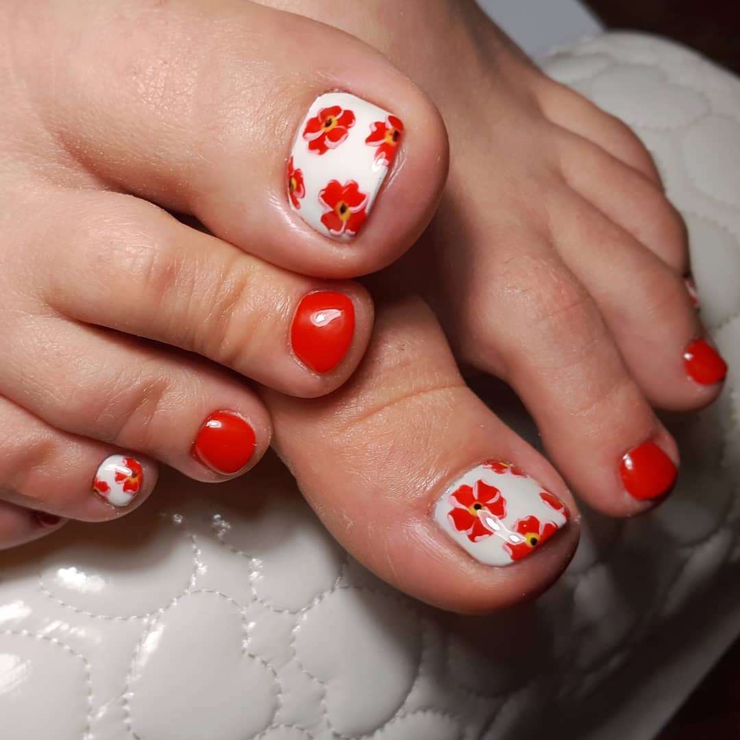 Тут нет сомнения — красный педикюр выбирают страстные и увлекающиеся натуры. А желание дополнить дизайн цветами выдает романтическую половинку такой дамы. Какой цветок лучше всего сочетается с красным лаком? Конечно же — роза! Объемная и очень красивая царица садов украсит ногти и сделает образ модницы законченным и эффектным. Но с красной палитрой отлично смотрятся и другие цветы — георгины, пионы, бархатцы и др.