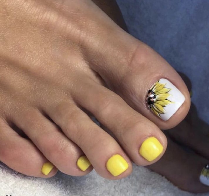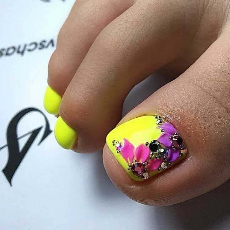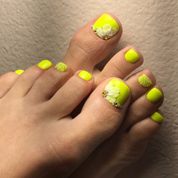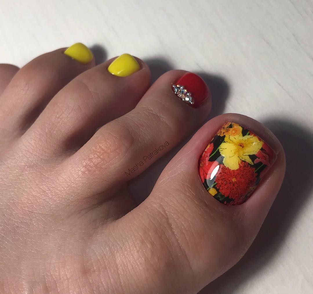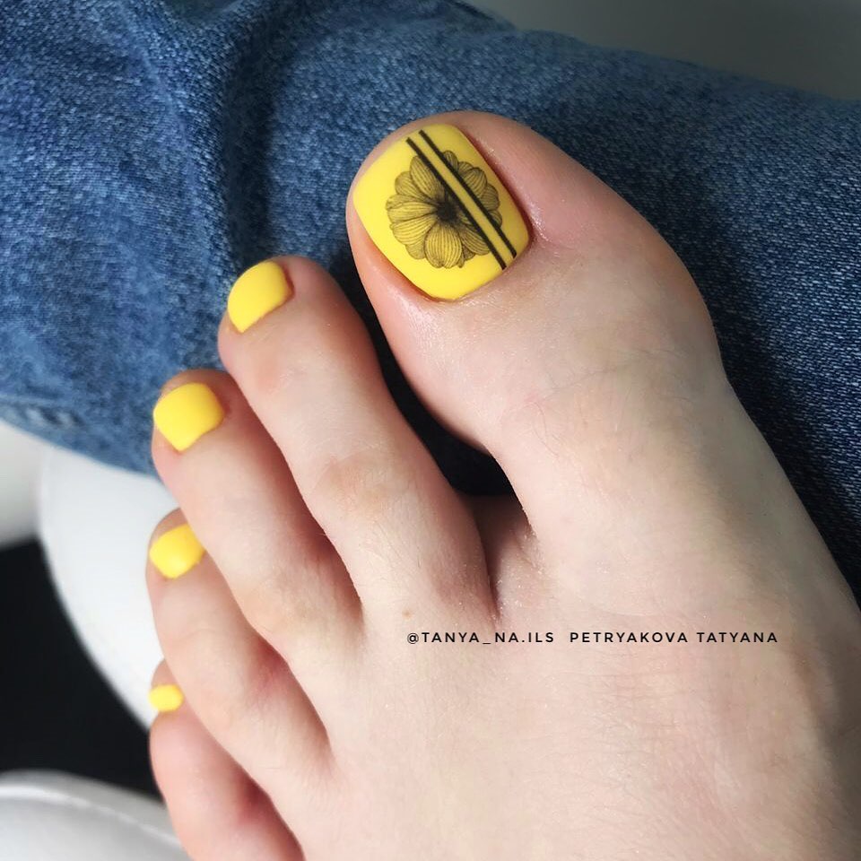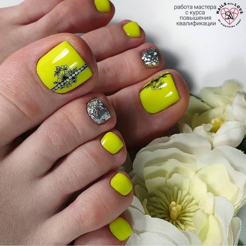 Все оттенки желтого — это напоминание о теплом и ласковом солнце. На такой базе отлично смотрится дизайн с цветами — мелкими или крупными роли не играет. Дополнить педикюр можно блестками, стразами, камифубуки или фольгой. Очень стильно смотрится вариант педикюра. где цветы наносят в технике стемпинга черным цветом, а некоторые их части выделяют маленькими цветными стразами.