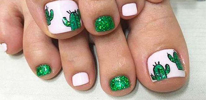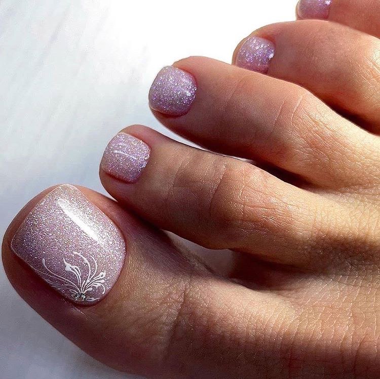 Чаще всего при создании модного педикюра выделяют ноготь на большом пальце ноги. Но на этом модницы не останавливаются и часто делают еще пару акцентов. например, полностью покрывают блестками один из ноготков.