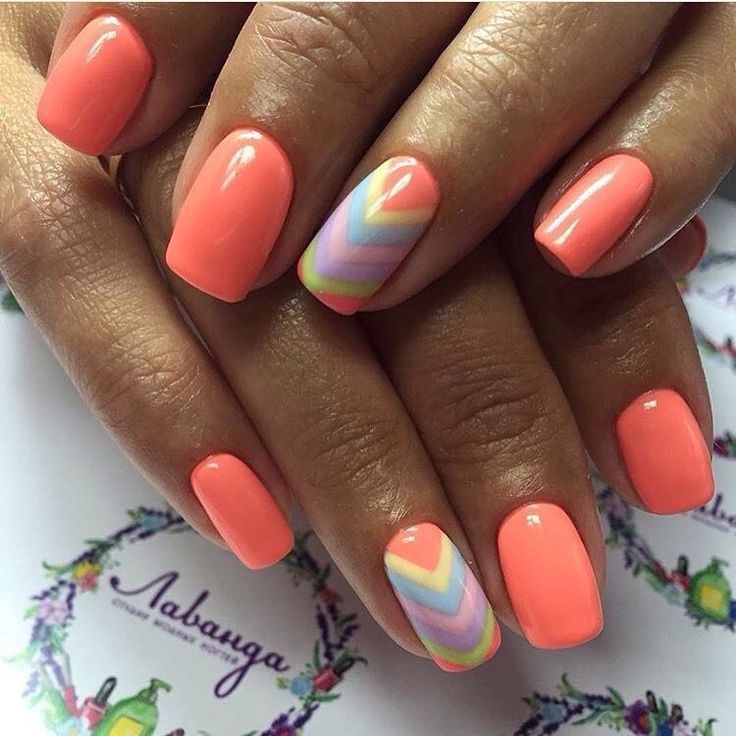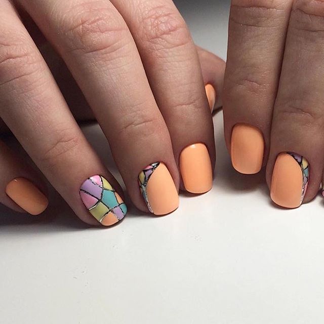 Его можно использовать вместе со стразами, с геометрическими рисунками, и блестками… Да с чем угодно! Разноцветный скотч для маникюра смотрится отлично на персиковых ногтях, главное – подобрать гармоничное цветовое сочетание.