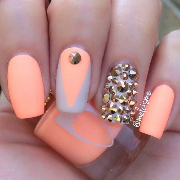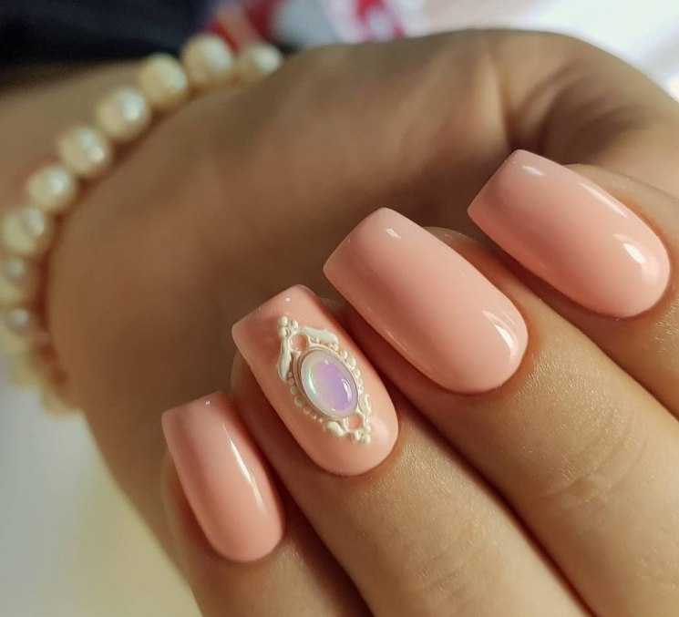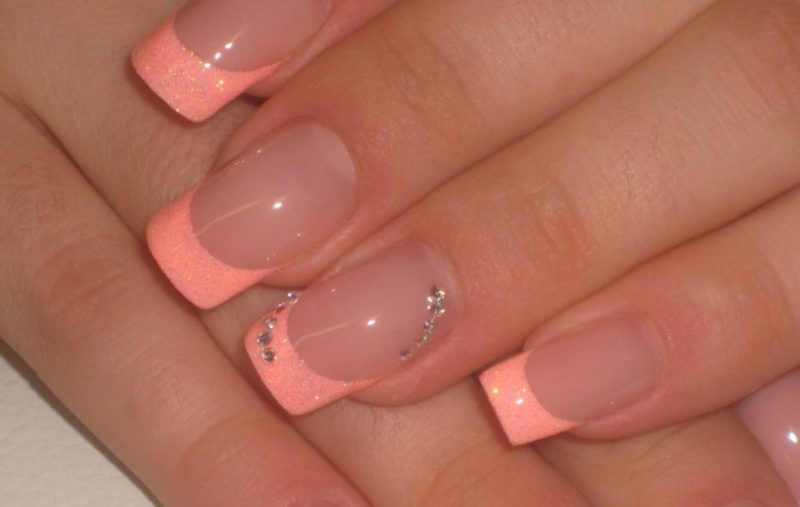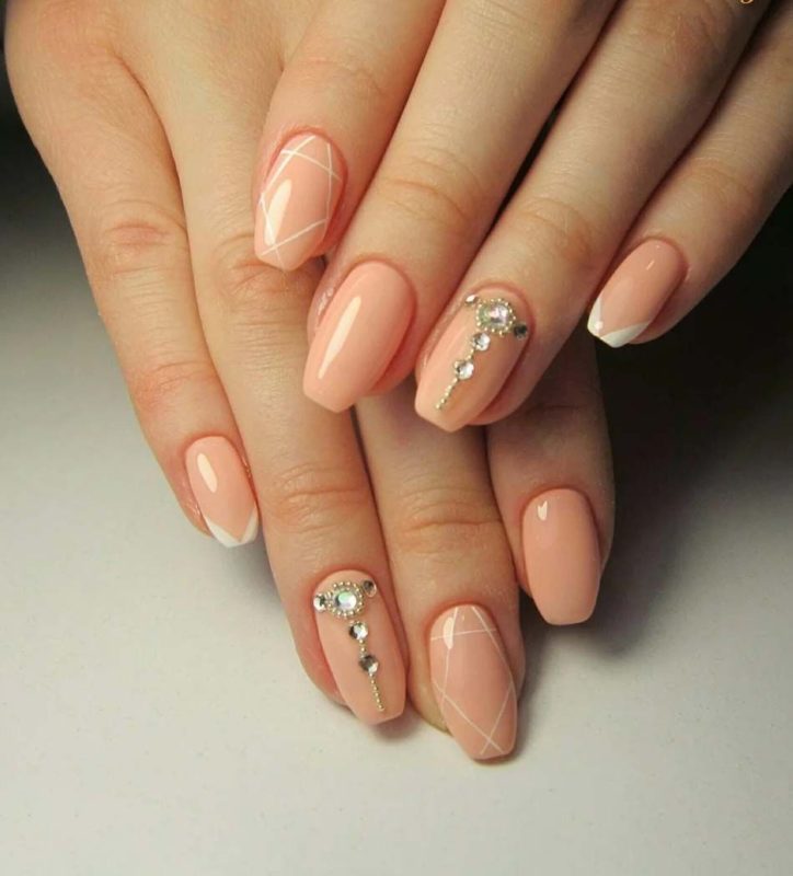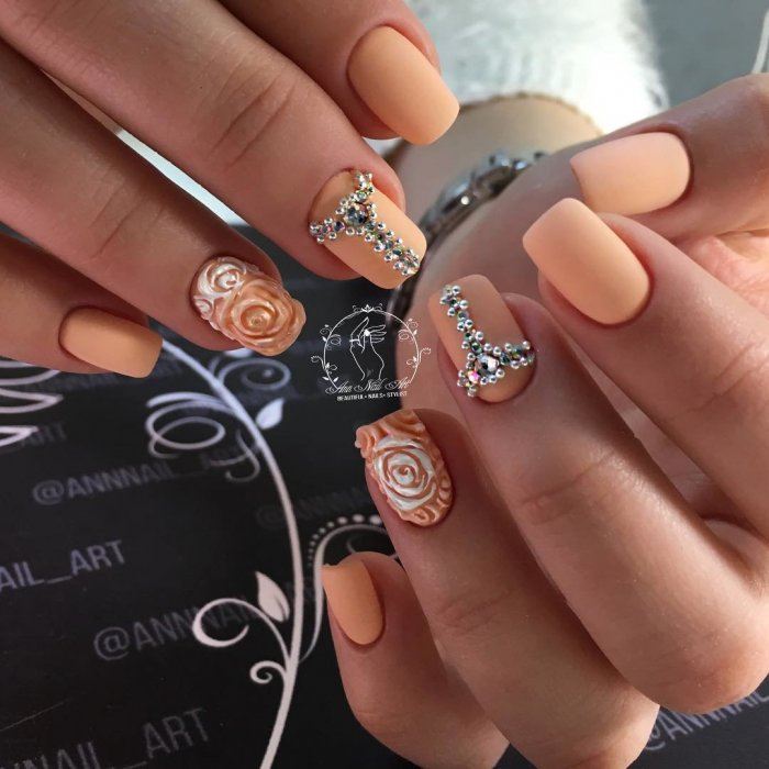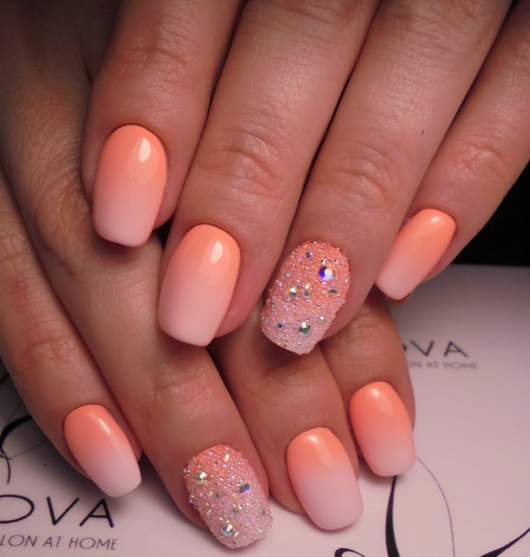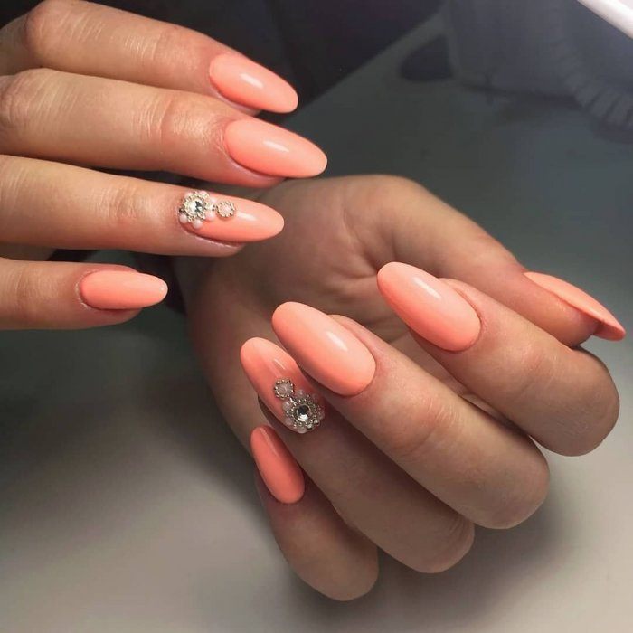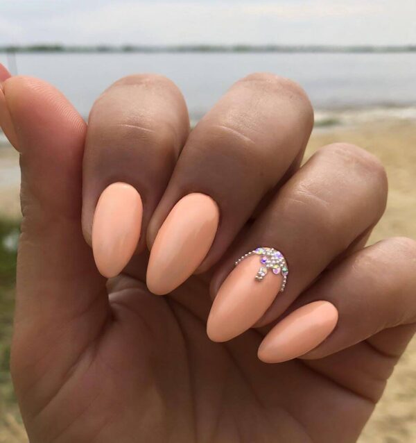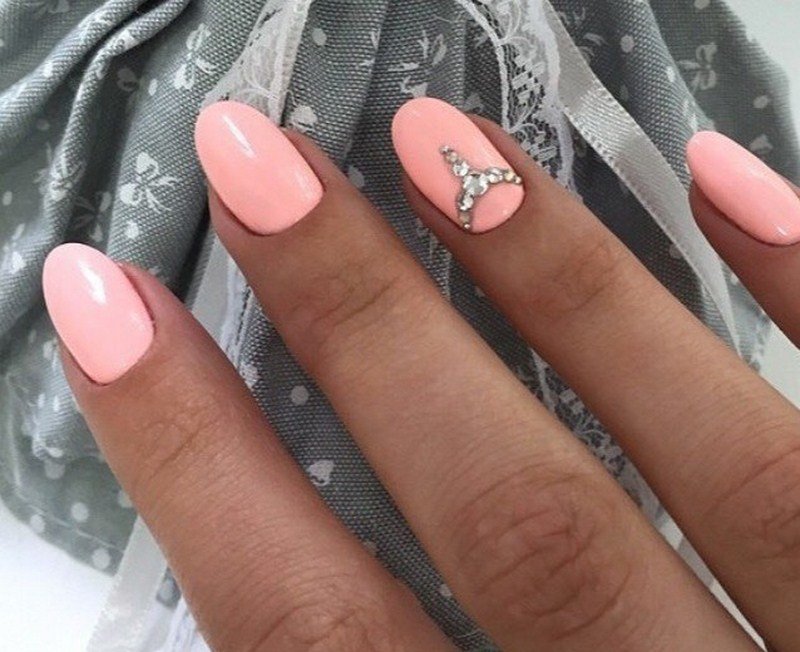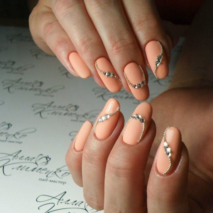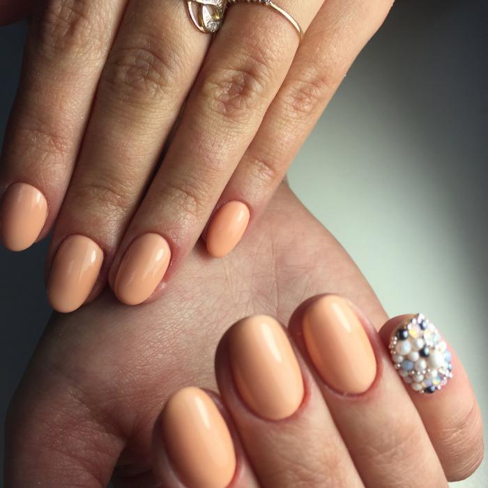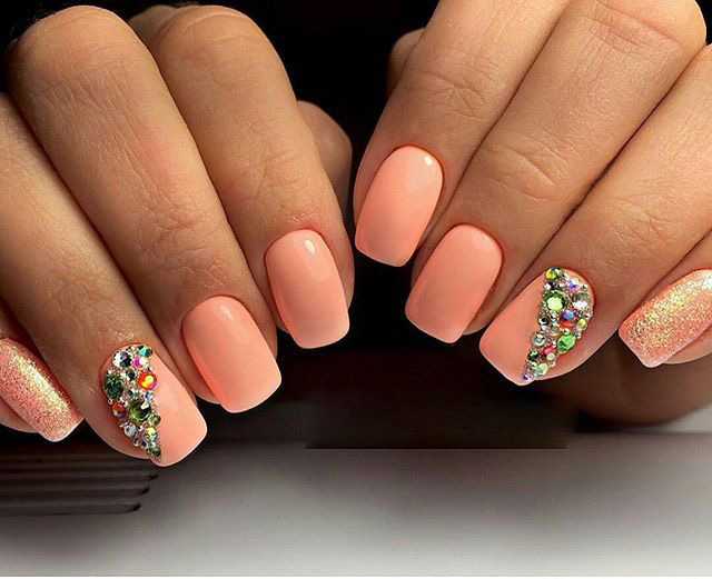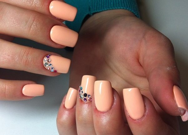 - Маникюр в персиковом цвете со стразами