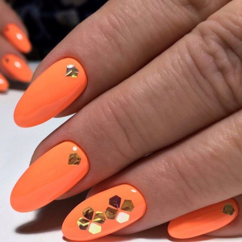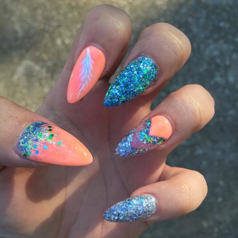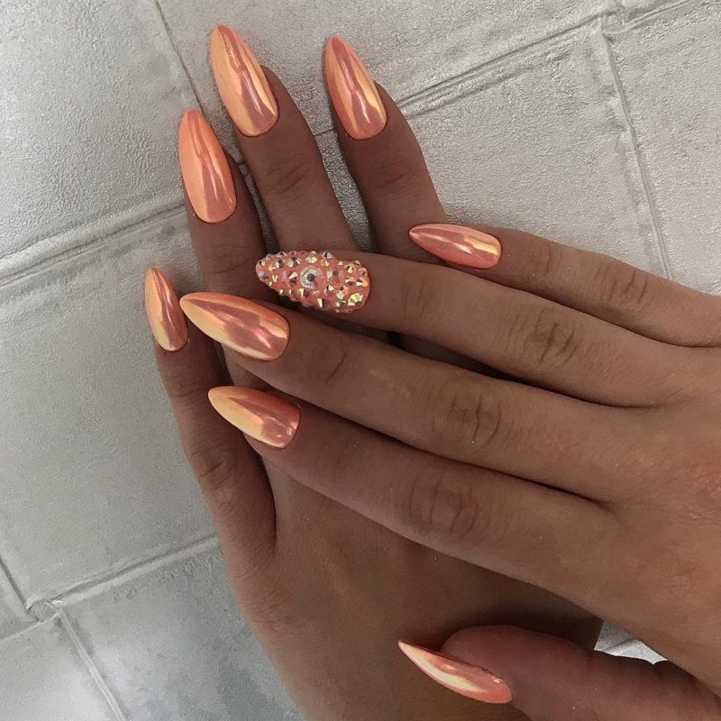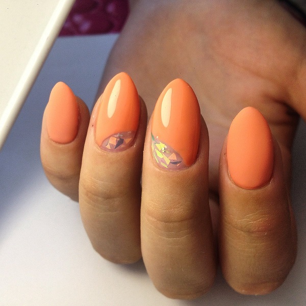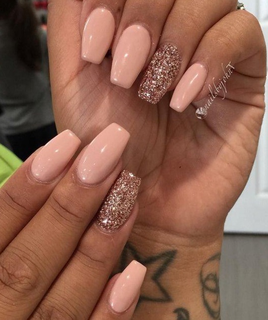 Блестки – еще один отличный вариант декорирования персикового маникюра. Как и со стразами, и с битым стеклом, блестки будут прекрасно смотреться на одном акцентном ногте. Блестки добавят праздника в ваш образ и, соответственно, в вашу жизнь. Маникюр с блестками – прекрасное решение на Новый год, День рождения и другие праздники.